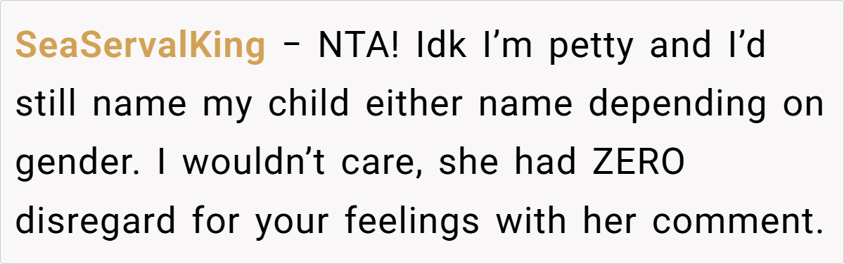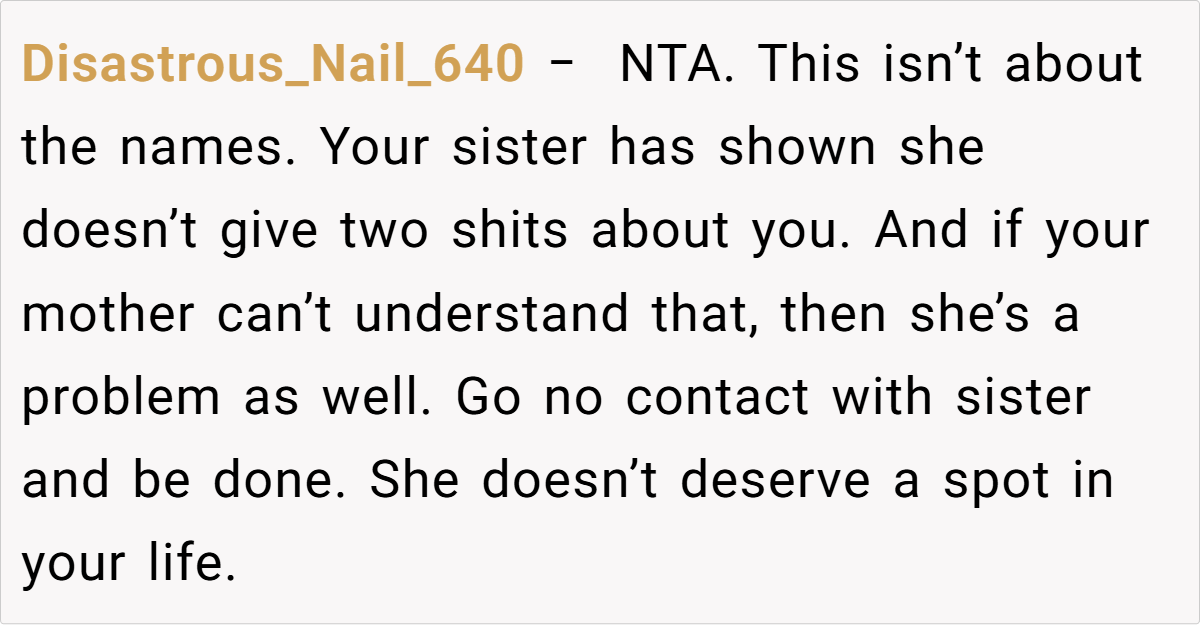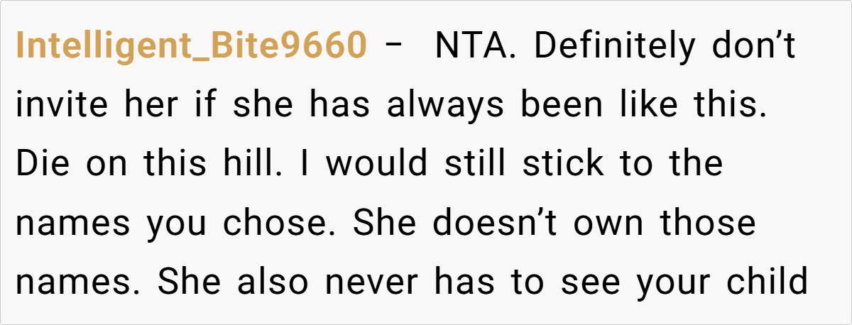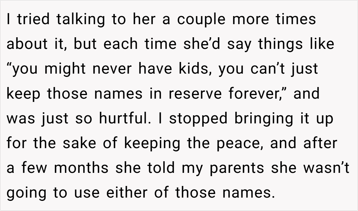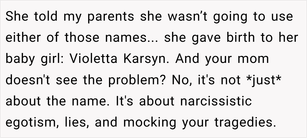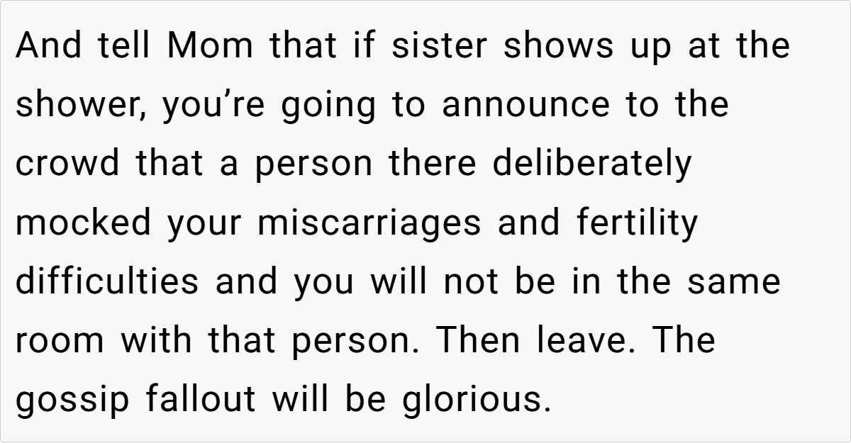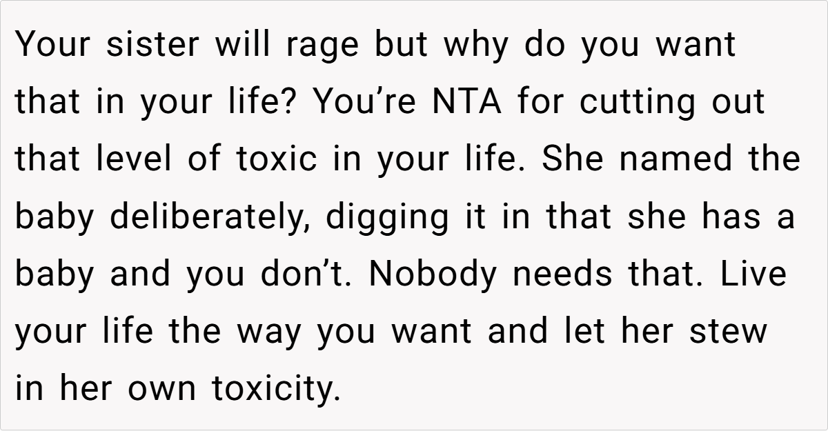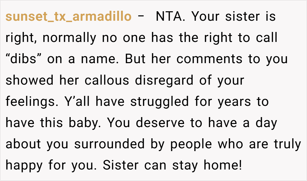 Her insight underscores that protecting oneself—especially after enduring repeated trauma—is a healthy and necessary step. In this case, the decision to exclude the sister from the baby shower reflects a need to safeguard one’s emotional space and honor the significance of what the names represent, rather than compromise on personal healing.