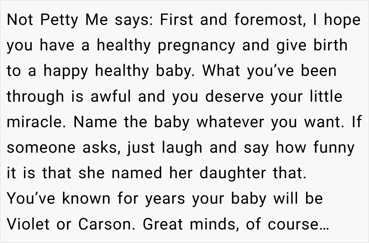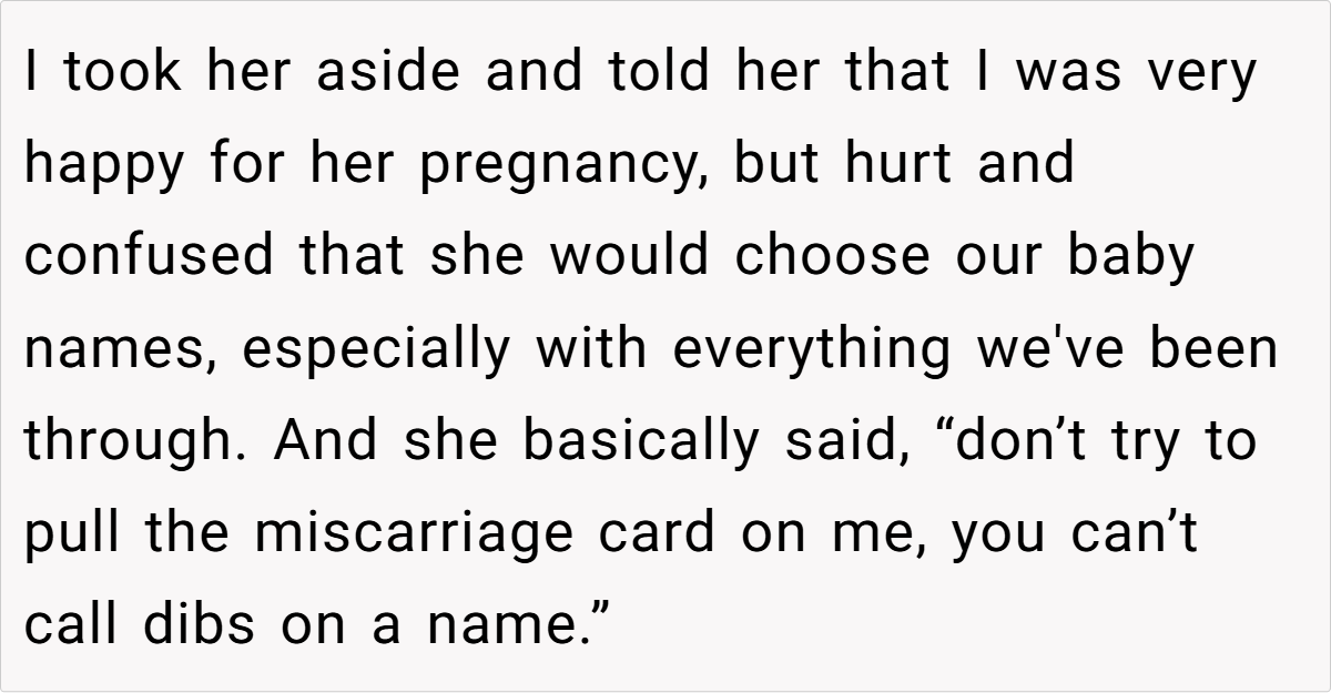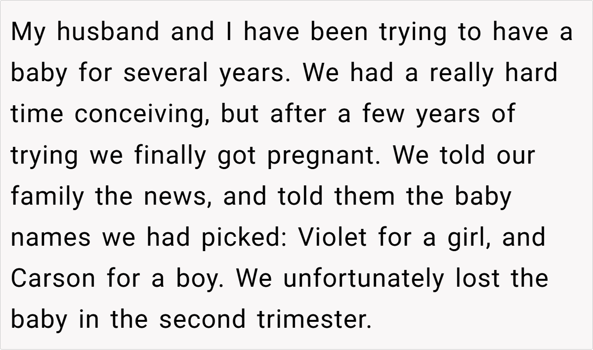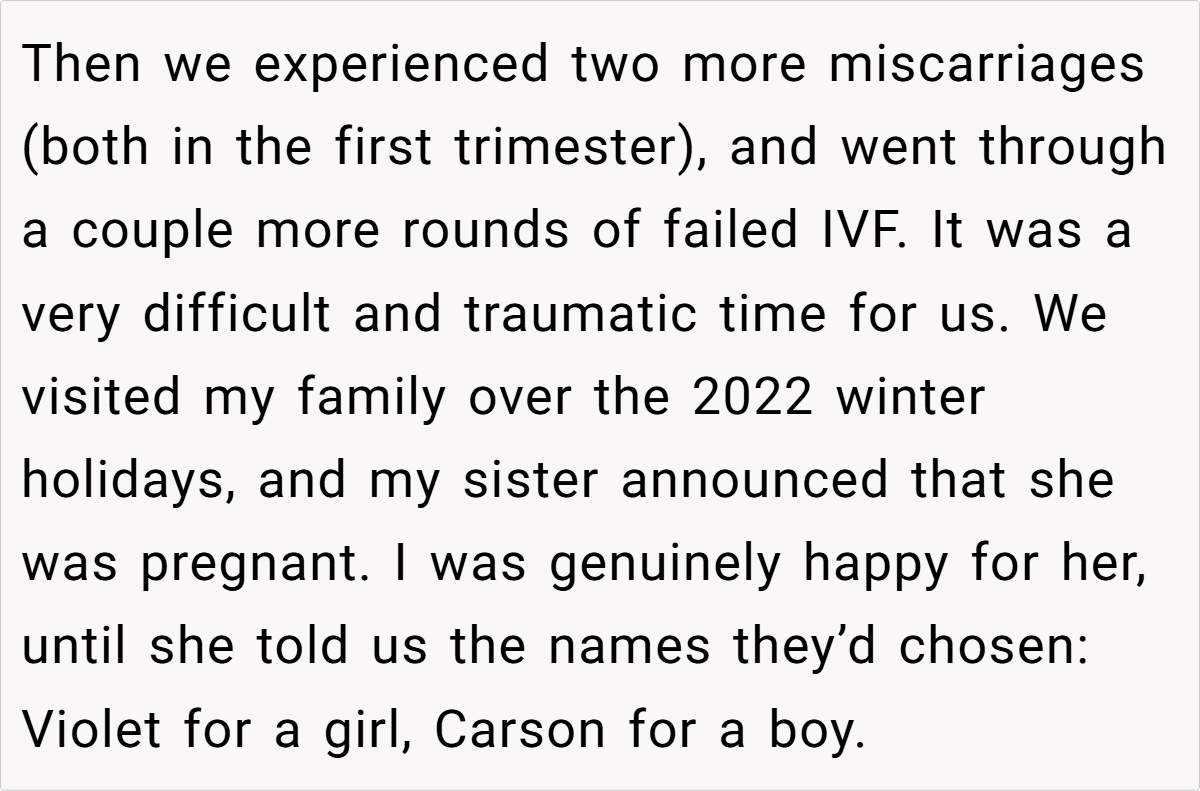 After years of heartache and numerous failed attempts to conceive, my partner and I finally received some hopeful news. We had even chosen our baby names—Violet for a girl and Carson for a boy—in anticipation of our long-awaited arrival. However, our joy turned bittersweet after enduring multiple miscarriages and failed IVF cycles. Then, during a family holiday, my sister announced her own pregnancy—and to my dismay, she chose the very same names we had selected. Her flippant, hurtful remarks about our losses and her insistence on “calling dibs” on the names left a deep emotional scar.
