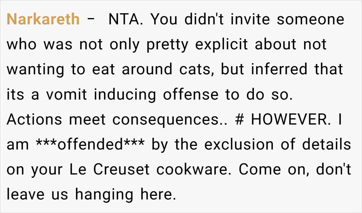 ‘AITA for not inviting someone for dinner because she made a big deal out of how she doesn’t eat at the homes of people who have cats?’