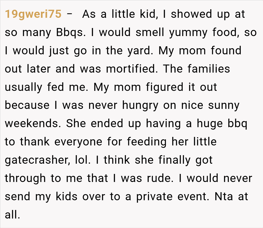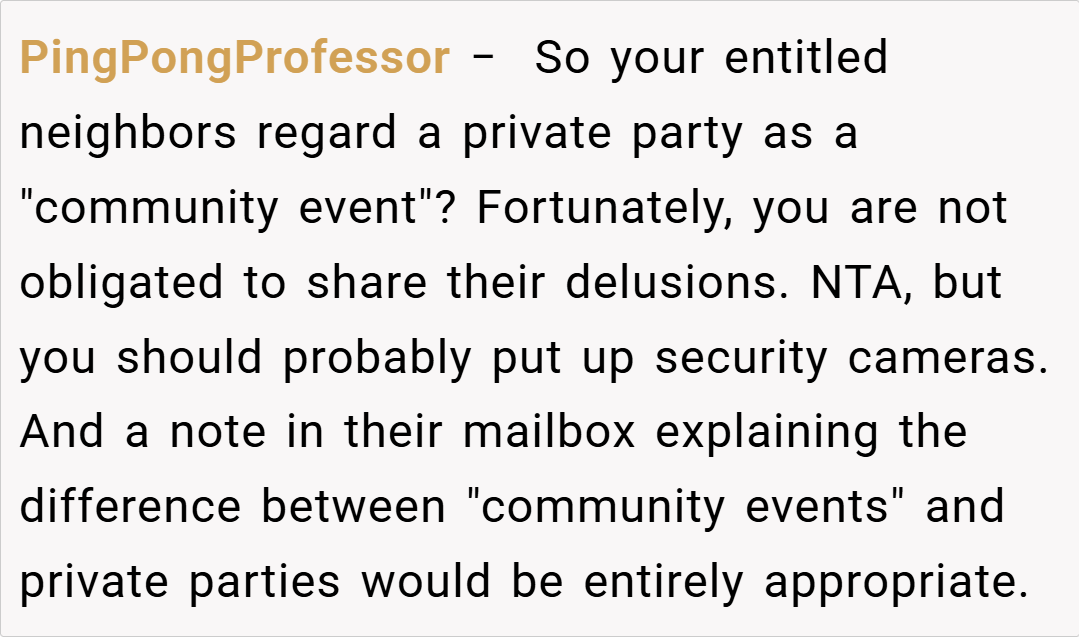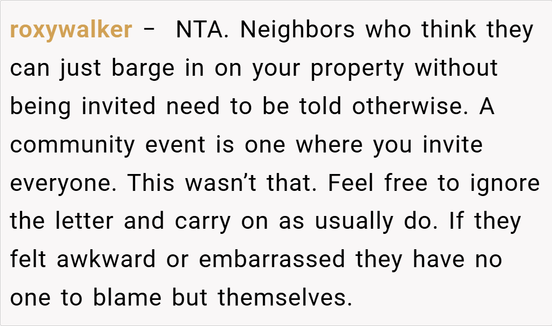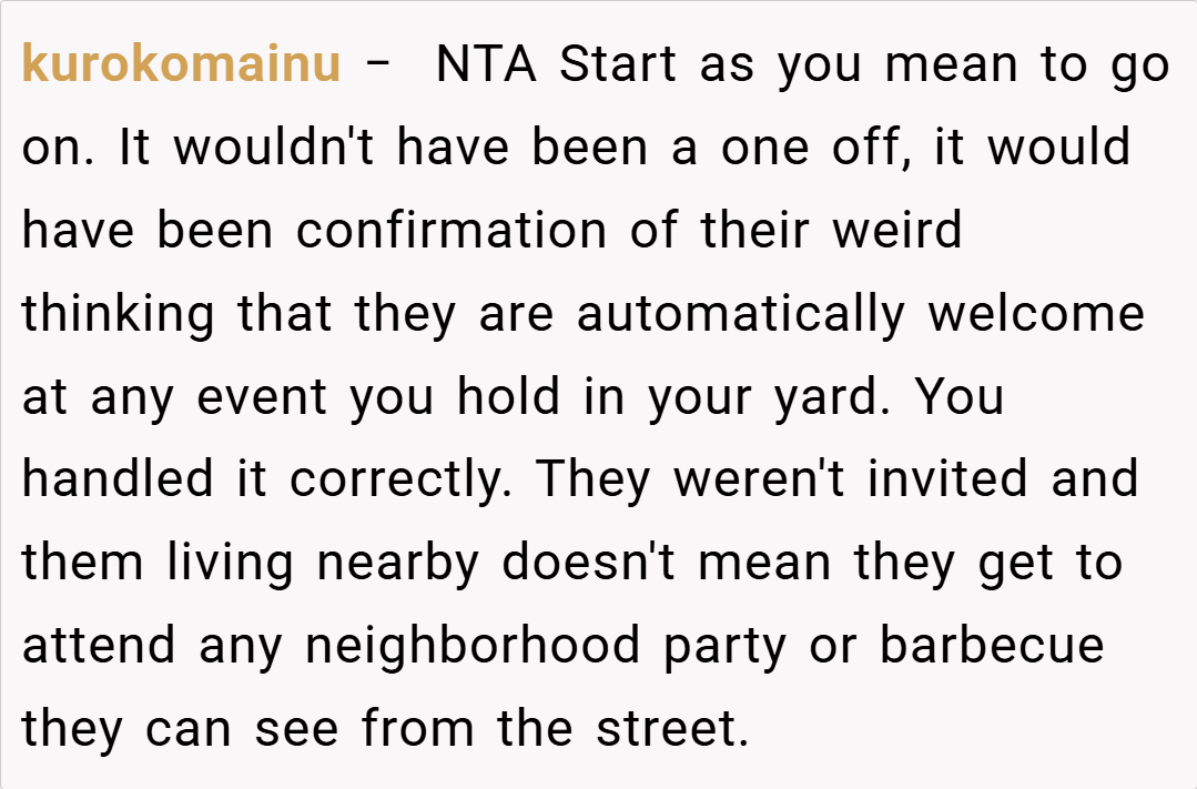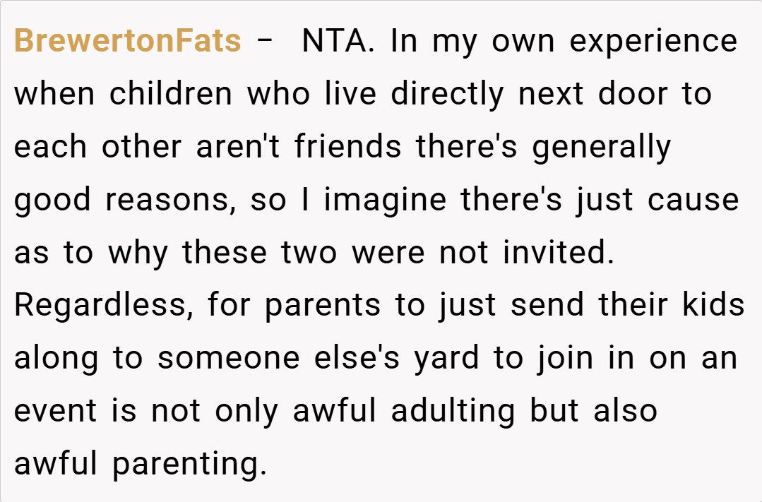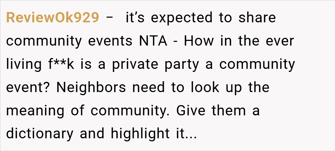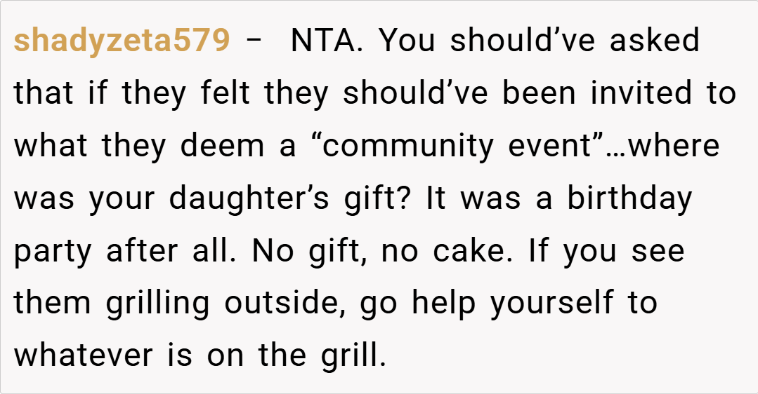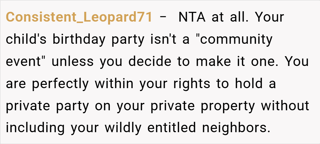 The Reddit community unanimously supports the host, emphasizing that the birthday party was a private event and not open to neighbors. They criticize the neighbors for showing up uninvited and stress that clear communication beforehand could have prevented the misunderstanding. Some comments are even humorous, suggesting that if the party was considered an “open house,” the guest list might need a serious rethinking.
