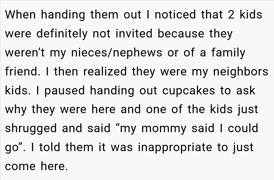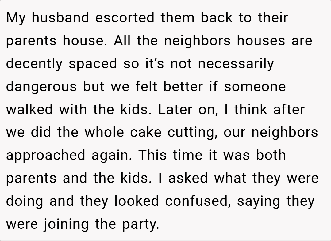 In this story, a parent finds themselves in a sticky situation when neighbors’ children crash their daughter’s birthday party. The host’s decision to firmly escort the kids away sparks a heated debate about what constitutes a “community event” versus a private celebration. This incident not only raises questions about neighborly etiquette but also ignites a broader discussion about the rights of hosts to control their own space and celebrations.