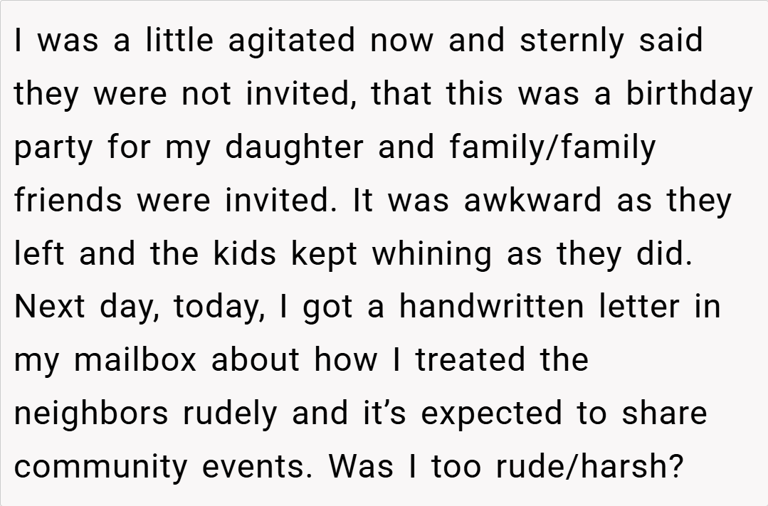 AITA For Not Inviting The Neighbors To Our Daughter’s Bday Party And Then Awkwardly Kicking Them Out?