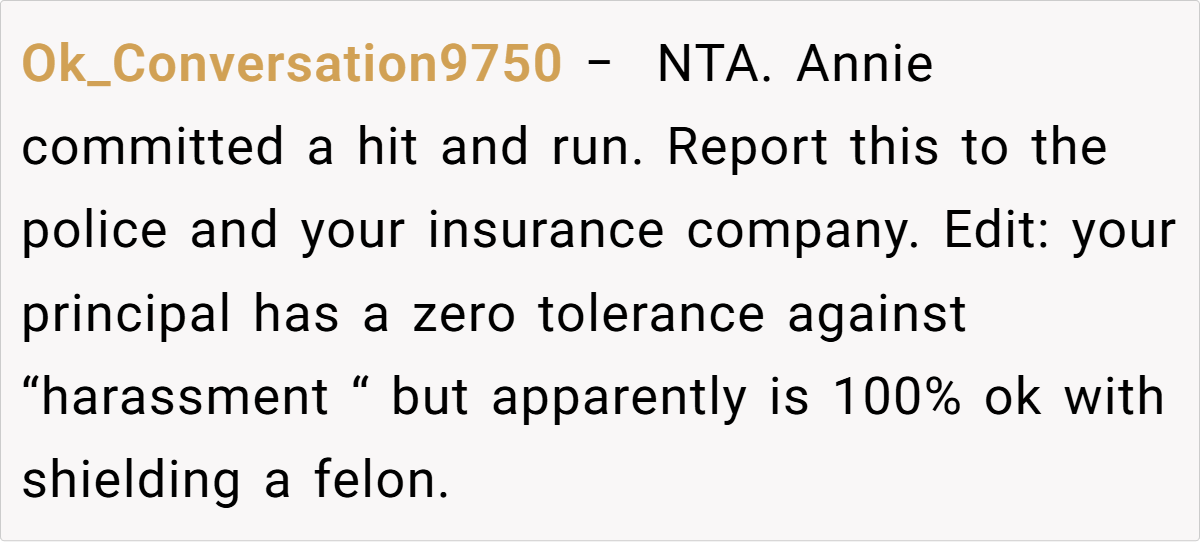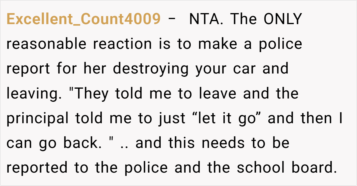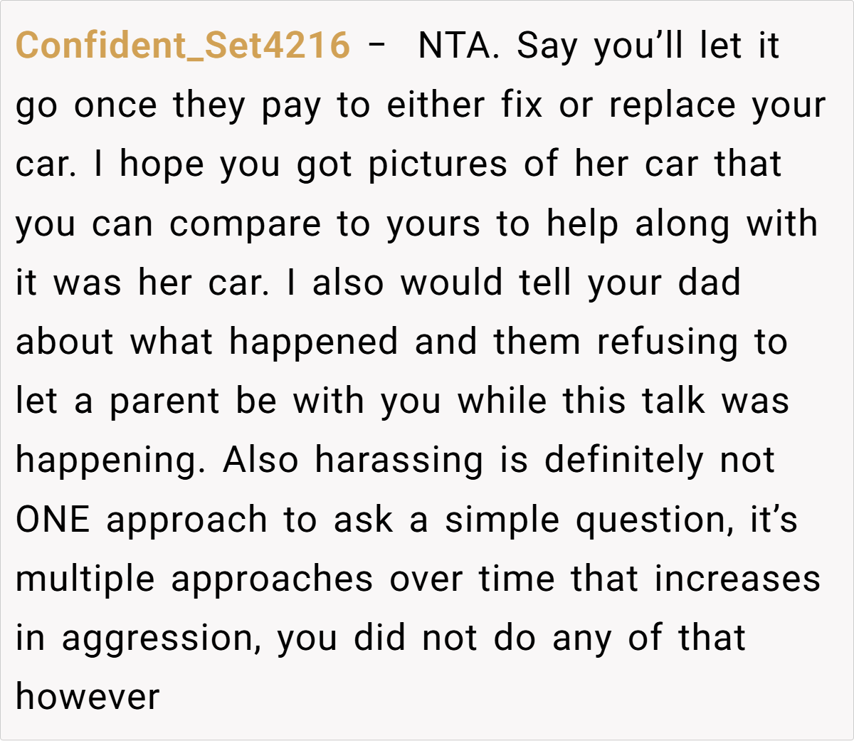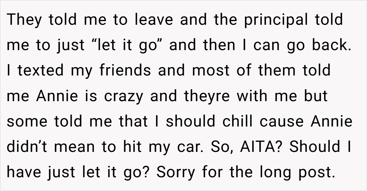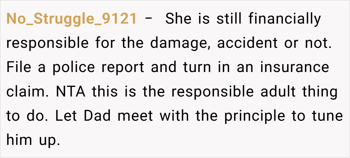 Many redditors sympathize with the narrator, arguing that when someone’s property is damaged, it’s natural to demand accountability and not simply “let it go.” They commend his determination to seek the truth. However, others caution that his approach may have crossed a line, particularly when his actions led to accusations of harassment and suspension at school. The discussion reflects a tension between the desire for justice and the need for a calm, measured response in emotionally charged situations.