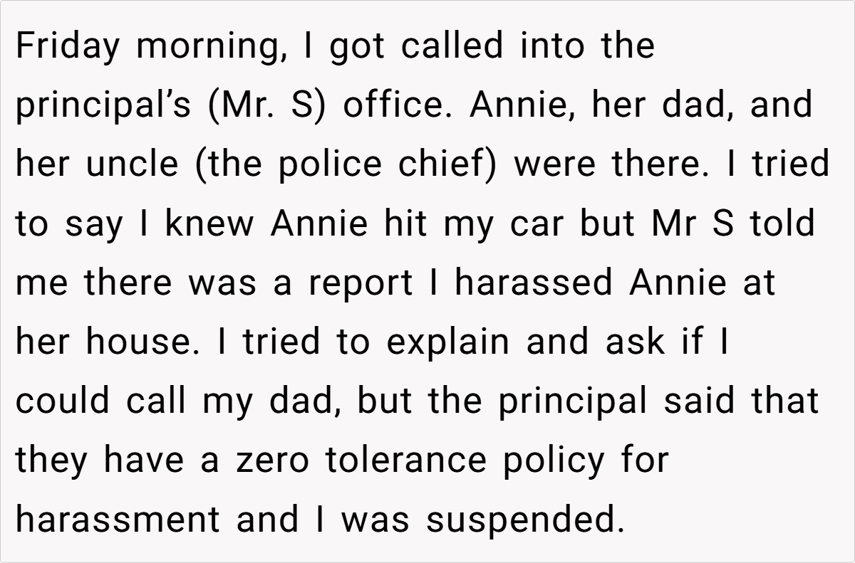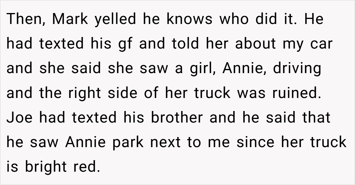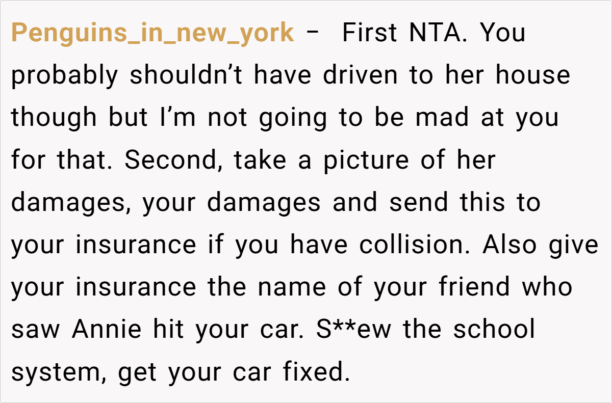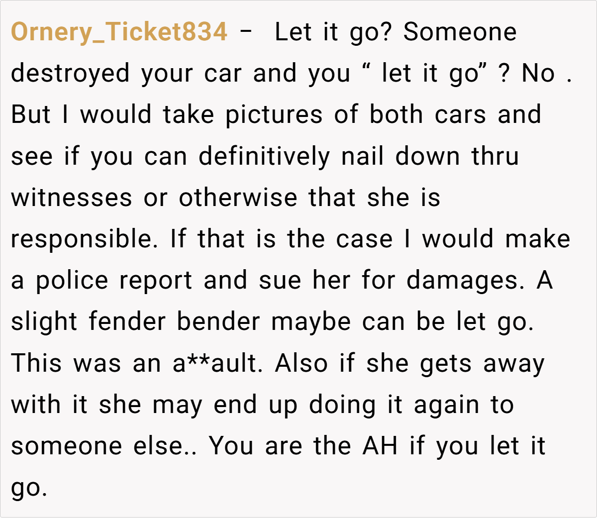 Many redditors sympathize with the narrator, arguing that when someone’s property is damaged, it’s natural to demand accountability and not simply “let it go.” They commend his determination to seek the truth. However, others caution that his approach may have crossed a line, particularly when his actions led to accusations of harassment and suspension at school. The discussion reflects a tension between the desire for justice and the need for a calm, measured response in emotionally charged situations.