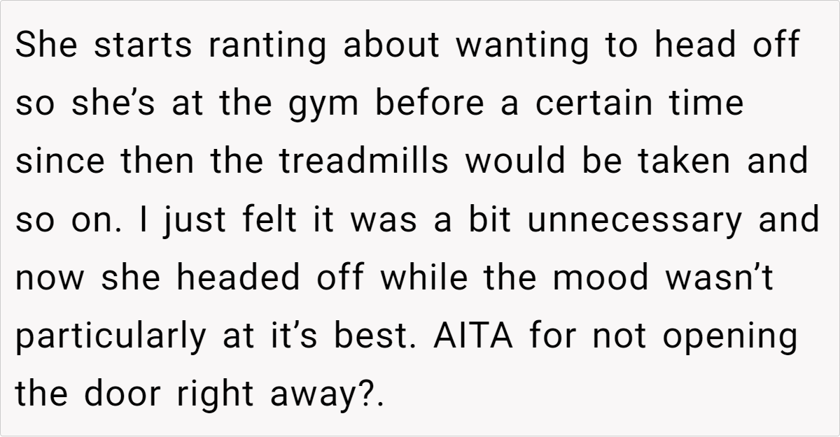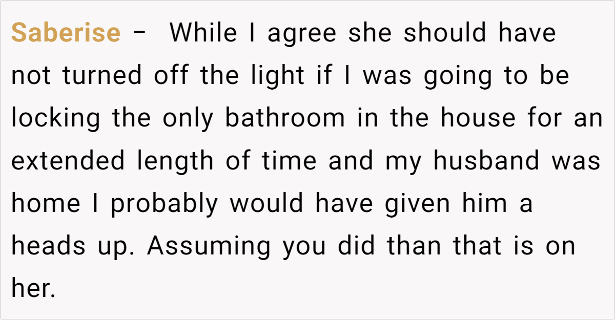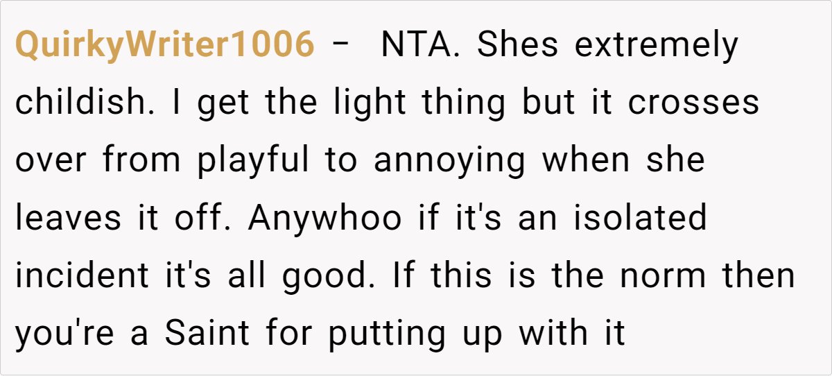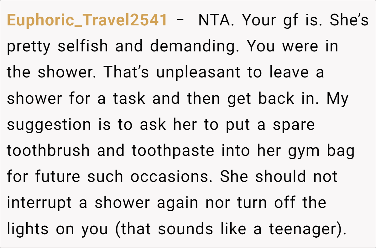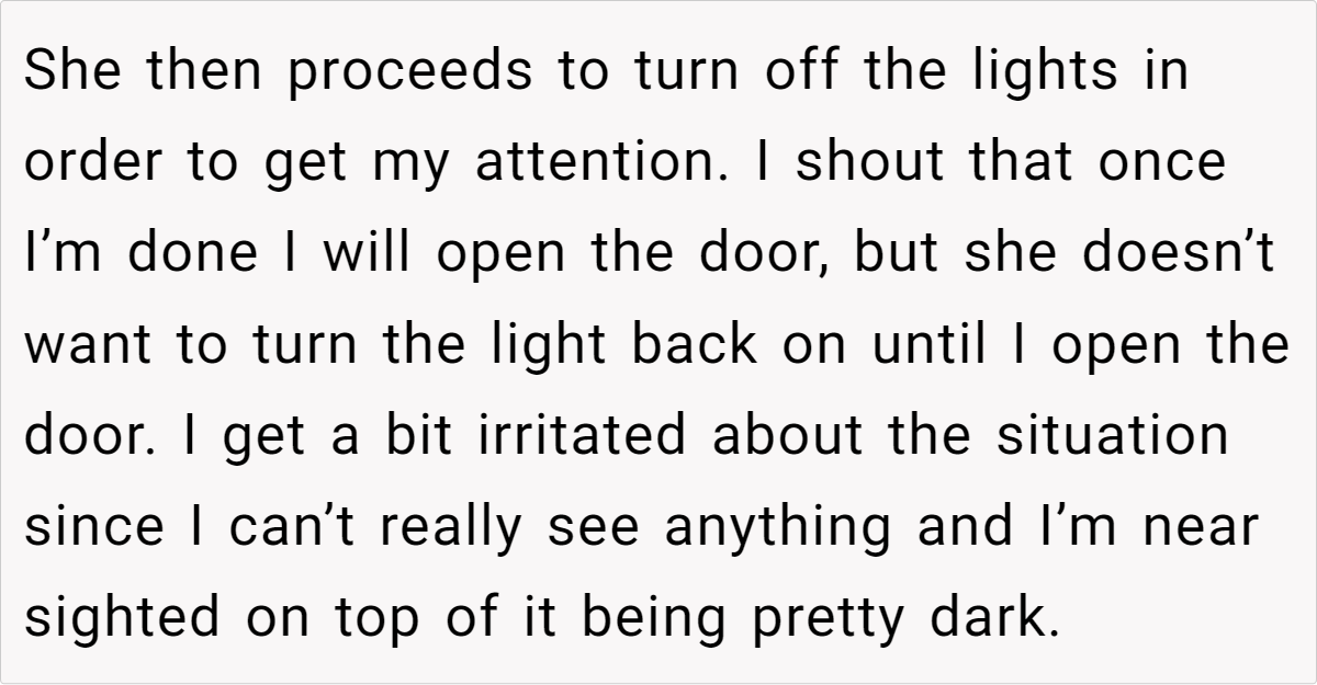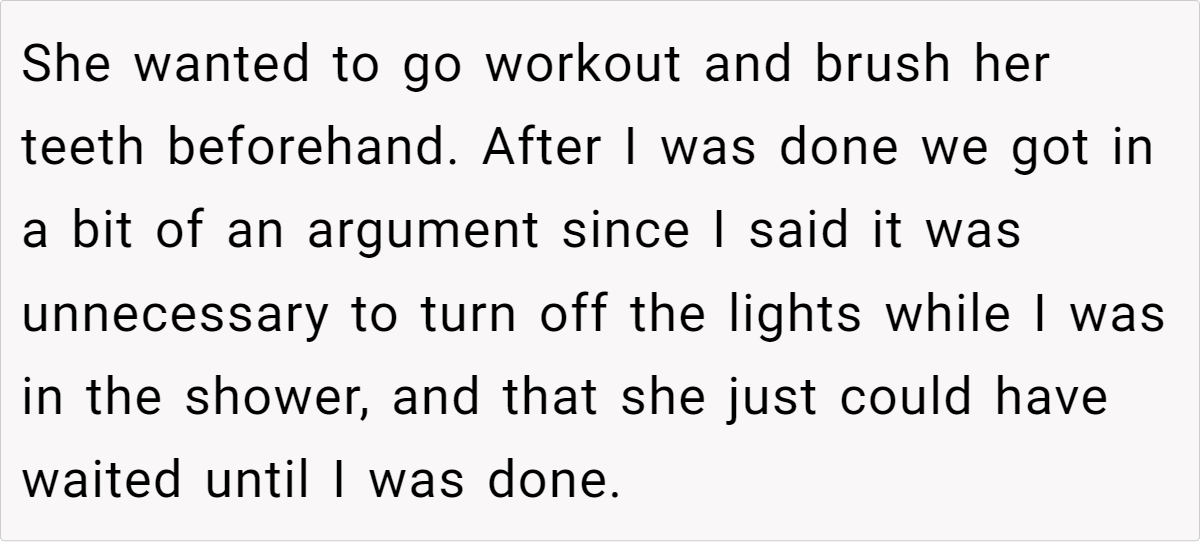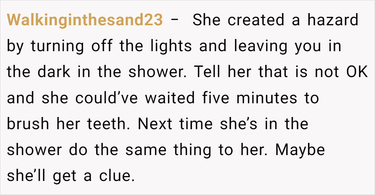 Maybe she wants that prime treadmill at the gym, and a narrow time slot can make or break a good workout routine. On the other hand, turning off the lights to force attention is not exactly the textbook definition of respectful problem-solving. For the OP, showering without light—especially while near-sighted—felt unsettling, if not downright dangerous.