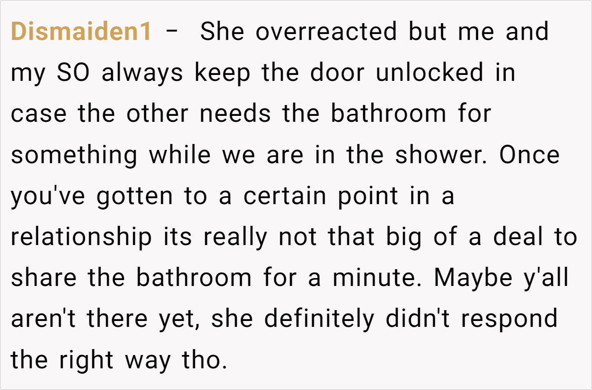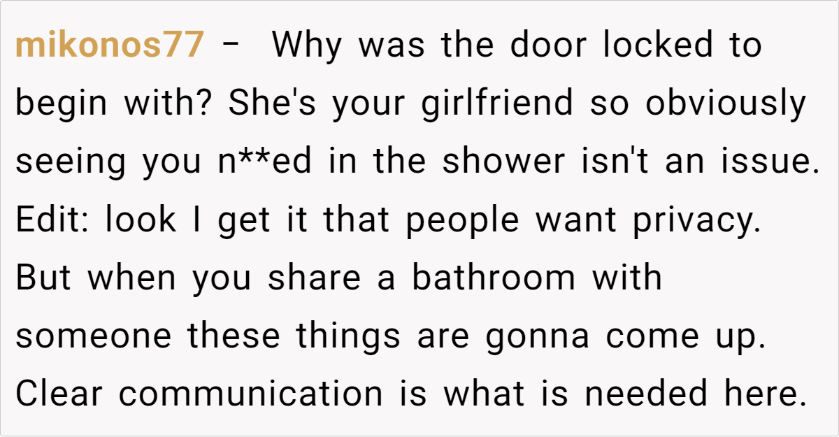 In this story, we see a clash between one partner’s need for immediate access (to brush her teeth and rush off to the gym) and the other’s desire to complete a shower in peace. On the one hand, her urgency is somewhat understandable.