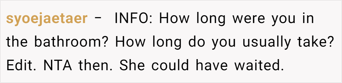 Now let’s keep the conversation flowing: How would you handle this bathroom dilemma, and have you ever experienced a small incident that escalated into a bigger-than-expected argument? Share your thoughts, experiences, and any clever tips—because everyone’s morning routine could use a little more peace.