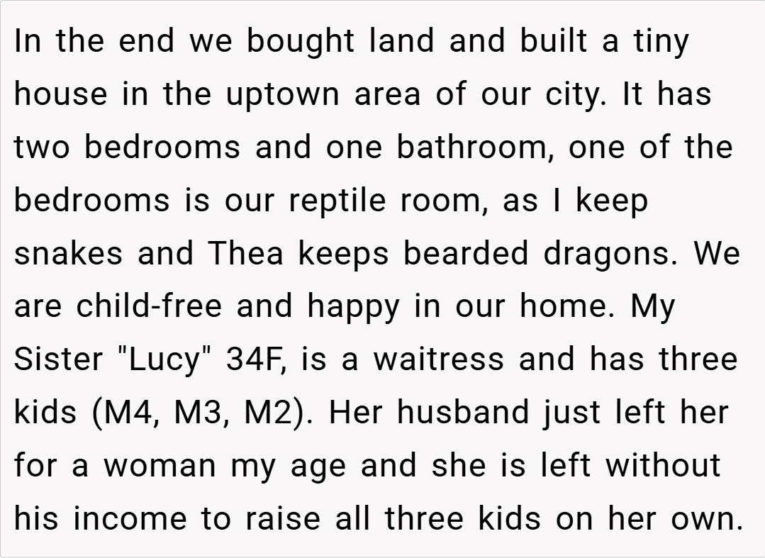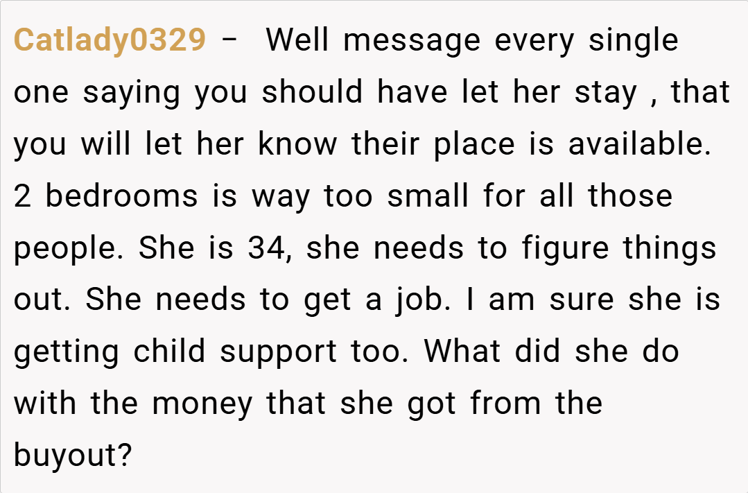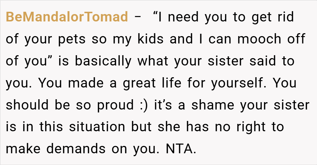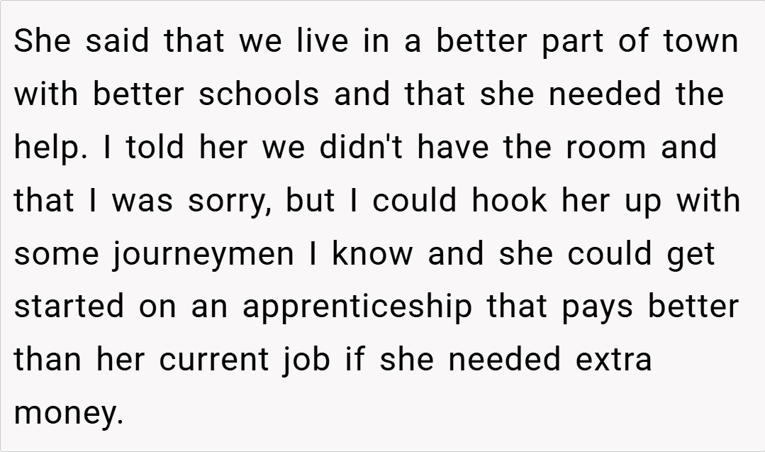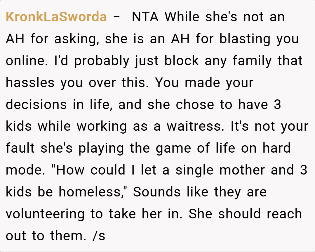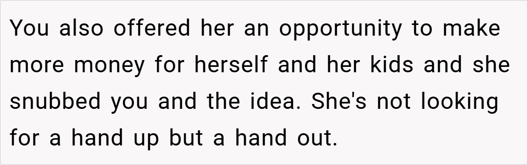 Ultimately, the decision to decline the request isn’t made out of cruelty but out of a necessity to protect a personal haven—one where success, peace, and the freedom to live life on one’s own terms are paramount. By setting such boundaries, the narrator is not denying family love; she is simply insisting that every member must take responsibility for their own path, ensuring that her hard-fought progress remains intact.