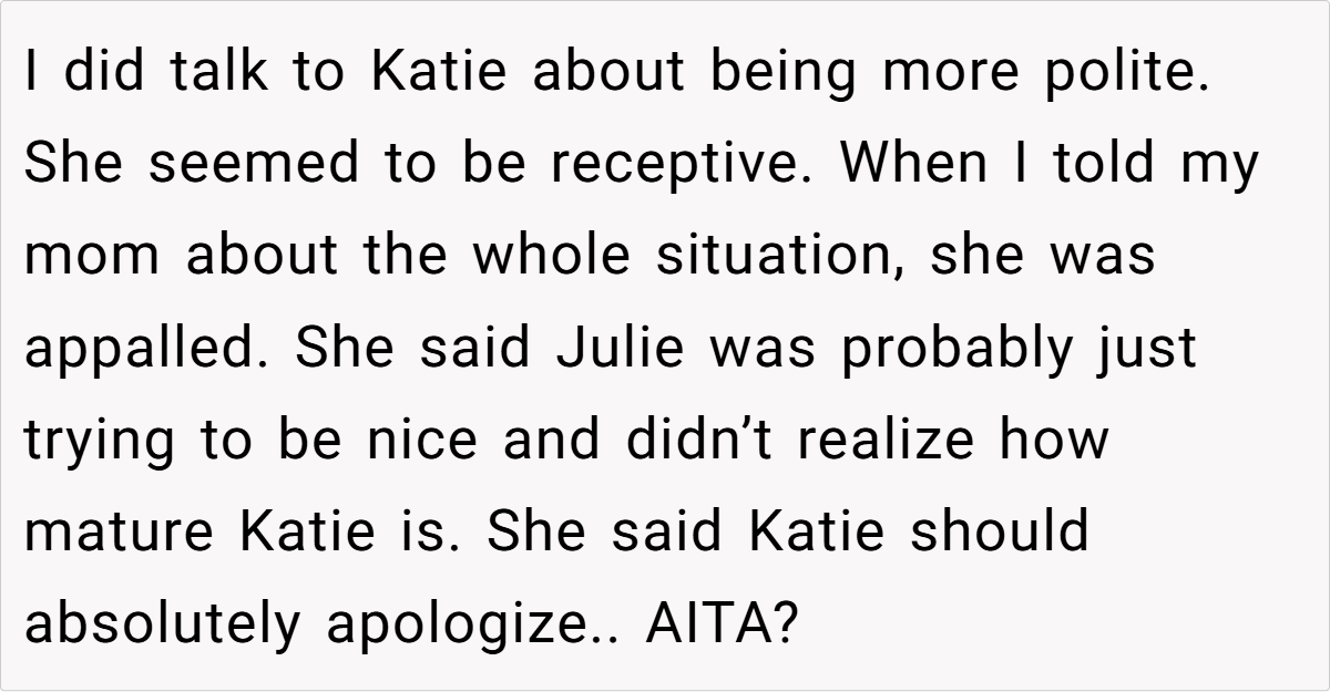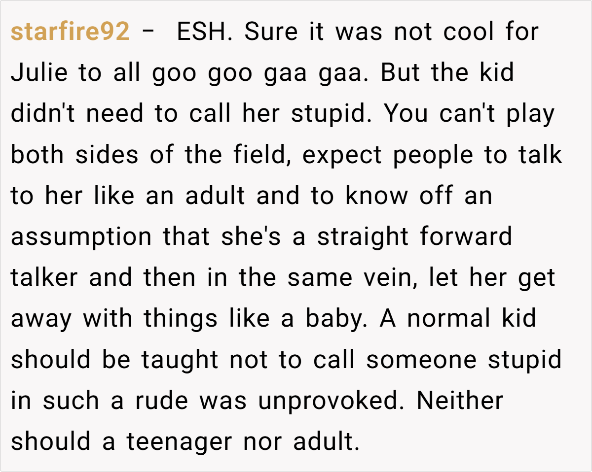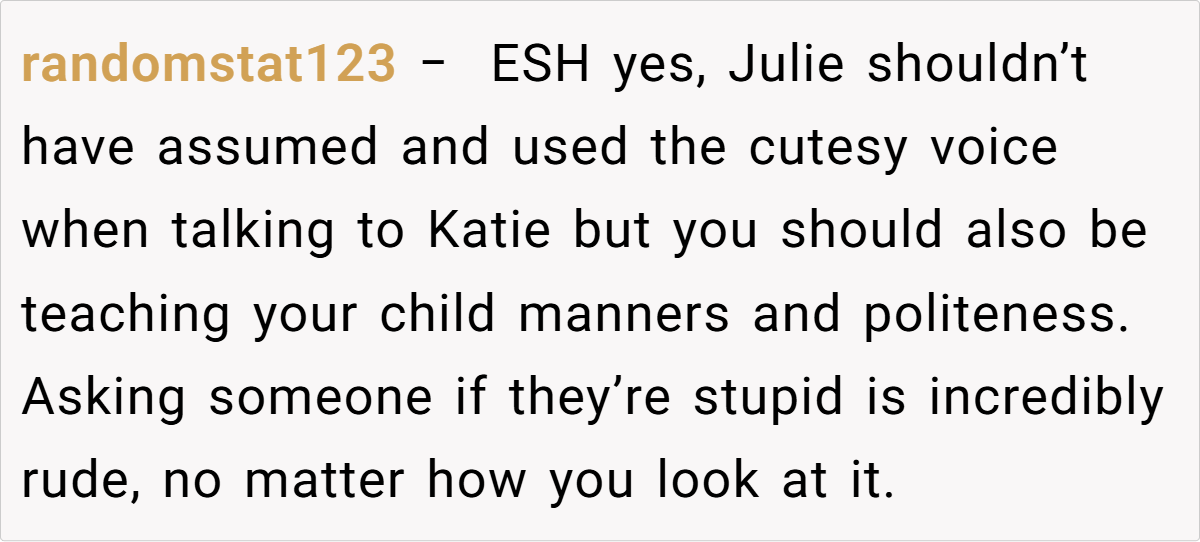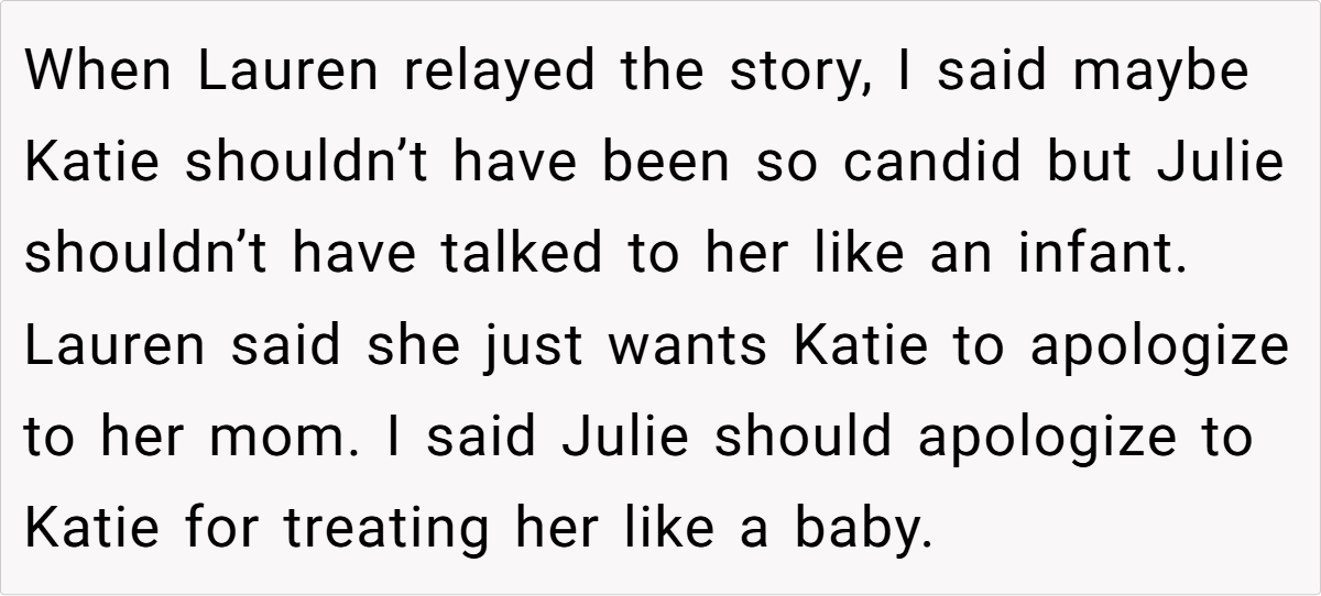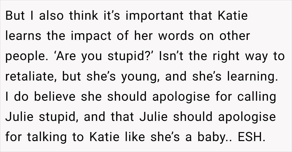The Reddit community offered a range of perspectives on the incident. In summary, many appreciated Katie’s candid honesty while also emphasizing the importance of respectful communication. Some redditors noted that both Julie’s baby talk and Katie’s blunt response had their drawbacks, suggesting that this was a valuable learning moment for all parties involved. Overall, the general sentiment was that the incident serves as a reminder of the challenges in balancing affection with respect in family dynamics.