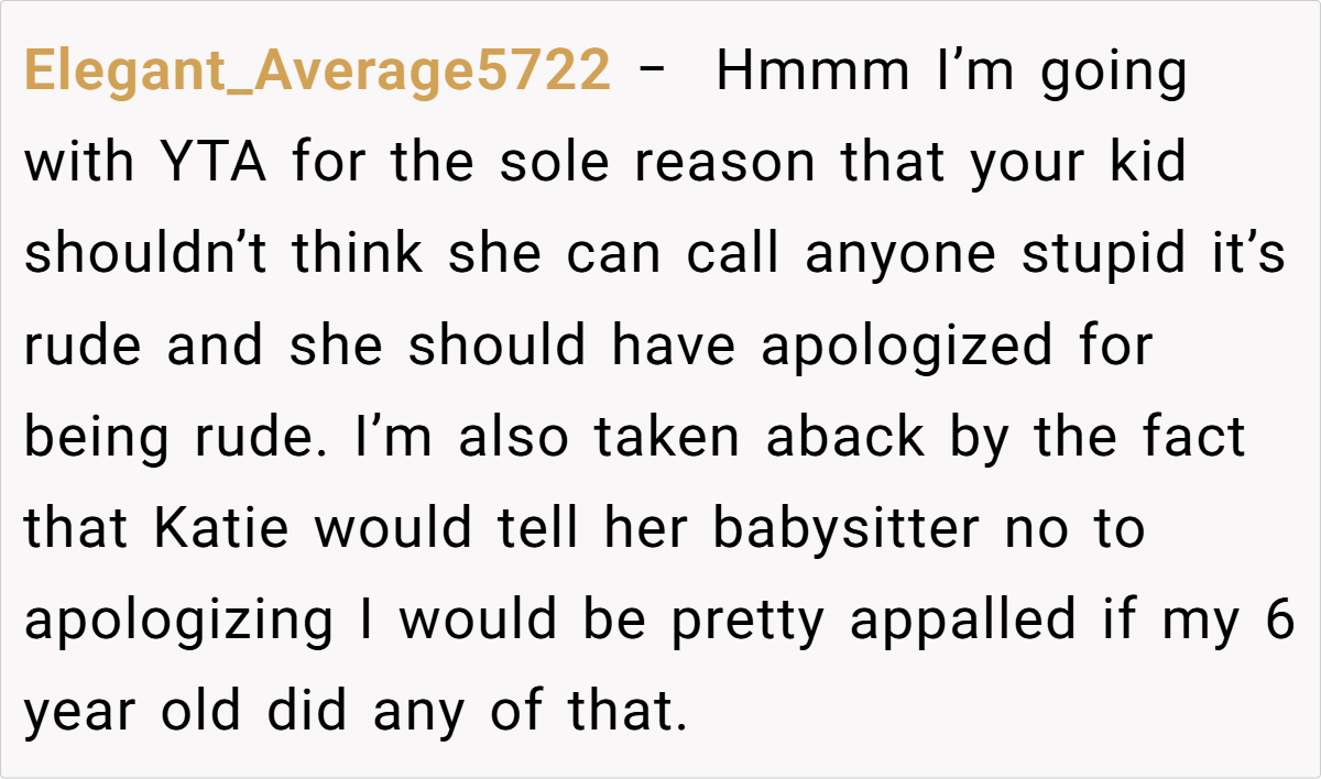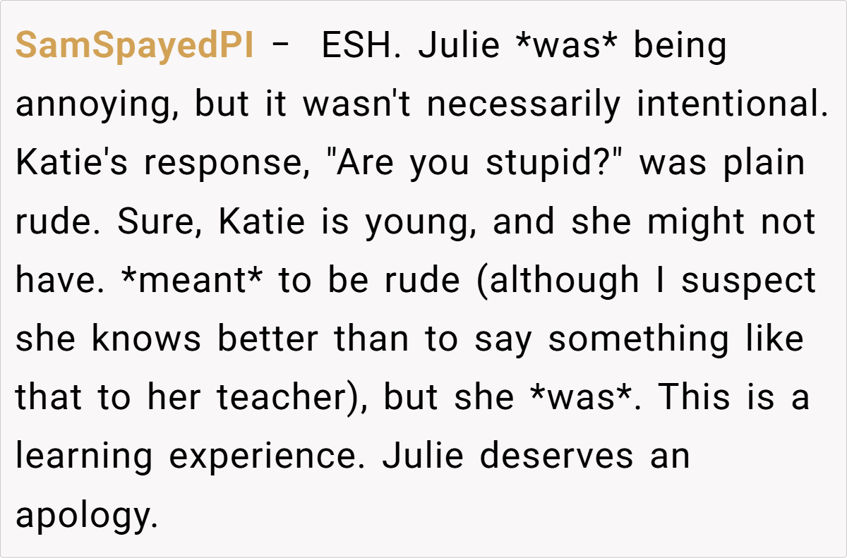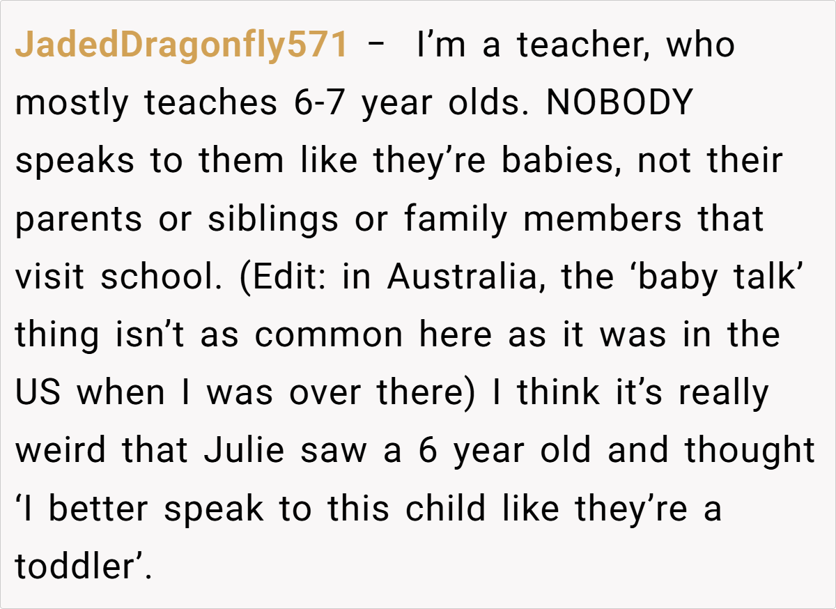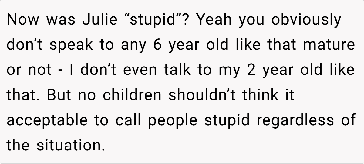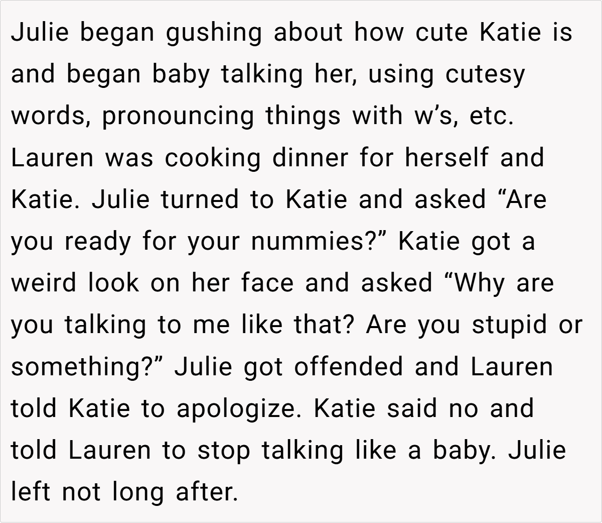 The Reddit community offered a range of perspectives on the incident. In summary, many appreciated Katie’s candid honesty while also emphasizing the importance of respectful communication. Some redditors noted that both Julie’s baby talk and Katie’s blunt response had their drawbacks, suggesting that this was a valuable learning moment for all parties involved. Overall, the general sentiment was that the incident serves as a reminder of the challenges in balancing affection with respect in family dynamics.