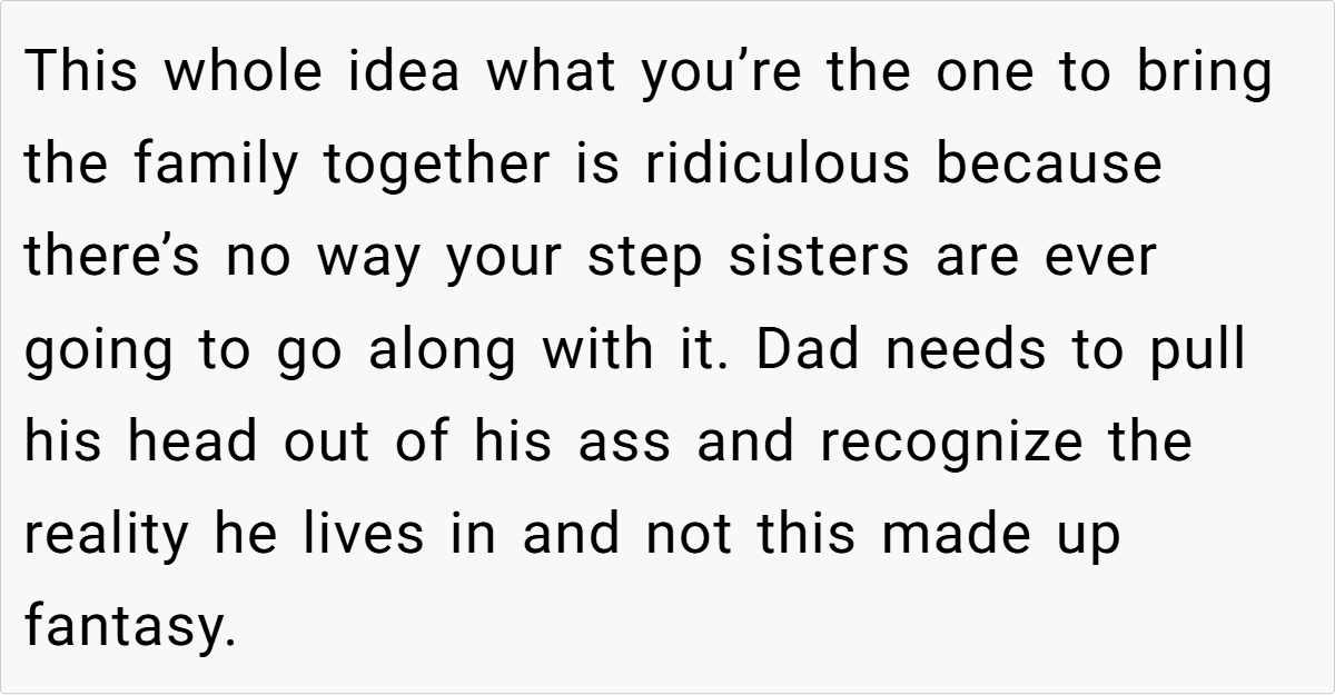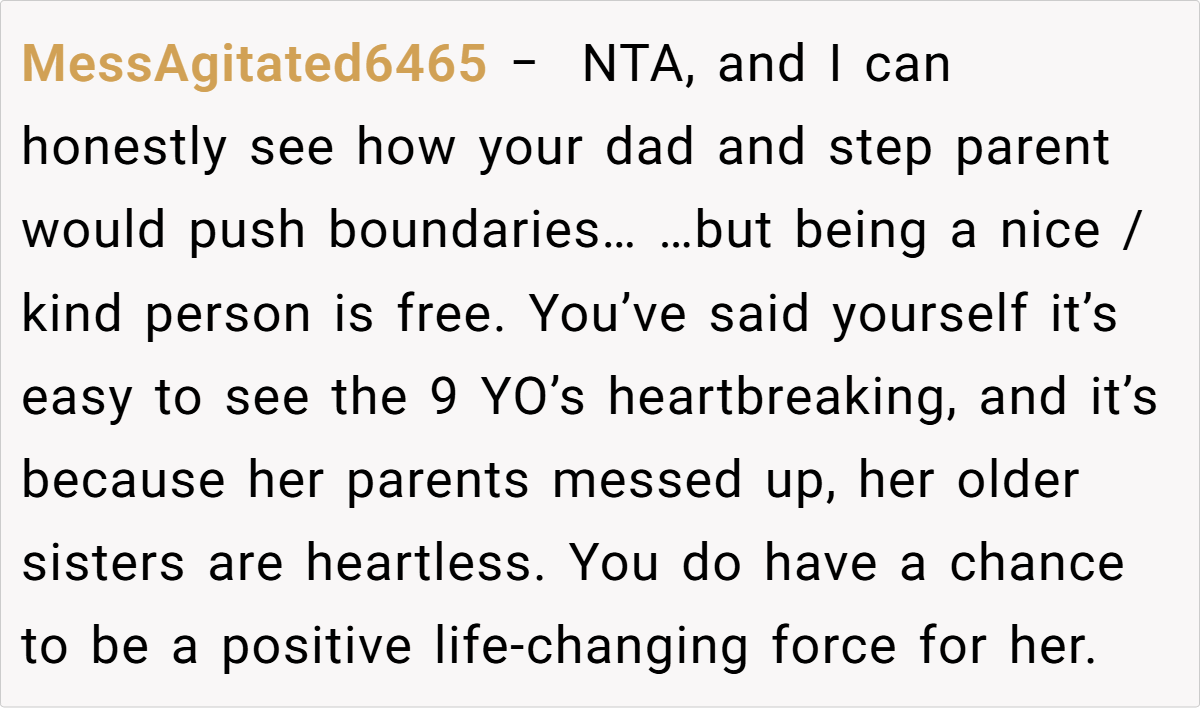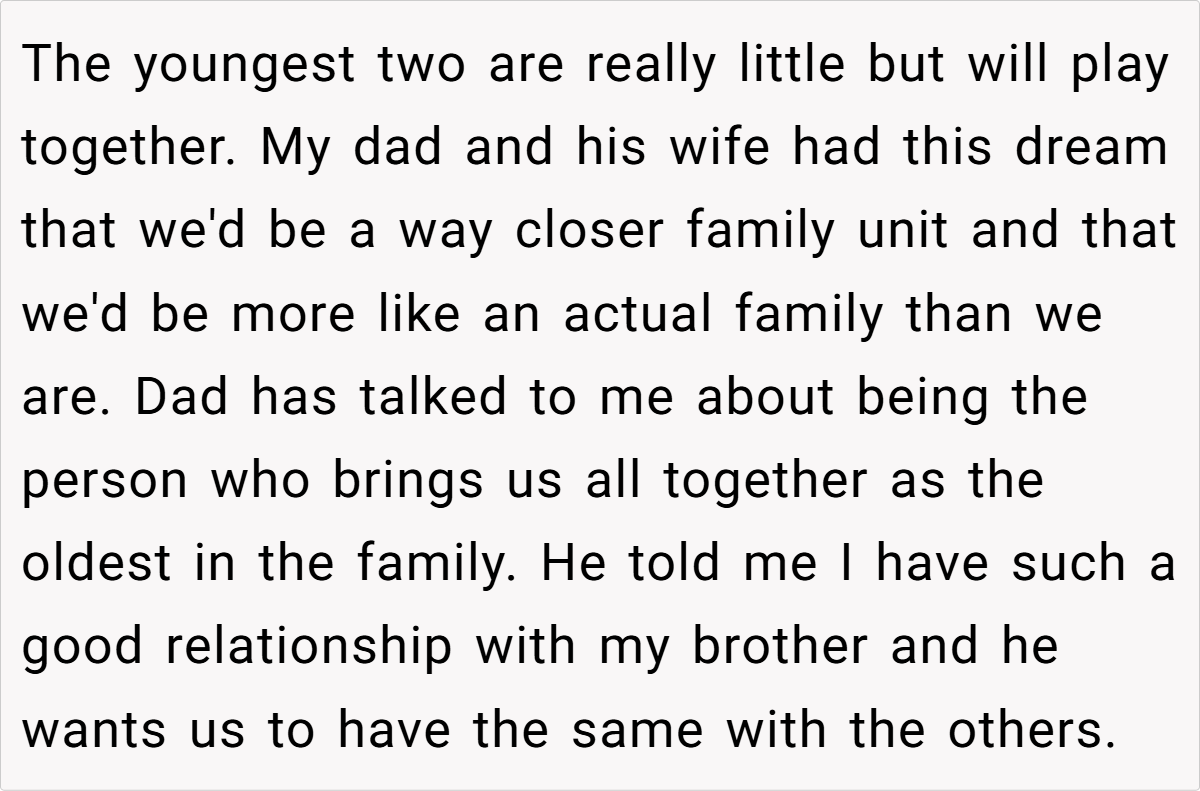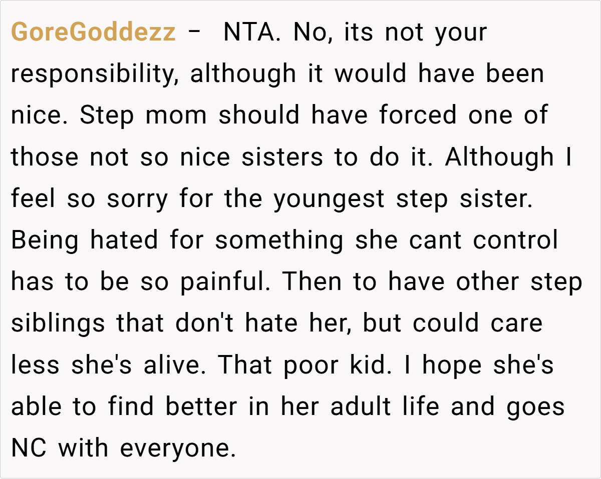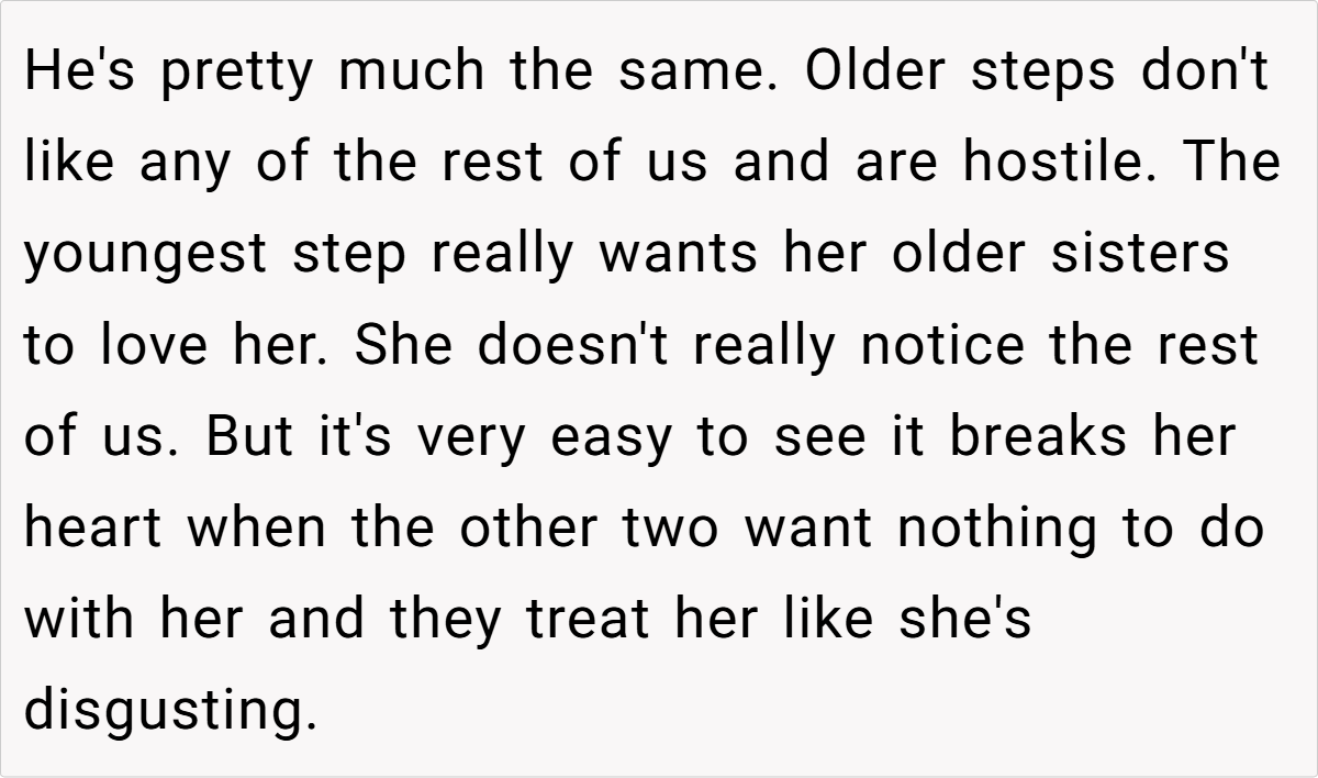 Others note that forcing siblings to bond often adds pressure and conflict. Overall, most agree the OP is not wrong but encourage a bit of compassion, as the youngest stepsister remains an innocent child caught in a complicated family dynamic.