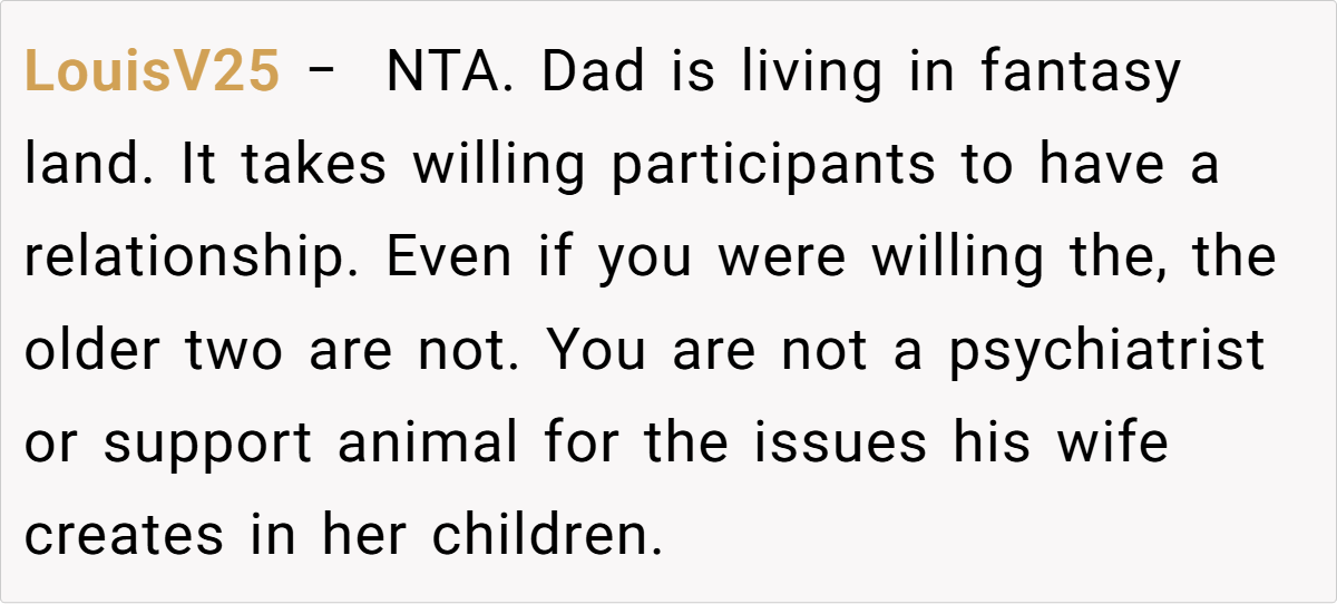 The father’s expectation that his son should act as a mediator or caretaker for all siblings may be unrealistic given the existing tensions between them. Dr. Orbuch emphasizes that “forcing relationships can lead to resentment rather than unity.” It is essential for parents in blended families to recognize these complexities and manage expectations accordingly.