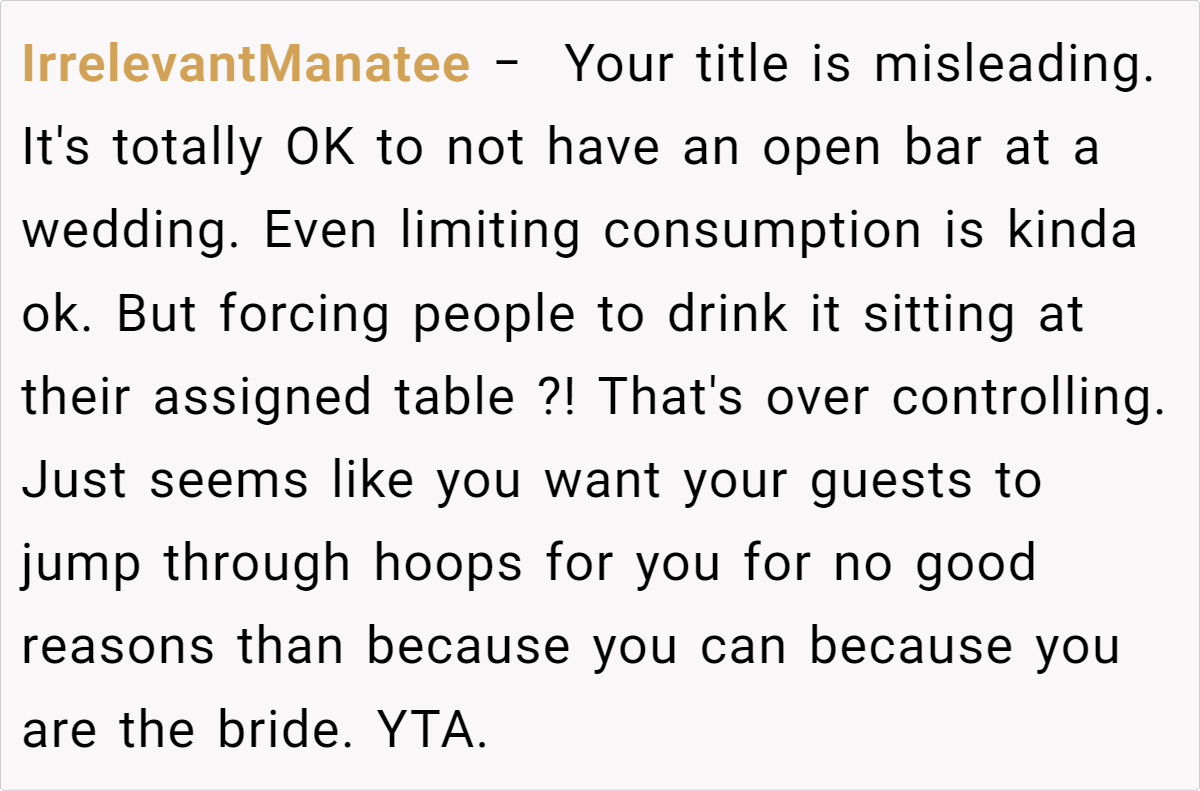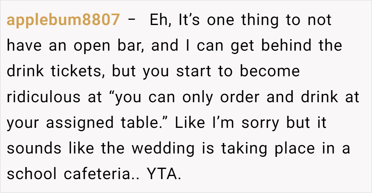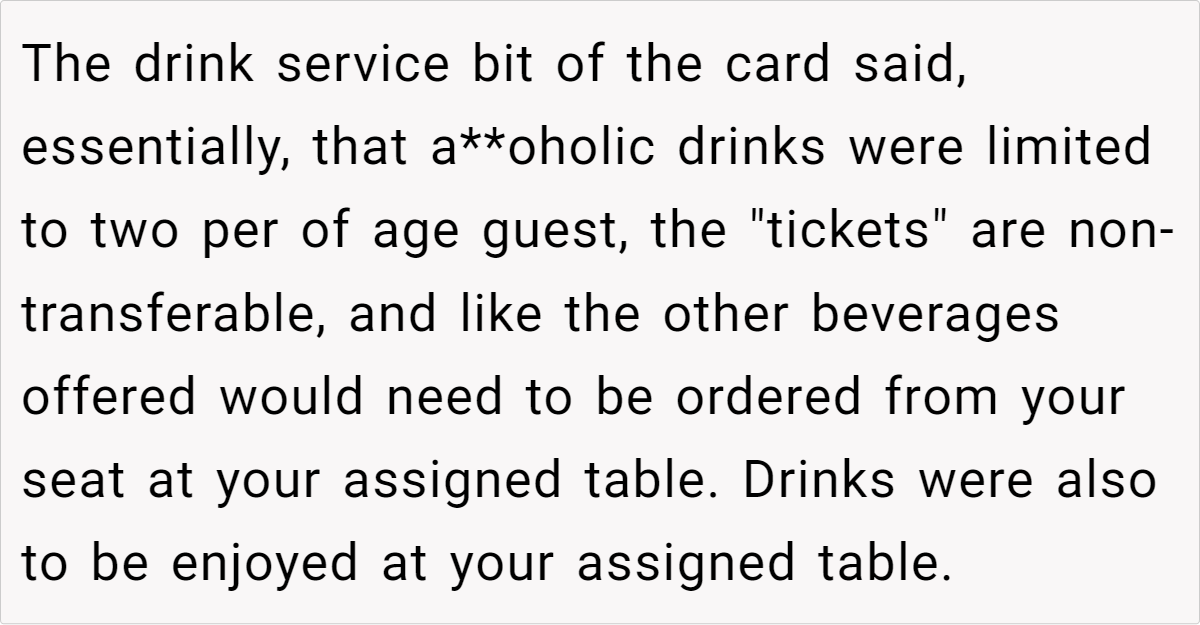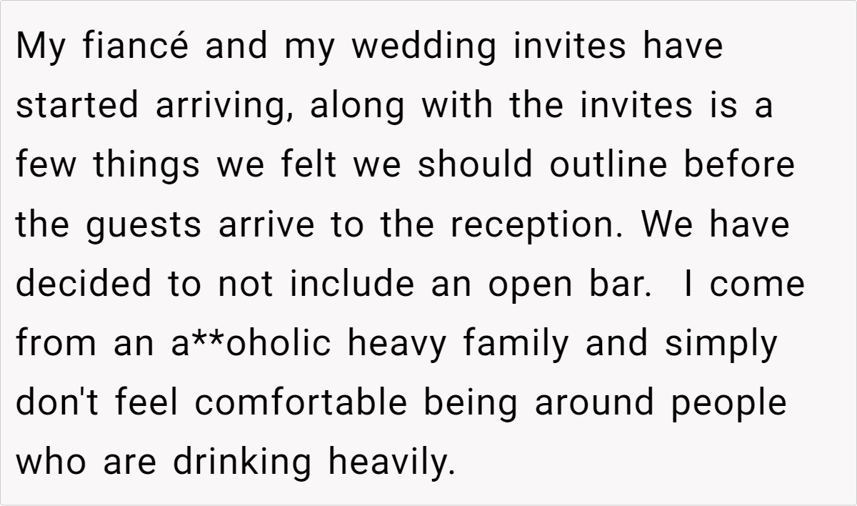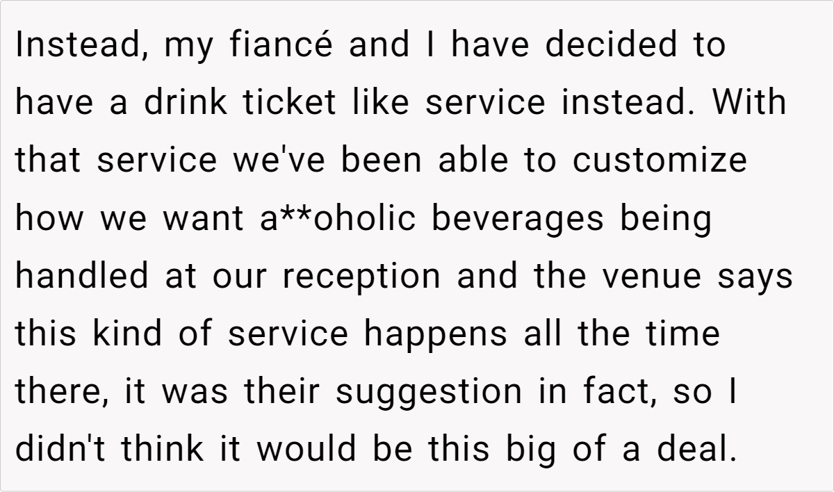 Weddings are a celebration of love, but they can also become battlegrounds for personal preferences and family expectations—especially when it comes to the finer details. In this case, our OP explains how she and her fiancé decided to forgo an open bar at their wedding in favor of a drink ticket system. This choice was rooted in her discomfort around heavy drinking due to her family’s history with alcohol. Rather than letting guests help themselves, the couple opted for a controlled, table-based service with strict limits on alcoholic beverages.