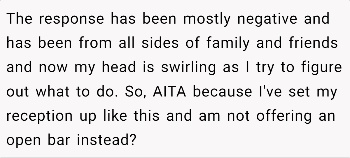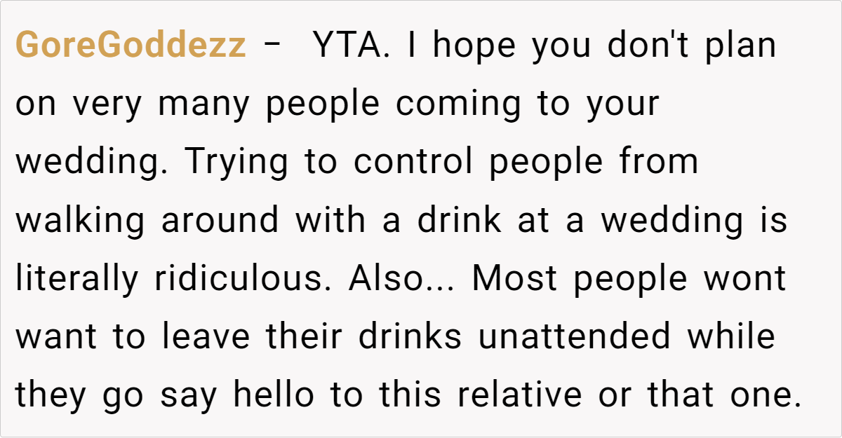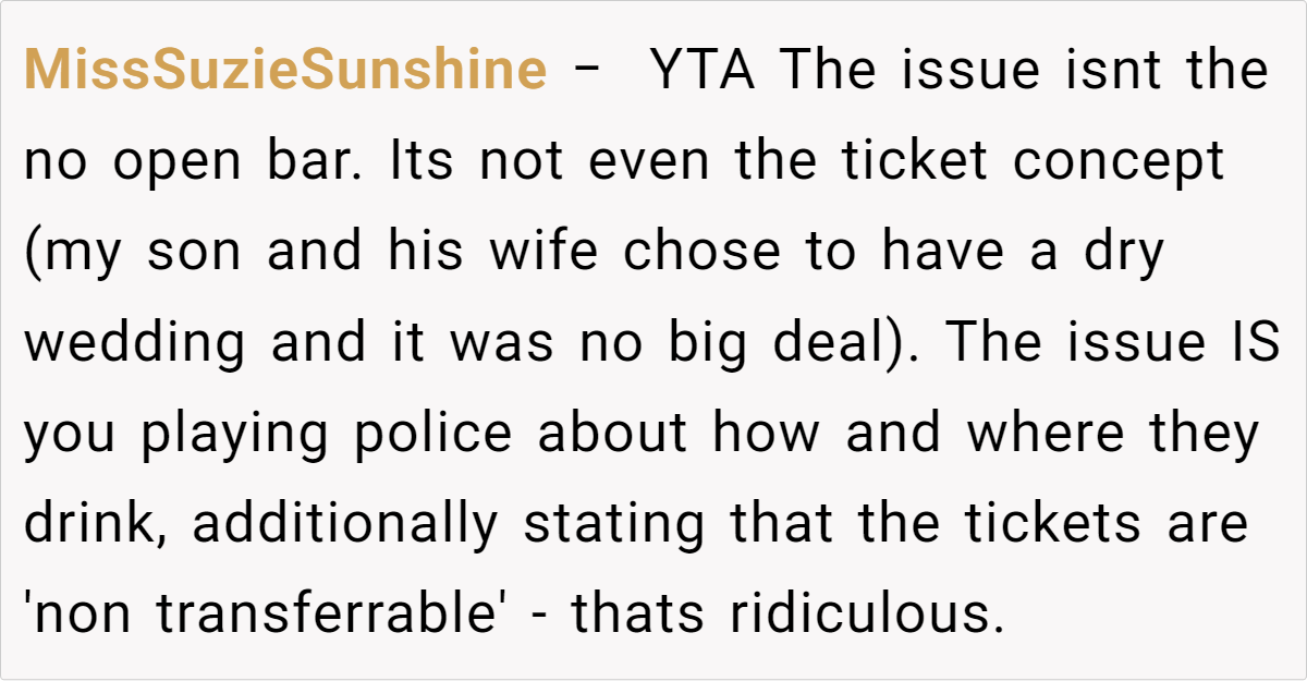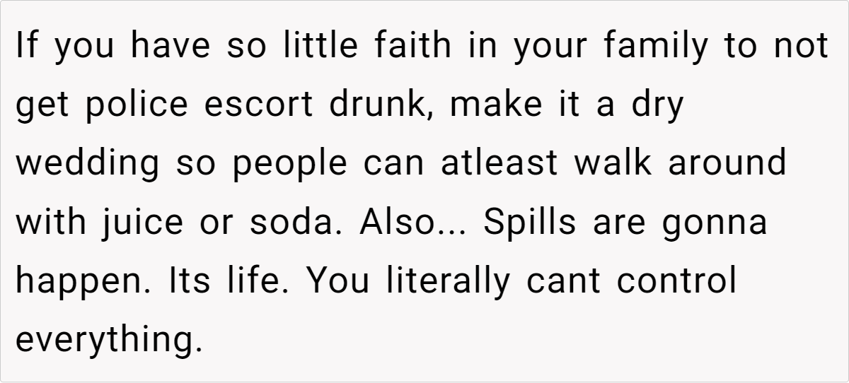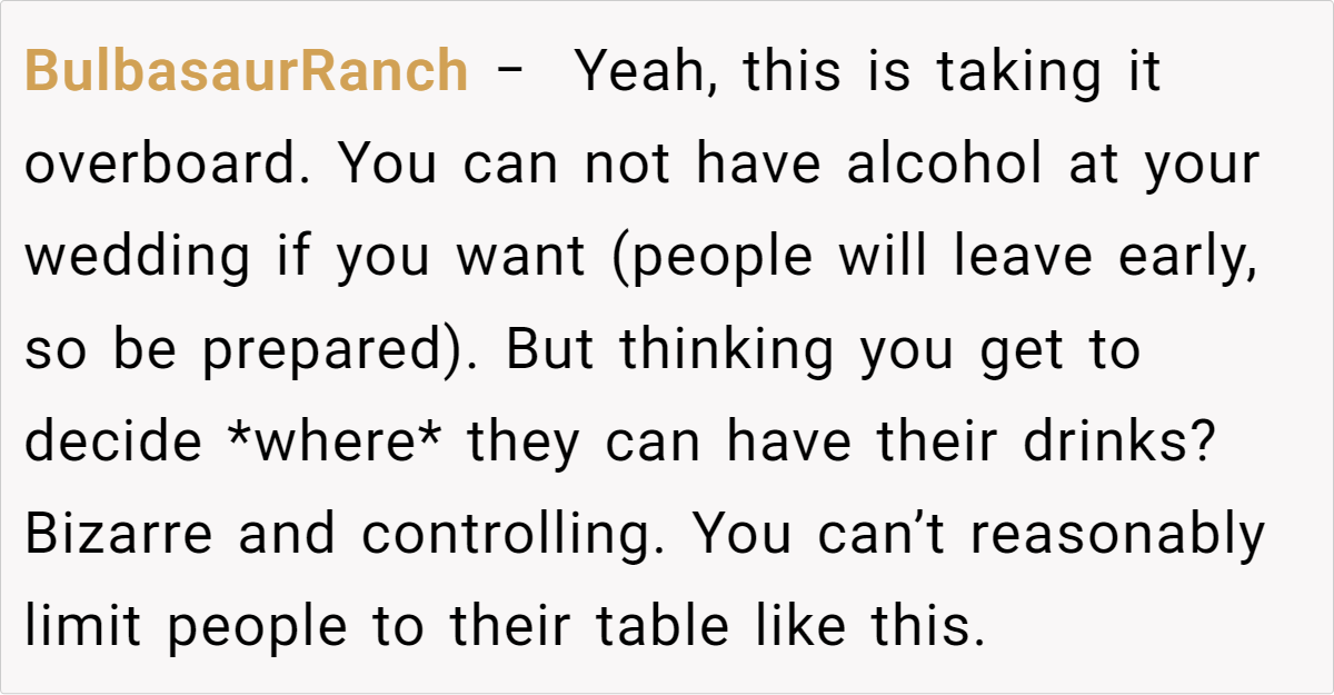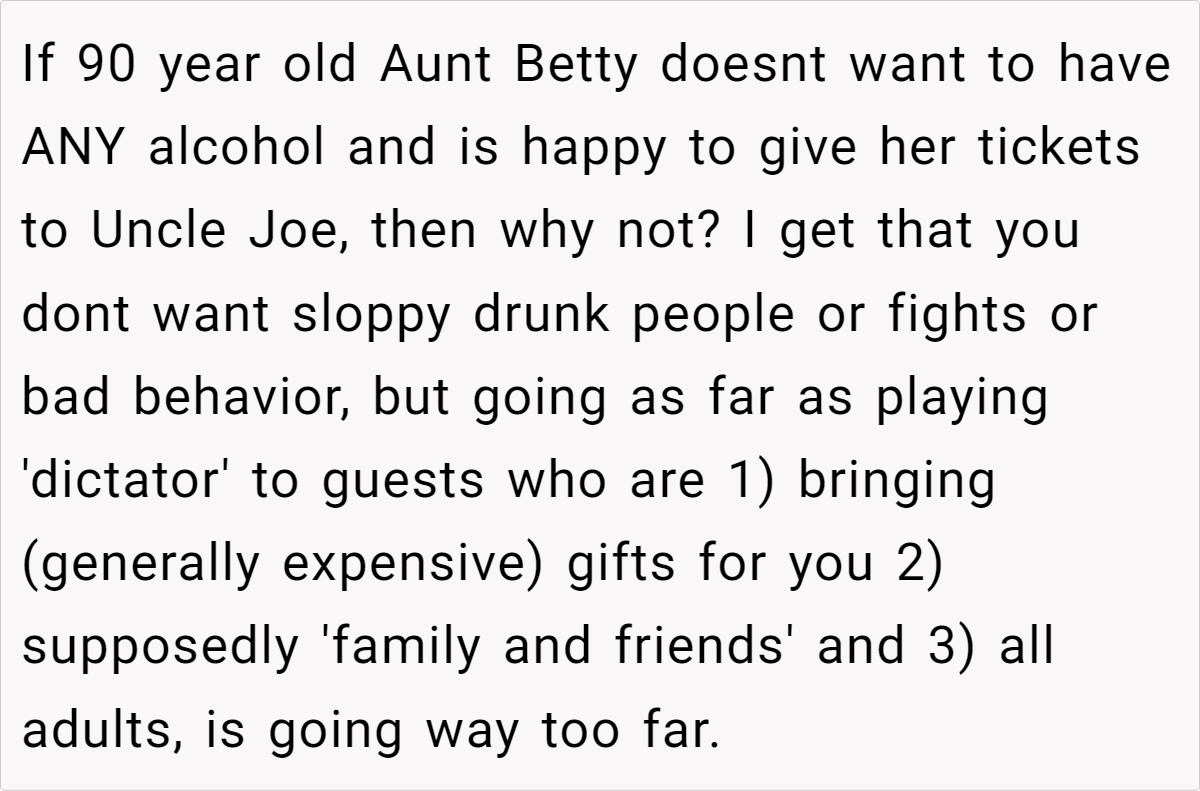Weddings are a celebration of love, but they can also become battlegrounds for personal preferences and family expectations—especially when it comes to the finer details. In this case, our OP explains how she and her fiancé decided to forgo an open bar at their wedding in favor of a drink ticket system. This choice was rooted in her discomfort around heavy drinking due to her family’s history with alcohol. Rather than letting guests help themselves, the couple opted for a controlled, table-based service with strict limits on alcoholic beverages.