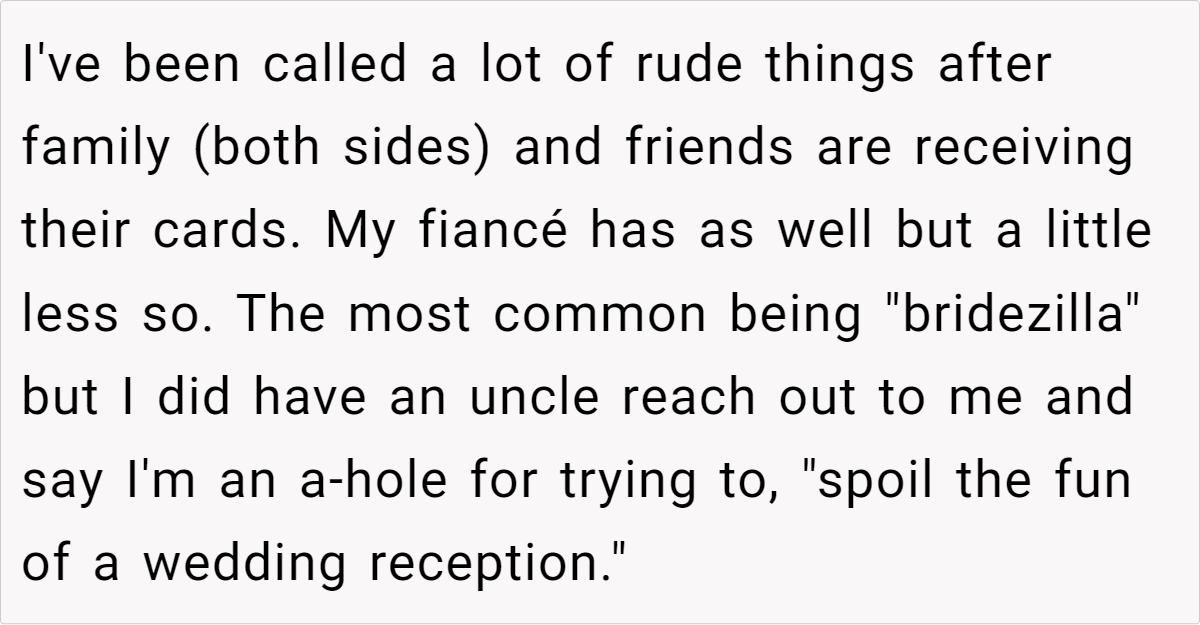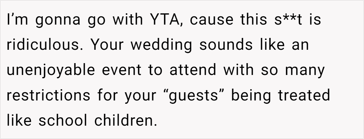 However, the decision has sparked an unexpected backlash. Family and friends have labeled her a “bridezilla” and accused her of spoiling the fun, arguing that her restrictions come off as overly controlling. Now, she’s left wondering if she’s in the wrong for setting the tone at her own celebration.