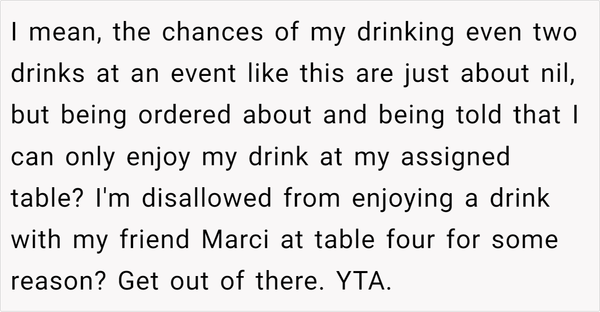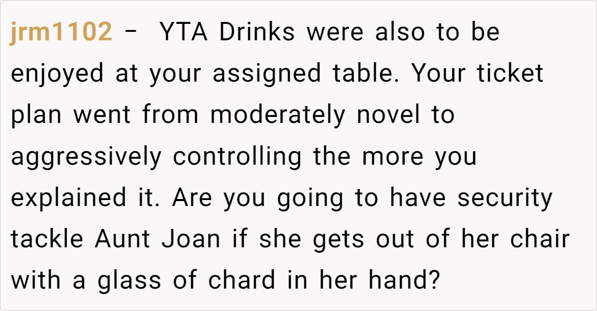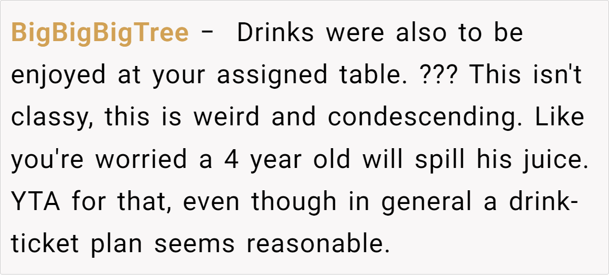 Ultimately, the decision to replace an open bar with a drink ticket system is a personal one, shaped by individual experiences and values. While the intention is to create a safer, more comfortable setting, the strict enforcement—such as mandating that drinks be consumed only at assigned tables—has left some guests feeling restricted and micromanaged. Is it fair to impose such detailed rules on your own wedding reception, or should a celebration allow for a bit more spontaneity?