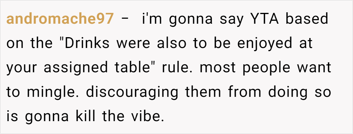 When you impose strict rules—such as requiring guests to remain at their assigned tables—it can inadvertently make people feel like they’re being controlled rather than celebrated.” This suggests that while the intention behind the restrictions is understandable, the execution might be perceived as overbearing by some guests.