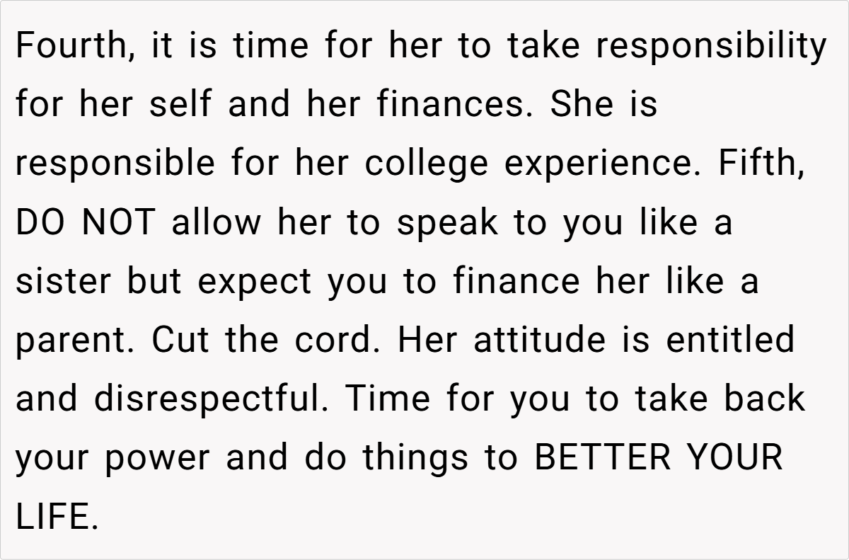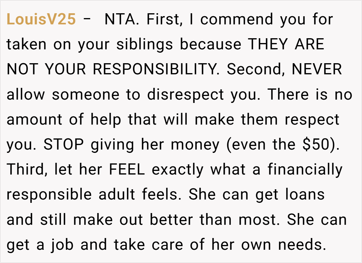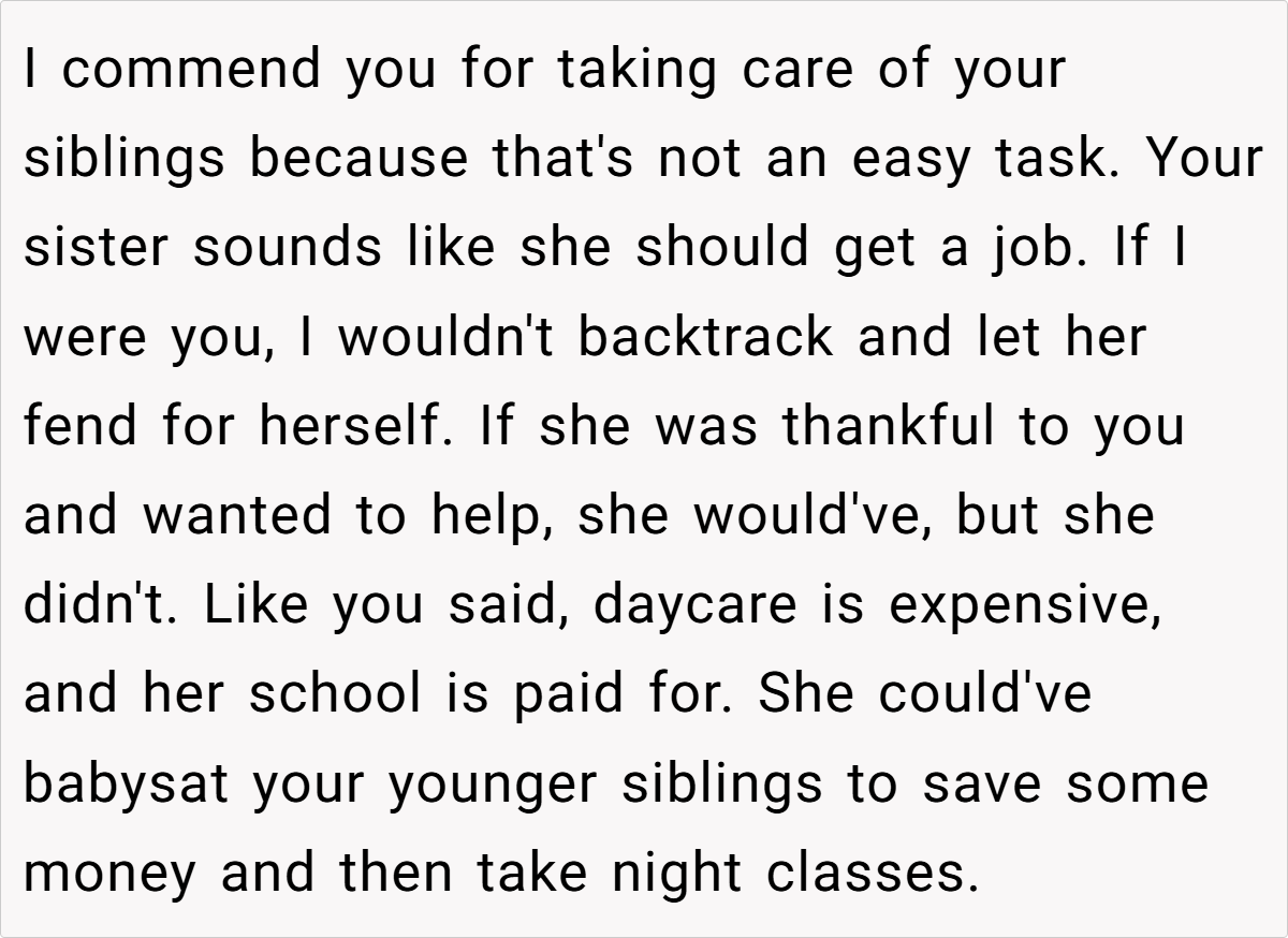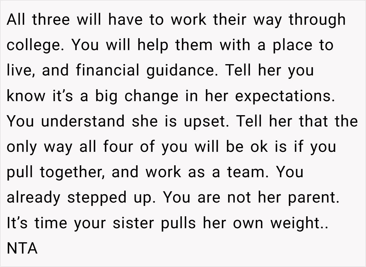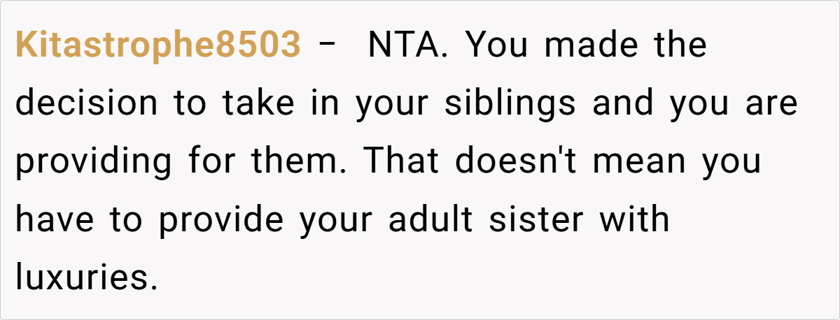 The majority of commenters strongly supported the OP’s decision, emphasizing that her commitment to supporting her siblings shouldn’t obligate her to cover every expense, especially when the sister shows little initiative for self-sufficiency. They noted that the sister’s expectations seem misplaced given the financial strain the OP endures, and many suggested that she should seek a part-time job or apply for campus resources.