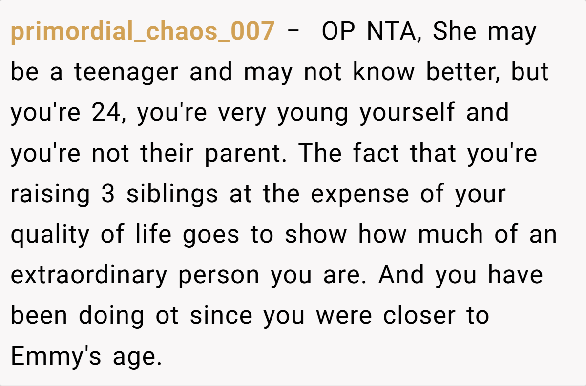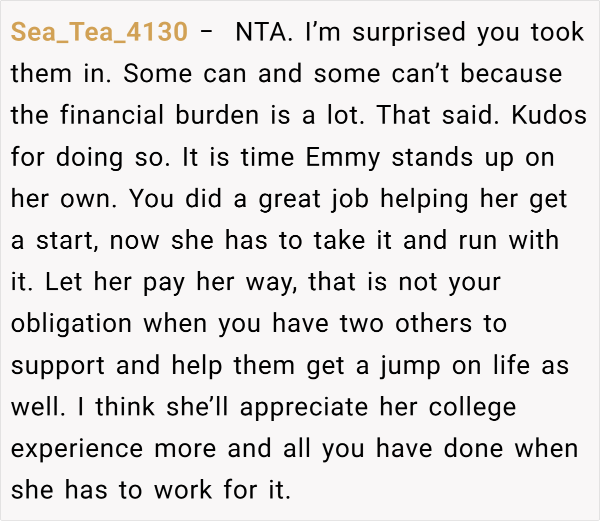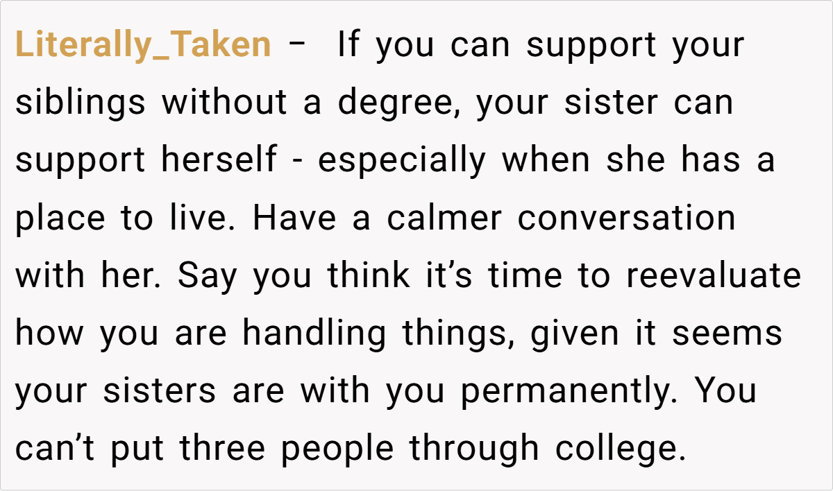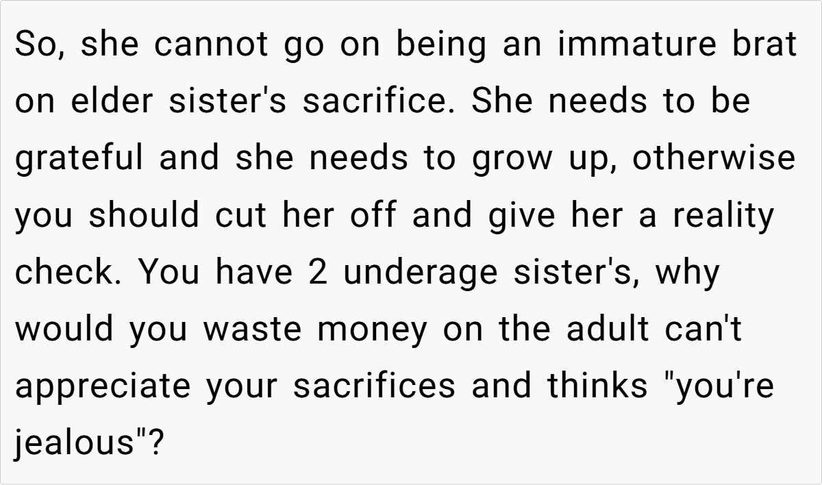 The majority of commenters strongly supported the OP’s decision, emphasizing that her commitment to supporting her siblings shouldn’t obligate her to cover every expense, especially when the sister shows little initiative for self-sufficiency. They noted that the sister’s expectations seem misplaced given the financial strain the OP endures, and many suggested that she should seek a part-time job or apply for campus resources.
