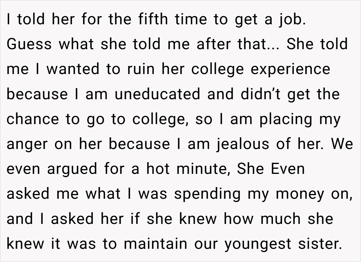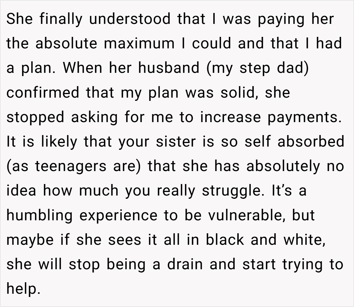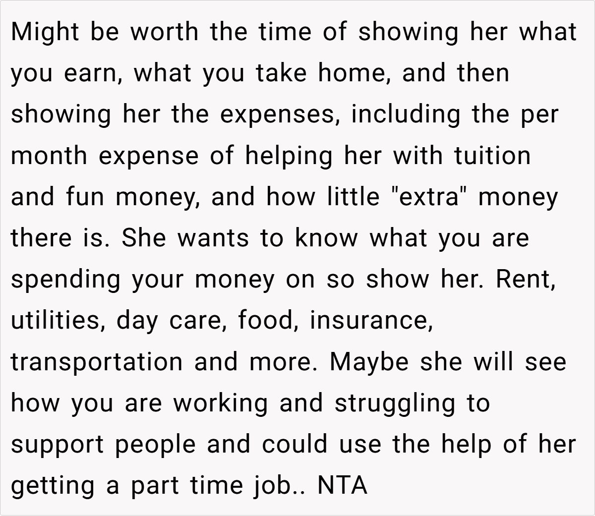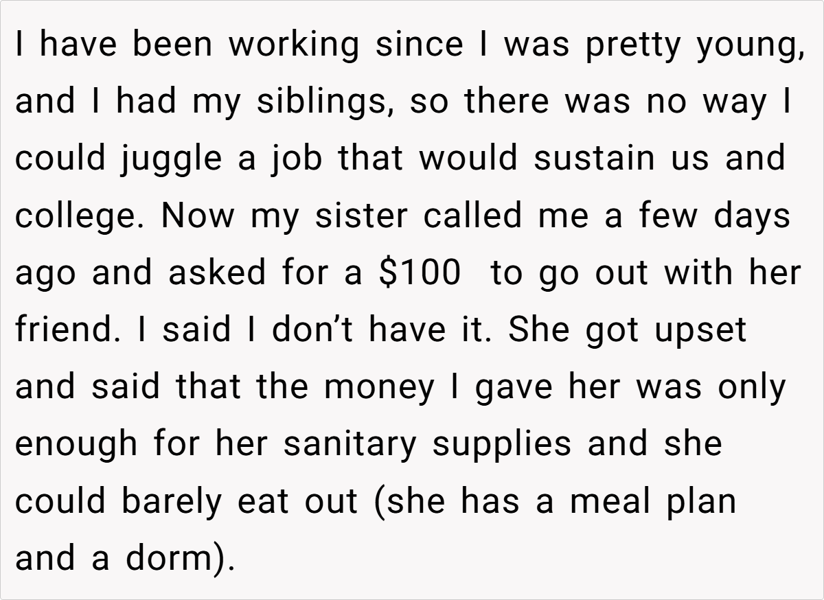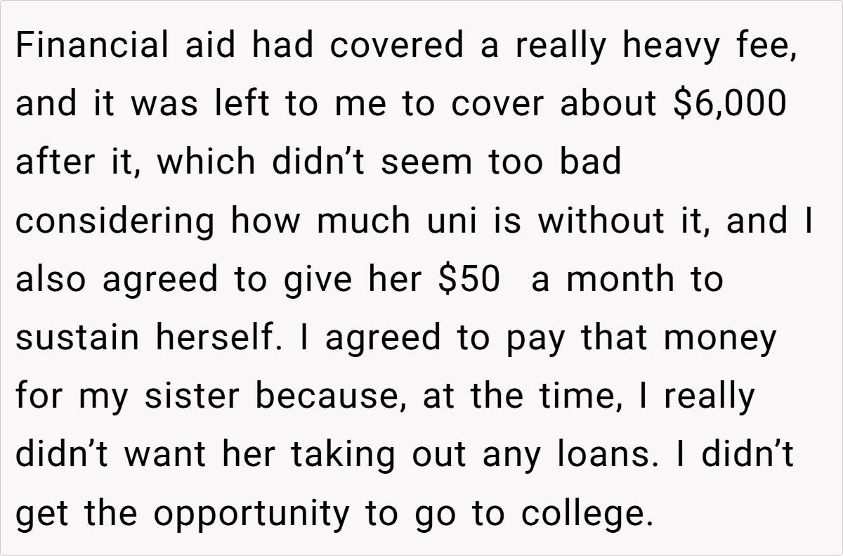 Analyzing the situation, the OP has been juggling work, college costs, and even childcare expenses – a juggling act that leaves little room for extra luxuries. This isn’t about a mere lapse in generosity; it’s about sustaining a household where every expenditure has a ripple effect. The sister’s expectation of extra money, despite already receiving basic support, reveals a disconnect from the harsh economic realities faced by the OP. In a way, this is a classic case of misaligned priorities within a family dynamic, where one party may take the burden for granted.