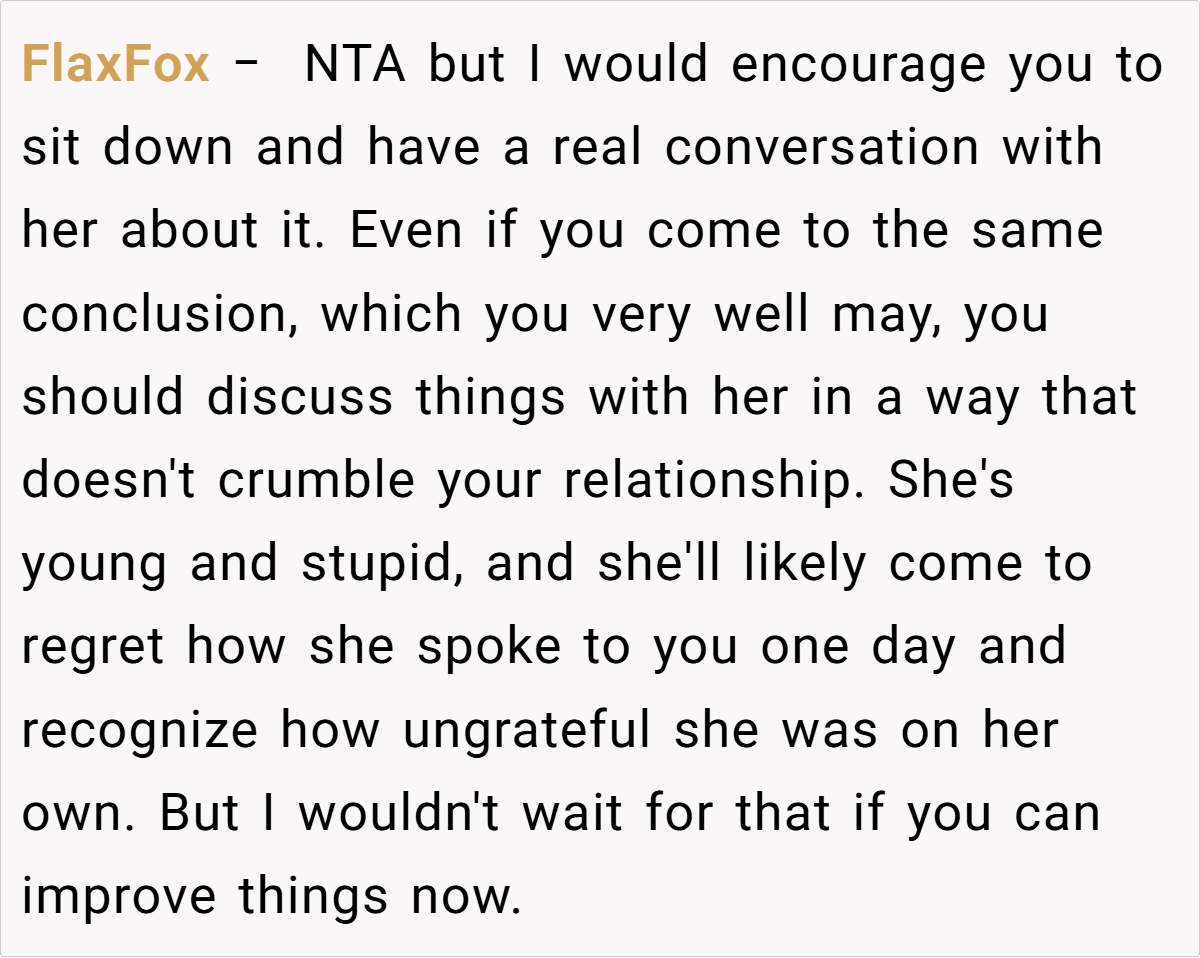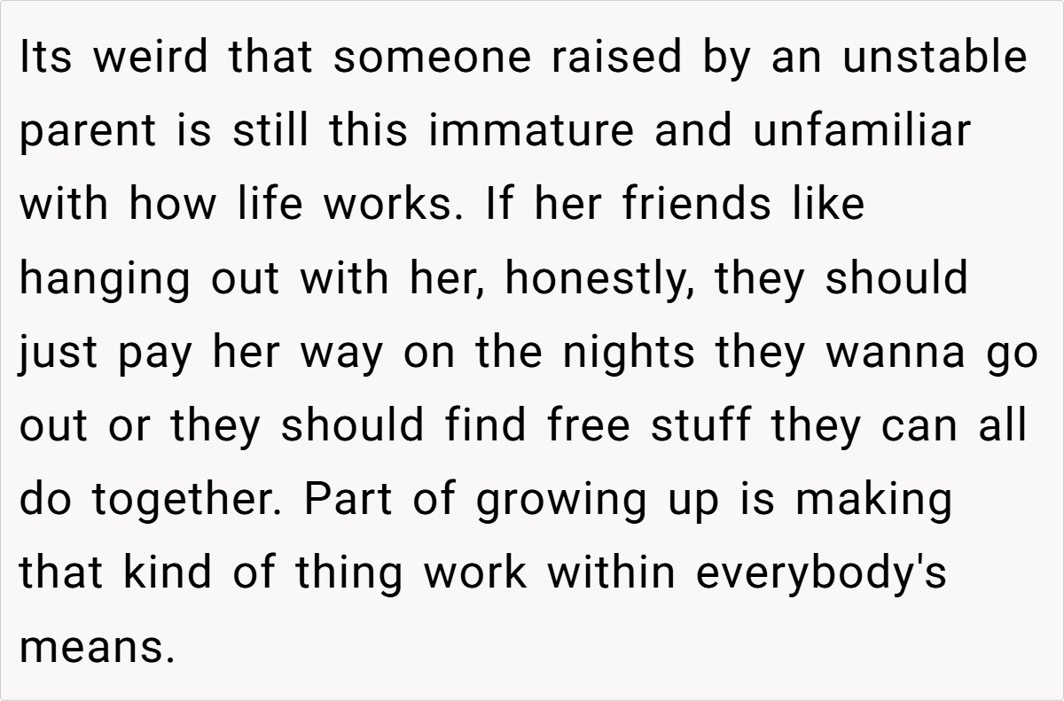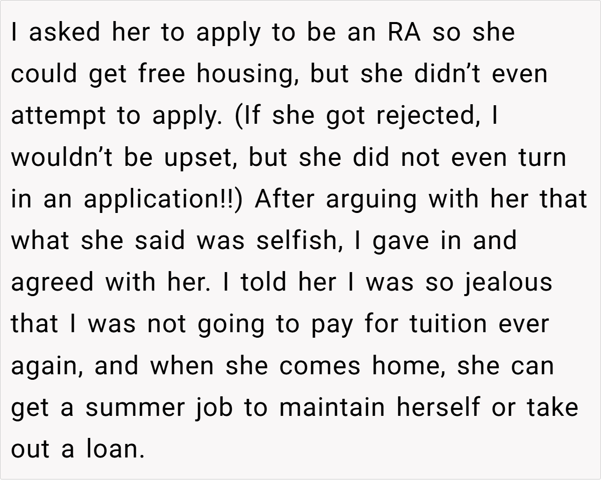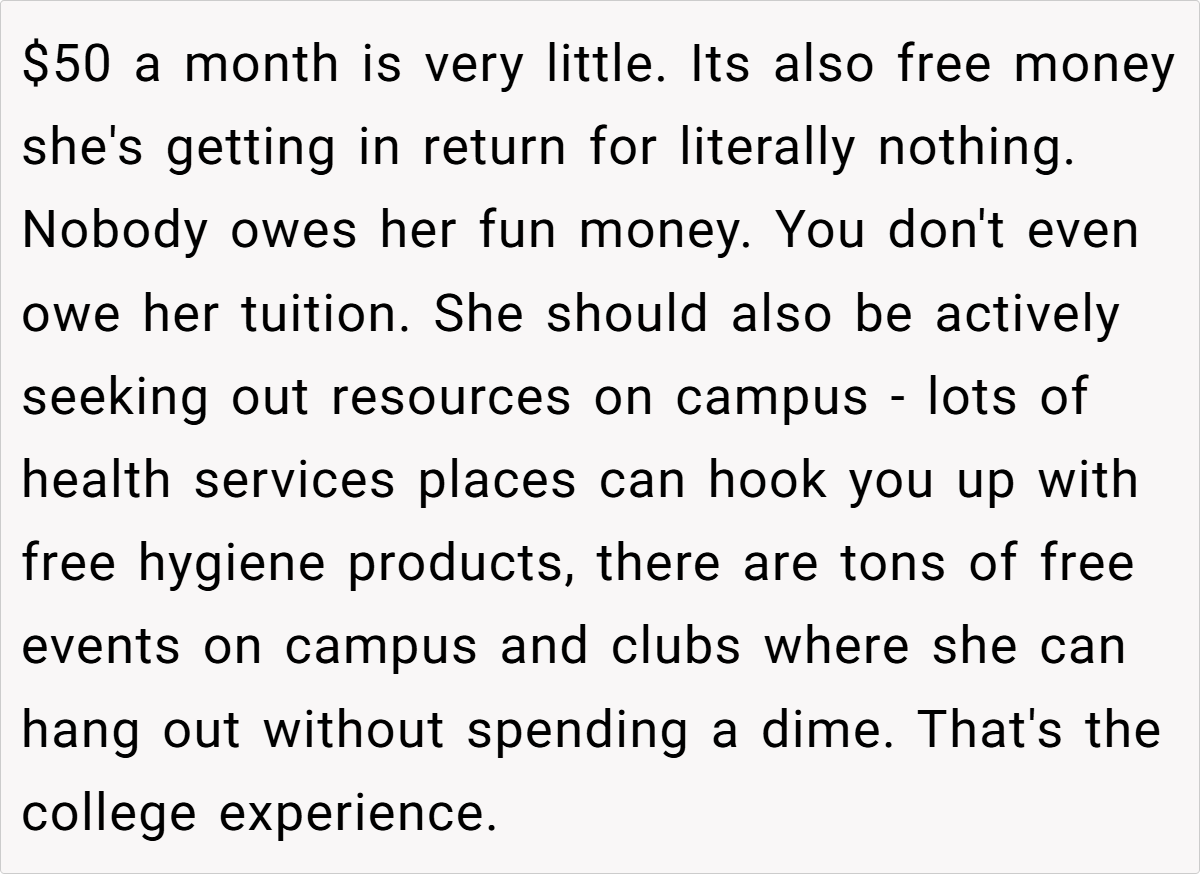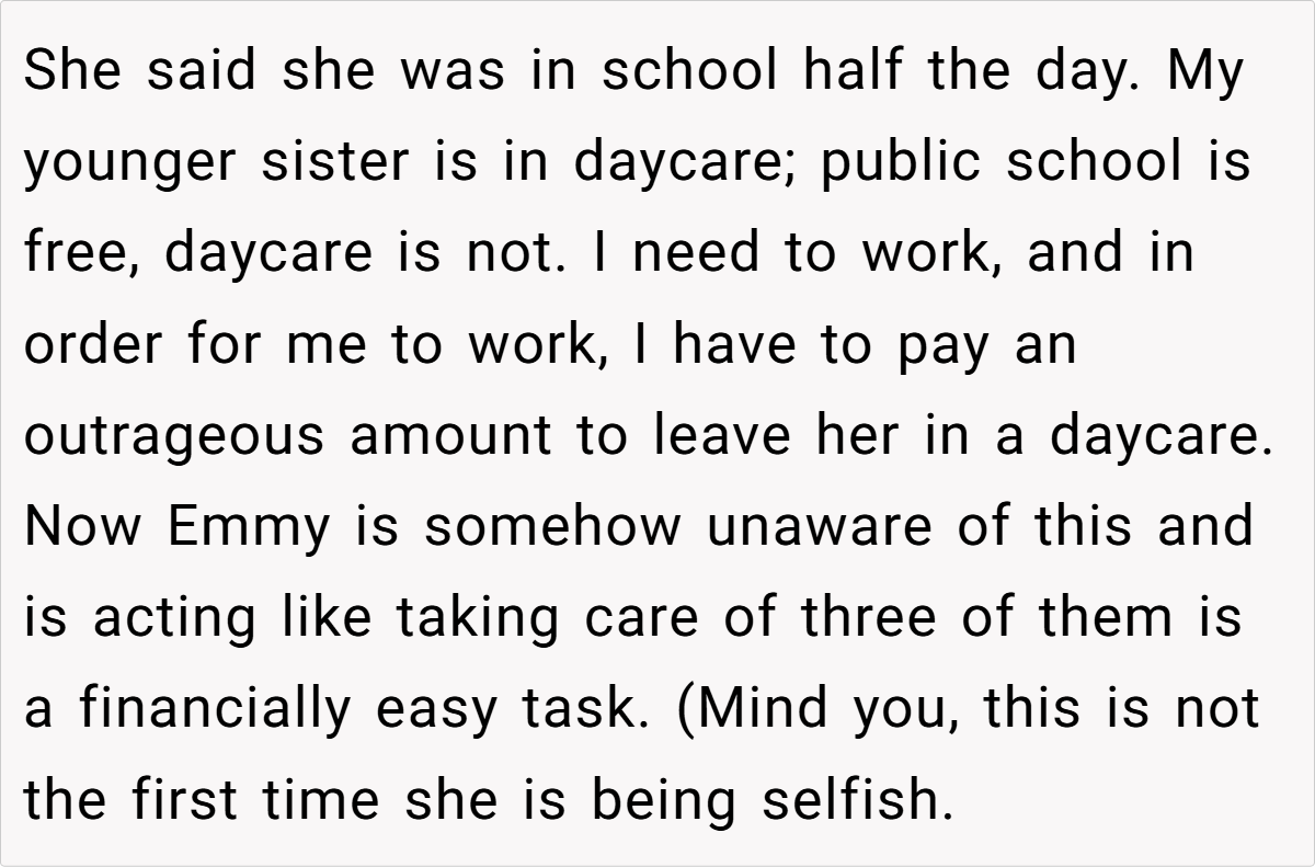 Analyzing the situation, the OP has been juggling work, college costs, and even childcare expenses – a juggling act that leaves little room for extra luxuries. This isn’t about a mere lapse in generosity; it’s about sustaining a household where every expenditure has a ripple effect. The sister’s expectation of extra money, despite already receiving basic support, reveals a disconnect from the harsh economic realities faced by the OP. In a way, this is a classic case of misaligned priorities within a family dynamic, where one party may take the burden for granted.