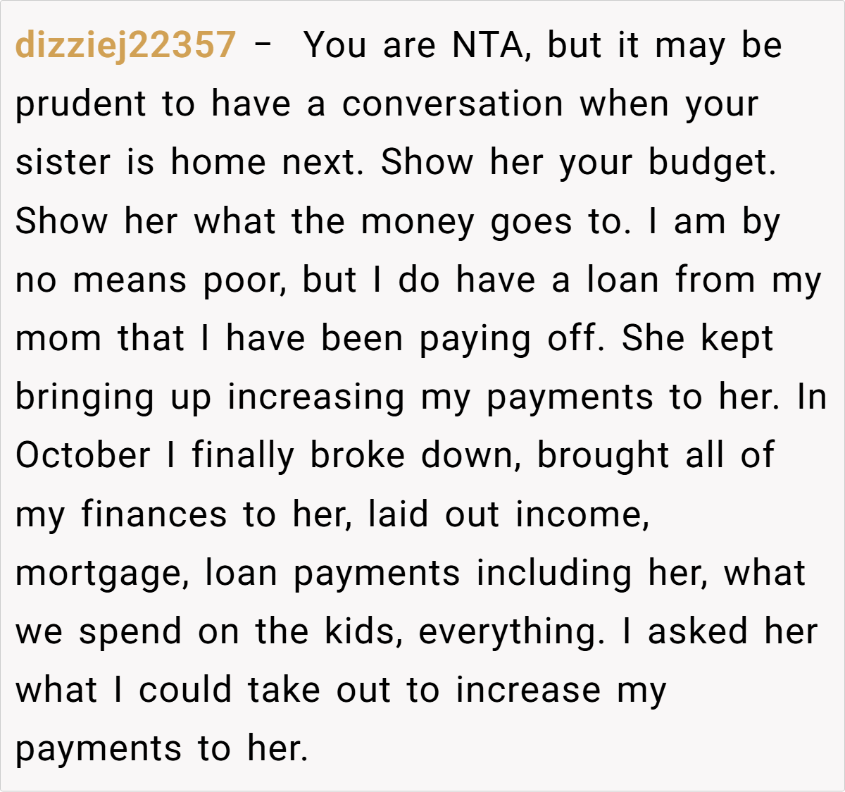 Additionally, some commenters recommended that a transparent discussion about the household budget could help the sister understand the true cost of their living situation. Overall, the community consensus is that accountability is crucial, and while the OP’s sacrifice is commendable, it is reasonable for her to expect her sister to contribute her fair share.