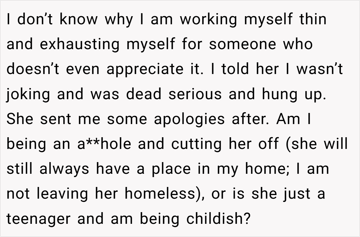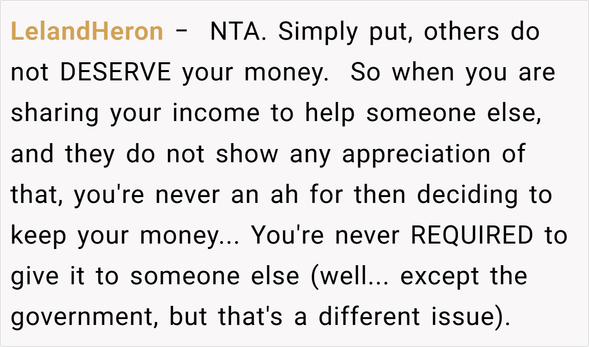 Broadening the issue, financial stress within families is more common than one might think. Studies by financial experts have repeatedly shown that without clear boundaries, monetary support can become a source of conflict rather than care. According to Dave Ramsey, “A budget is telling your money where to go instead of wondering where it went.” This underscores the necessity of planning and setting limits – a lesson the OP seems to be forced into by circumstance. The expert’s insight highlights that without disciplined financial planning, even well-intentioned support can spiral into resentment.