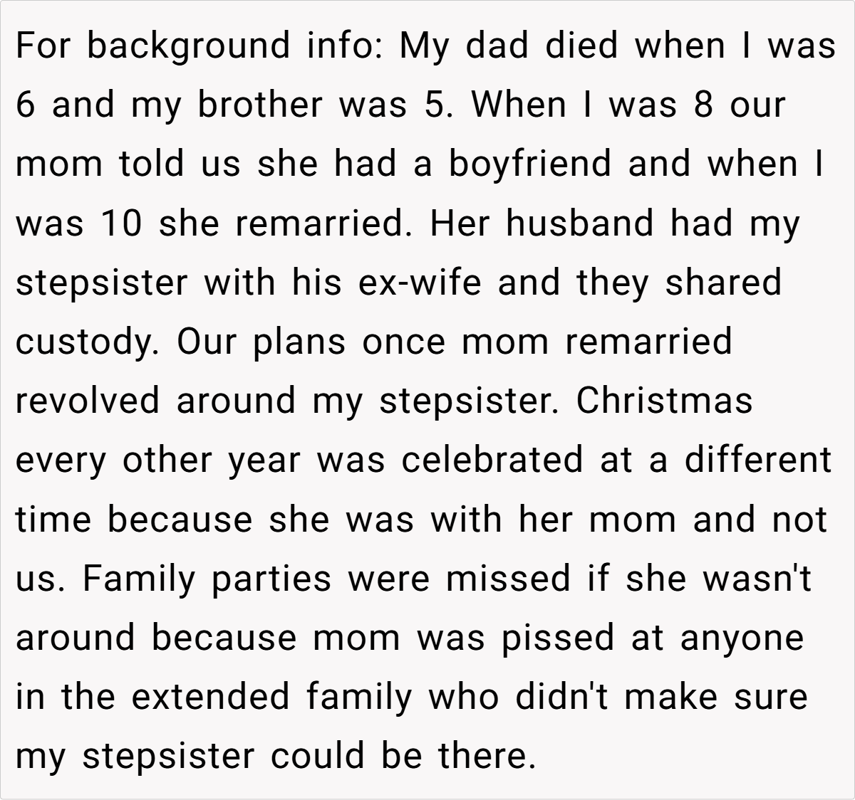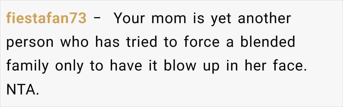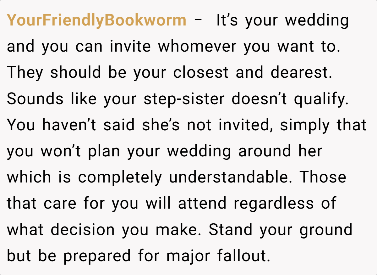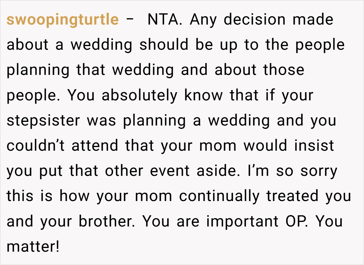 Navigating blended family relationships during major life events can be extremely challenging. Family therapist Dr. Sue Johnson advises, “Establishing clear boundaries is key to maintaining healthy relationships,” which rings especially true in situations like this. The OP’s decision to set a wedding date that works for him and his fiancée is a crucial step toward asserting his independence. His experience reflects a longstanding pattern where family members have imposed scheduling and expectations that prioritized someone he never felt close to.
