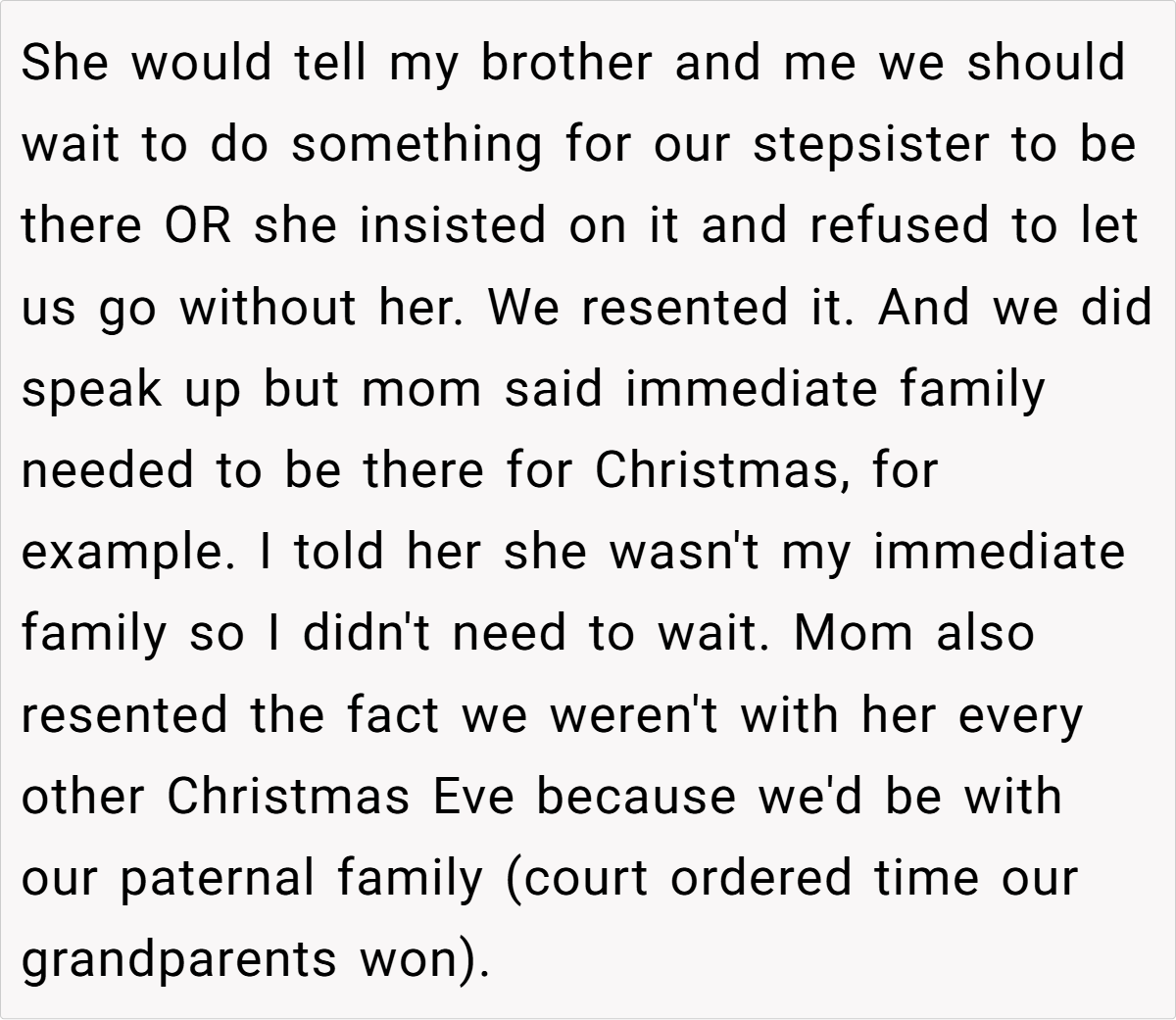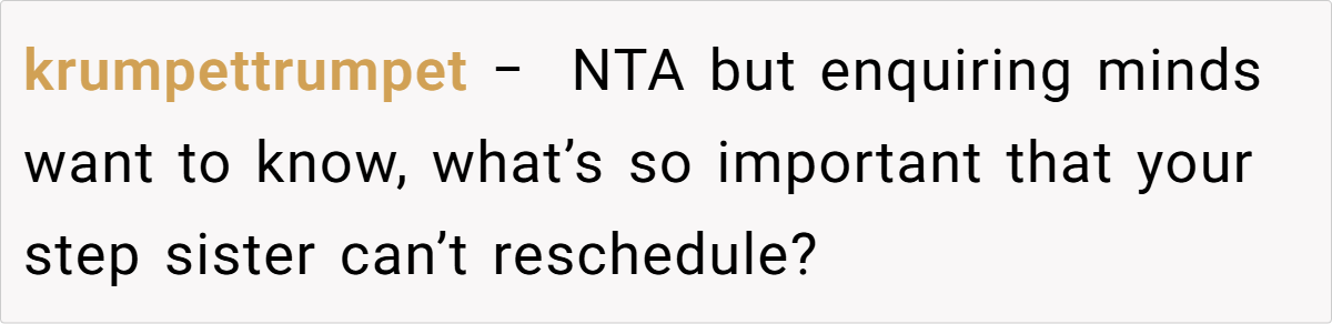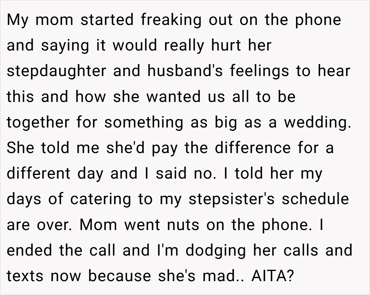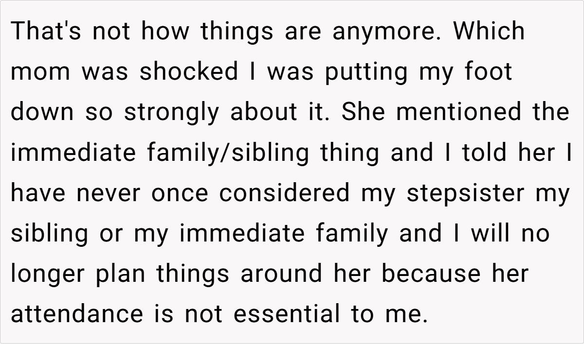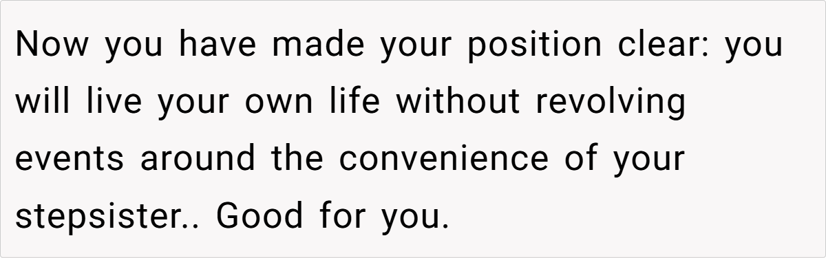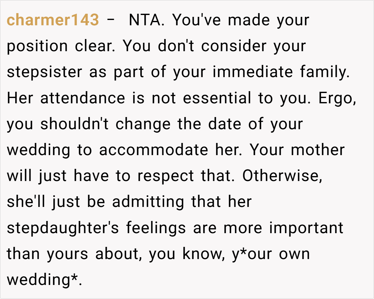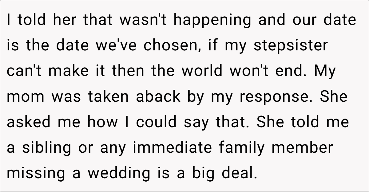This situation also underscores the importance of self-advocacy in blended families. When family events are constantly dictated by someone who isn’t considered part of your immediate circle, resentment can build over time. Research from the Gottman Institute emphasizes that clear communication about one’s boundaries is essential to avoid long-term emotional damage. The OP’s firm response is not just about a wedding date—it’s a stand for a lifetime of self-respect and independence.