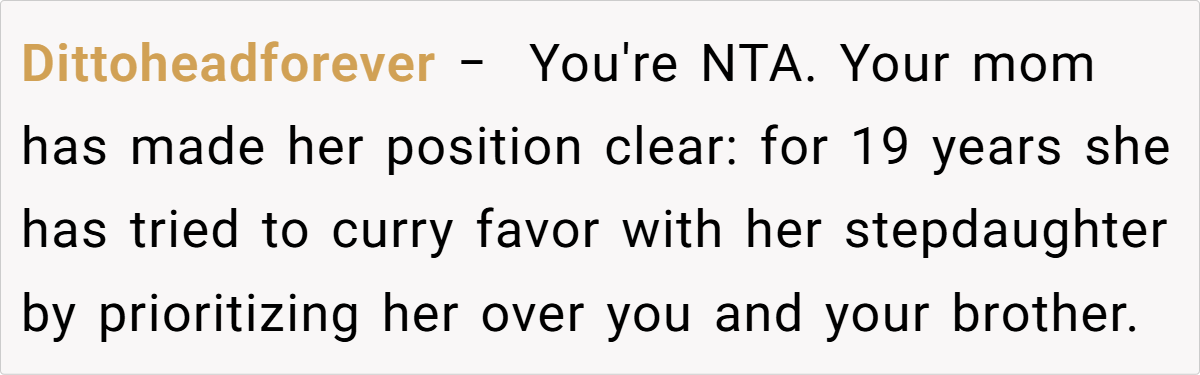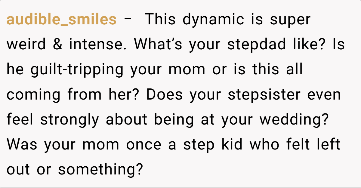 Moreover, the OP’s experience illustrates the impact of unresolved childhood issues. Growing up with a parent who always prioritized a stepsibling’s attendance can leave lasting scars. Family dynamics experts suggest that when someone’s voice is continually undermined in favor of another’s, it’s critical to reassert one’s own identity and needs. The OP’s wedding, a milestone in his life, became the battleground for these deeply rooted issues, highlighting the necessity of redefining what “immediate family” really means.