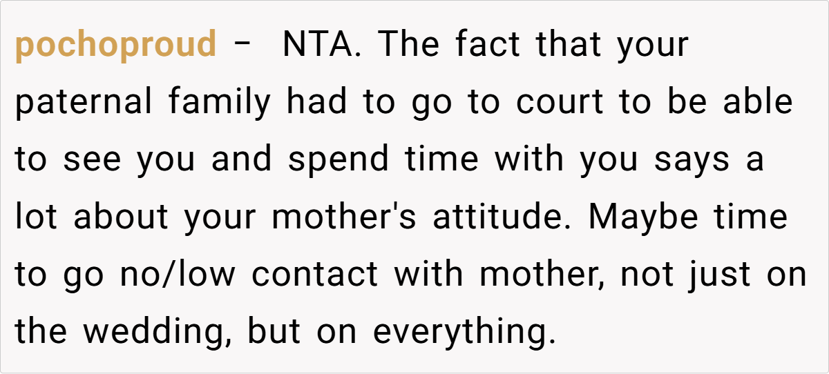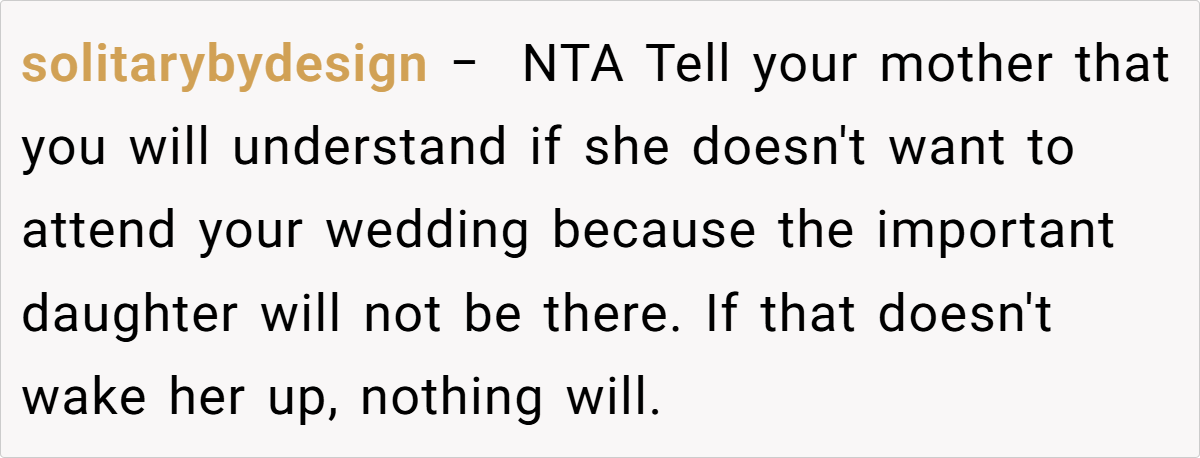 By standing up against the pressure to rearrange his wedding plans, the OP is reclaiming control over his life. In family systems, it’s not uncommon for past resentments to surface during pivotal moments like weddings. Psychologist Dr. John Gottman has noted, “The small battles often reveal deeper issues.” His approach may seem abrupt, but it is a reaction to years of feeling sidelined and forced to accommodate a family member whose presence was never truly desired.