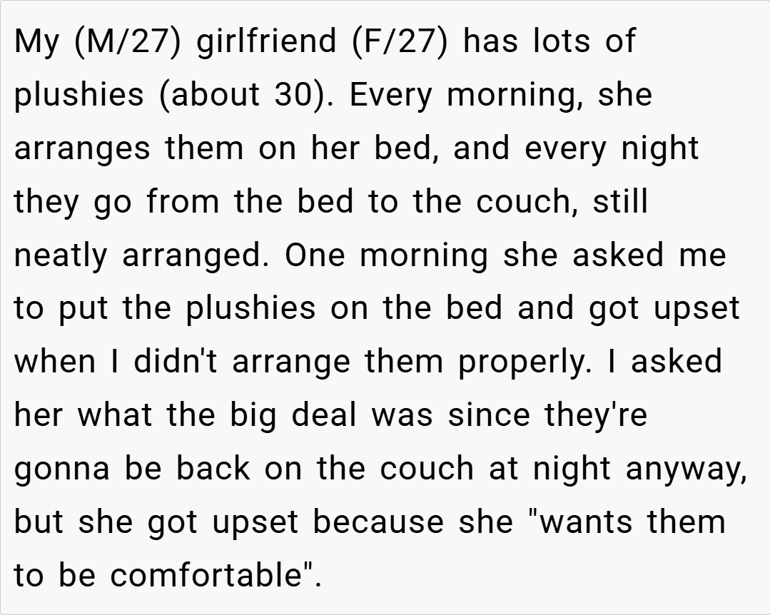 Navigating quirky behaviors in relationships can be tricky, especially when it involves personal interests that may seem odd to one partner. My 27-year-old girlfriend has a deep love for her plushies—arranging them carefully each day and even expecting me to talk to them.