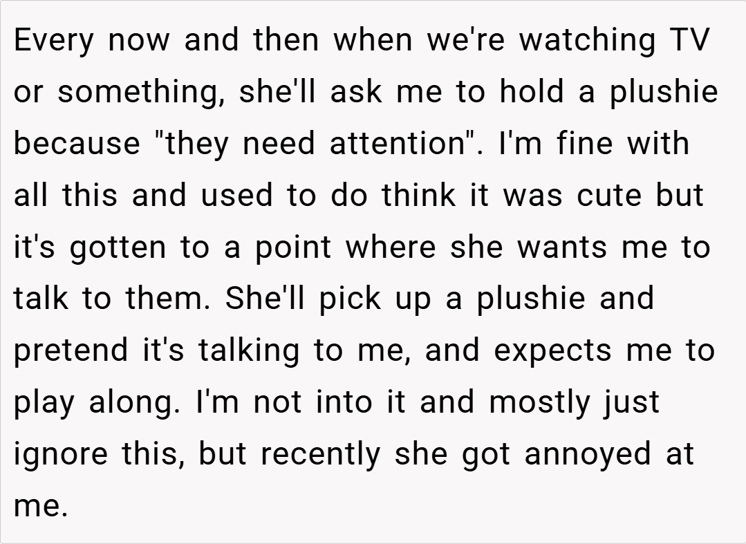 While I’ve indulged her interests, recently she’s gotten upset that I refuse to pretend her plushies are real. I believe in being supportive, but when this request crosses a line into something I’m uncomfortable with, it’s raised questions about boundaries. Is it unfair for me to draw the line here?