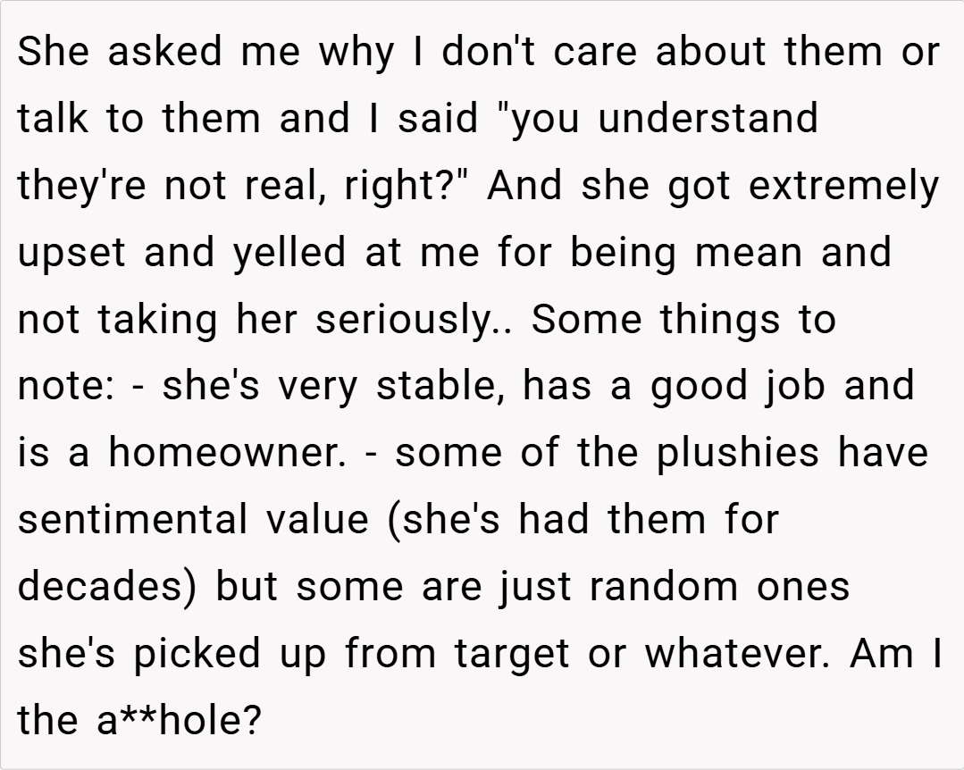 ‘AITA for not pretending my girlfriend’s plushies are real?’