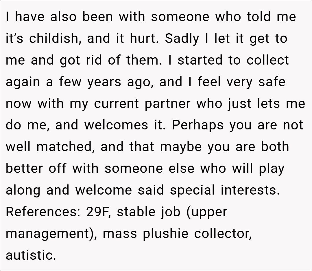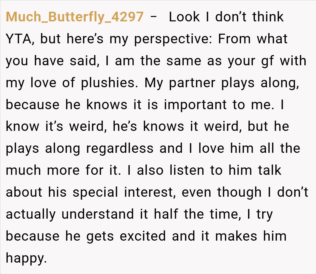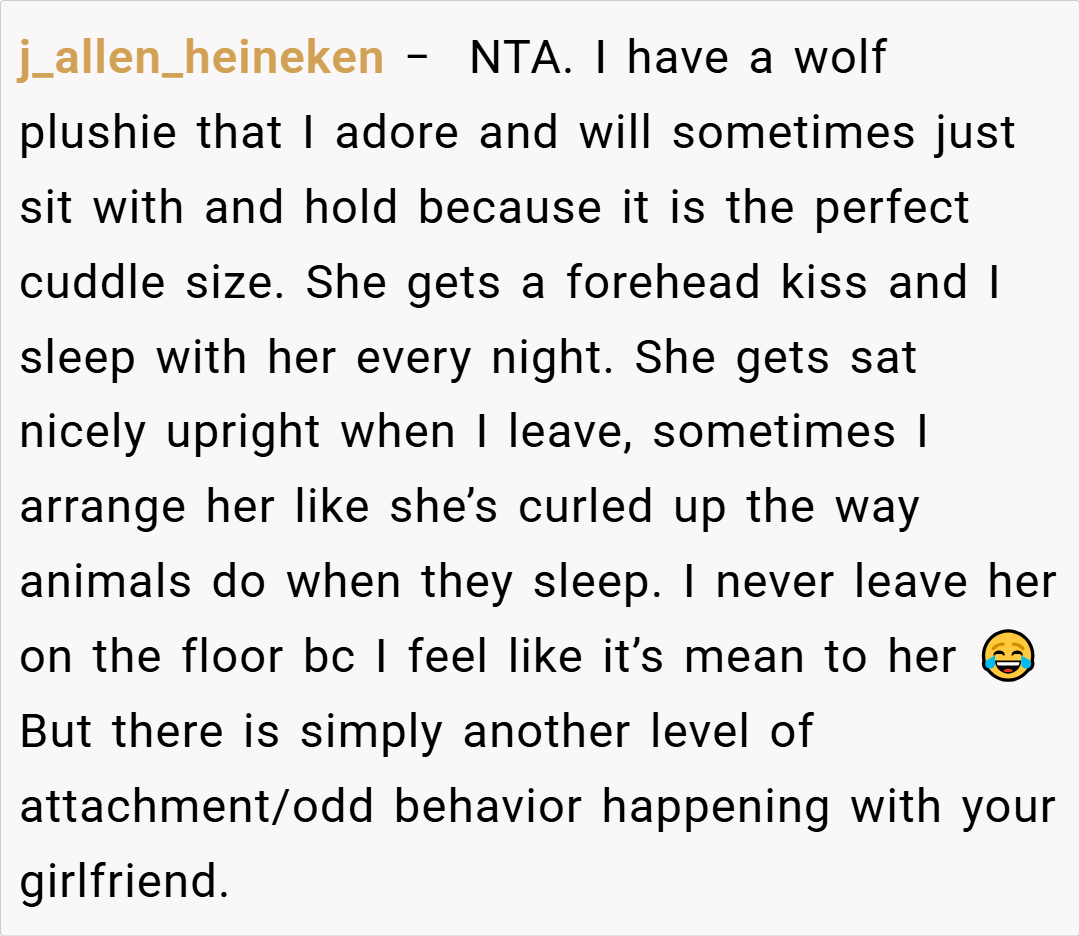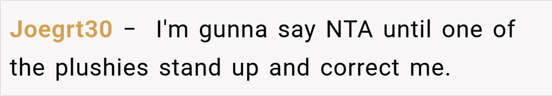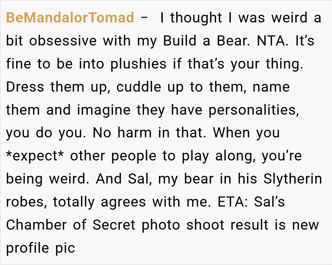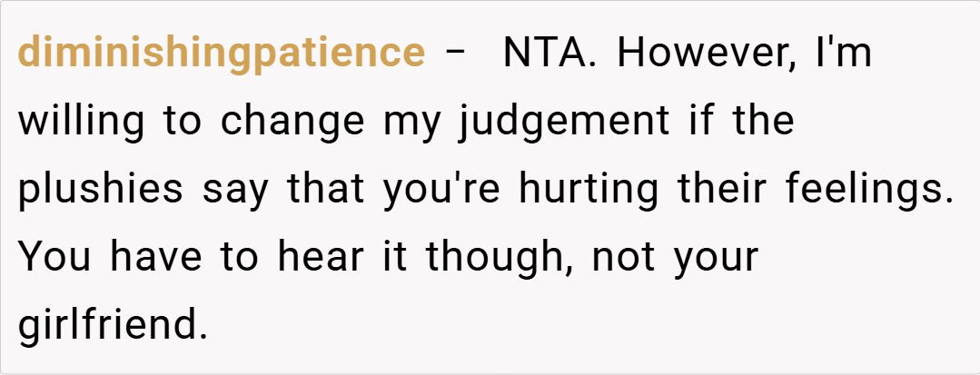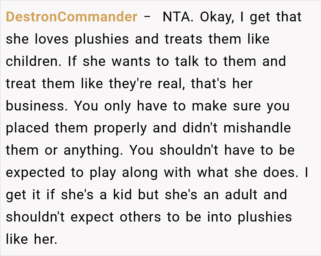 One Redditor, BeMandalorTomad, humorously noted, “I thought I was weird being a bit obsessive with my Build-a-Bear, but expecting your partner to act like your stuffed animal’s best friend is a whole new level!” Another user, diminishingpatience, chimed in: “I’d be willing to change my judgment if the plushies themselves started complaining—but until then, you’re NTA.”