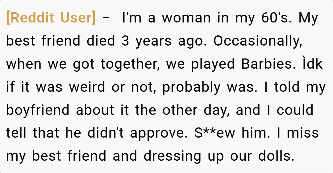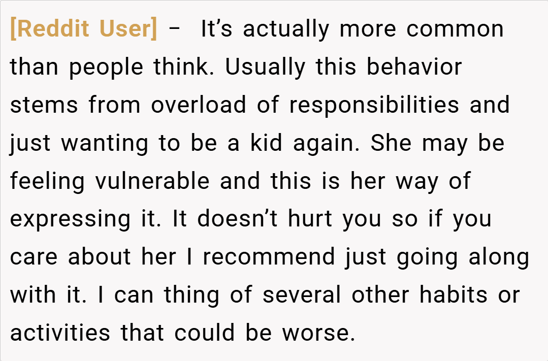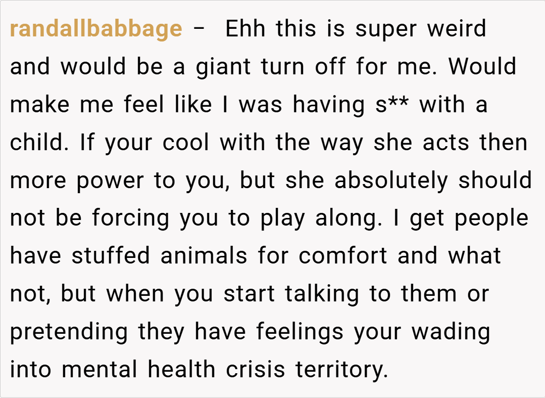 A third commenter, DestronCommander, asserted, “Your girlfriend’s behavior might be cute in small doses, but forcing you to talk to inanimate objects is unreasonable. Stand your ground.” Lastly, a popular comment summed up: “It’s common for people to use quirky habits as emotional outlets, but you’re not required to play along if it makes you uncomfortable. Boundaries matter.”