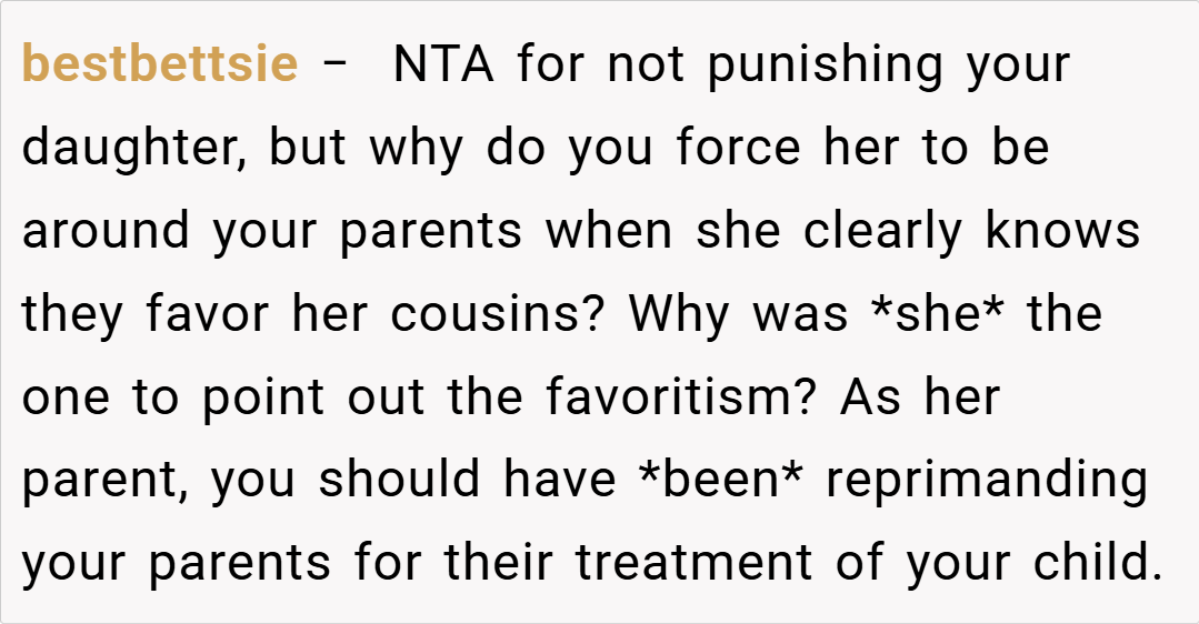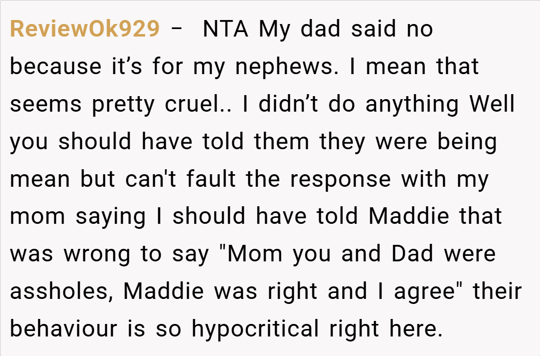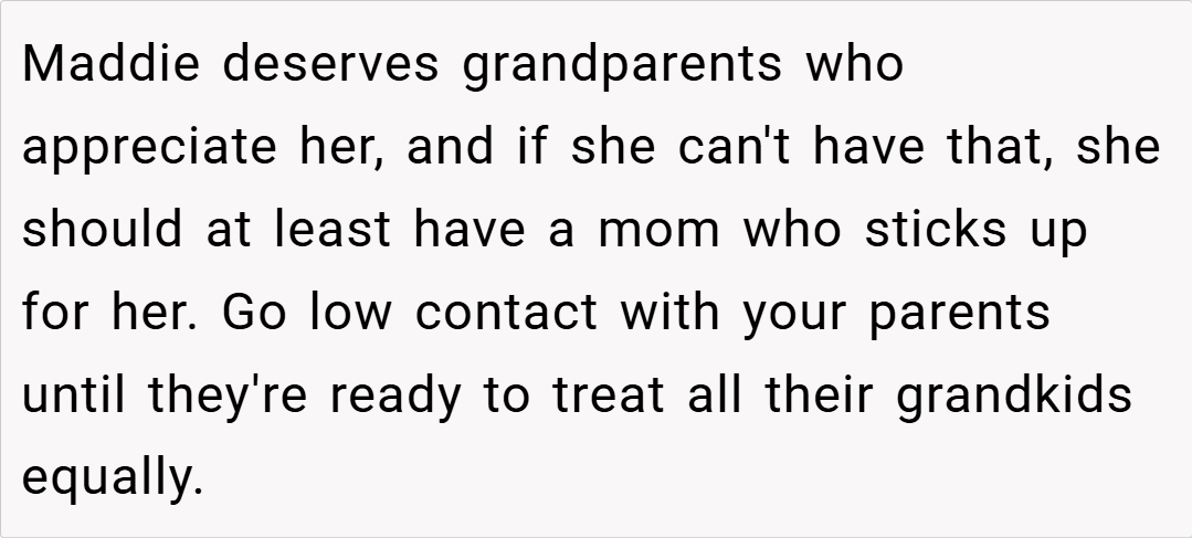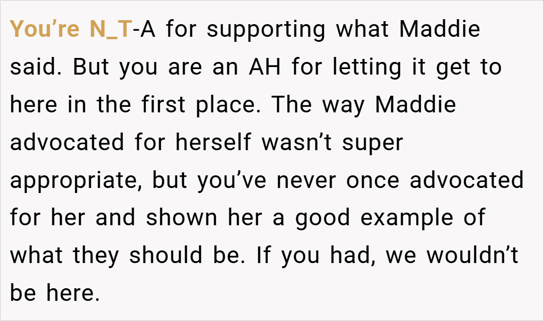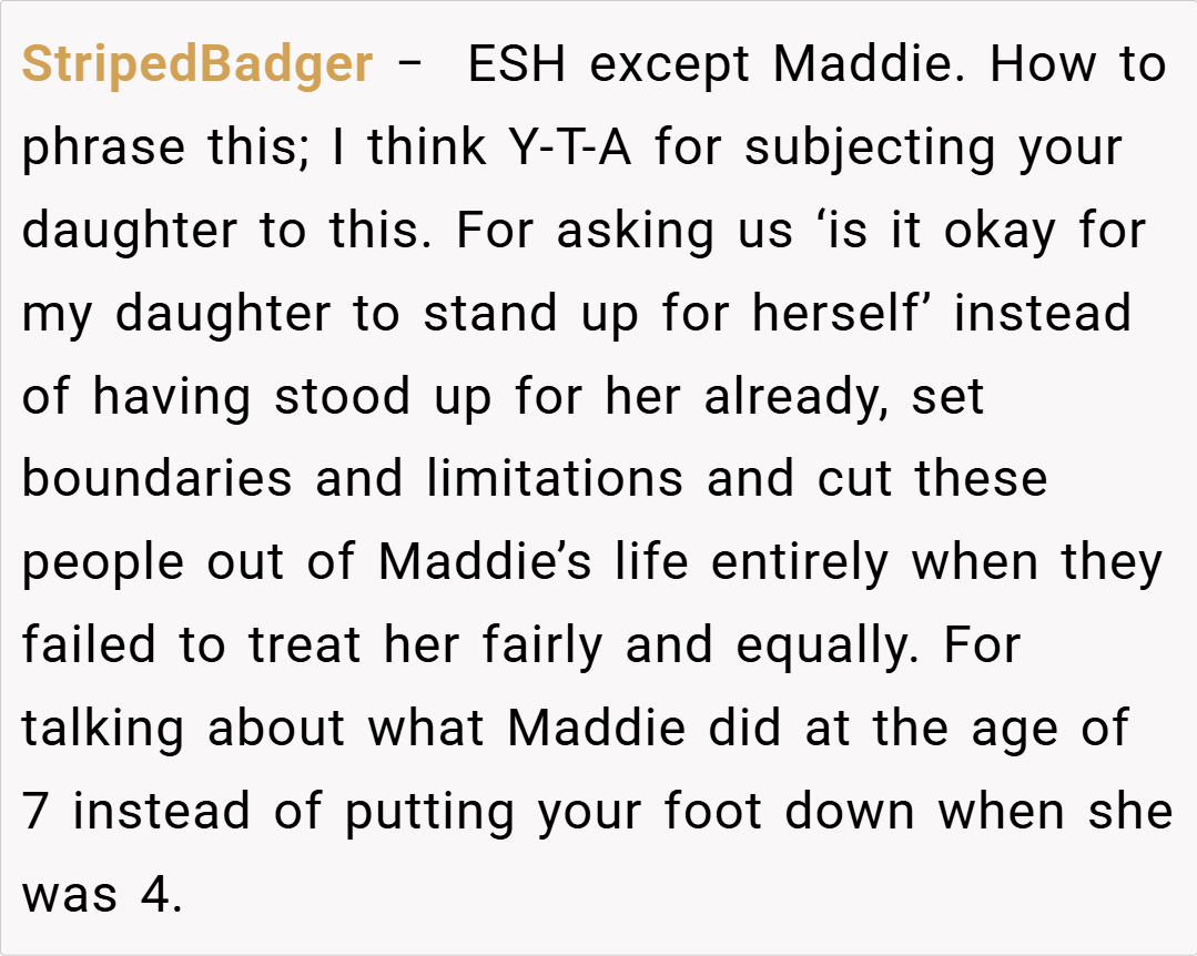- Yet another remarked, “Your response might be harsh for some, but considering your family’s track record, it sounds like Maddie’s comment is a direct reflection of the favoritism she’s experienced. Boundaries need to be set—and it starts with the adults.” (parents.com)