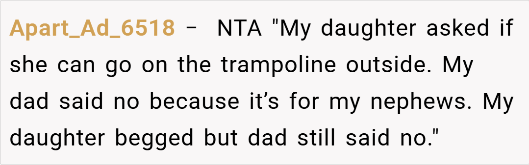 when some family members receive lavish gifts and spontaneous babysitting while others are left with last-minute plans and bargain-basement goodies, a child’s self-esteem can take a hit. At a rare family gathering, the tension reached its peak when Maddie, our young protagonist, asked to use the trampoline—and was denied because it was “for the nephews.”