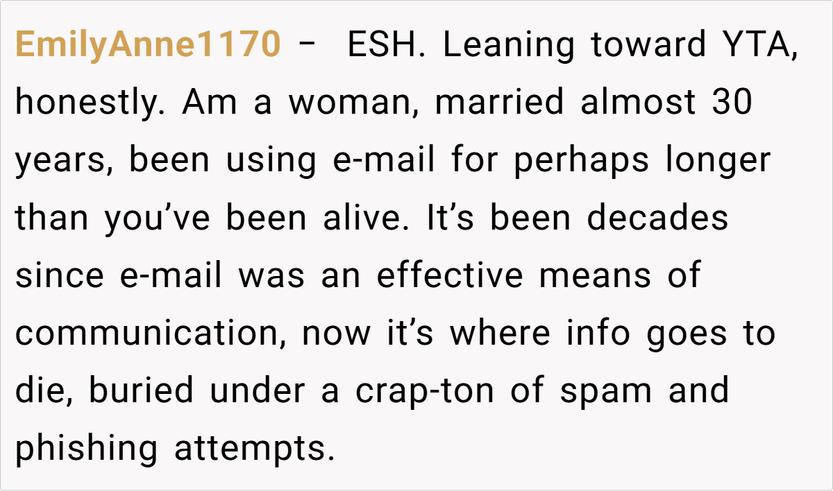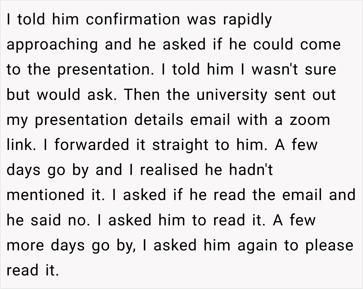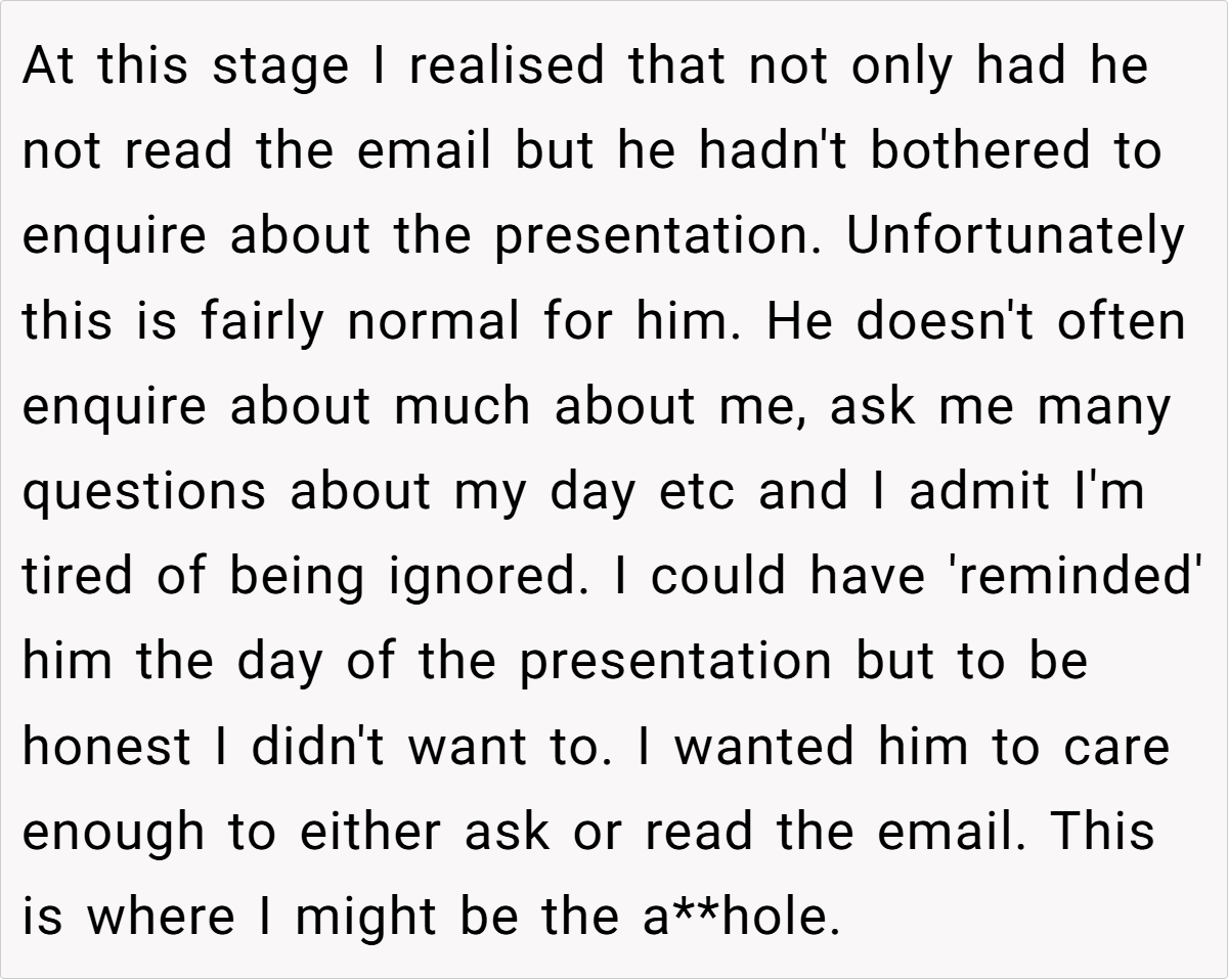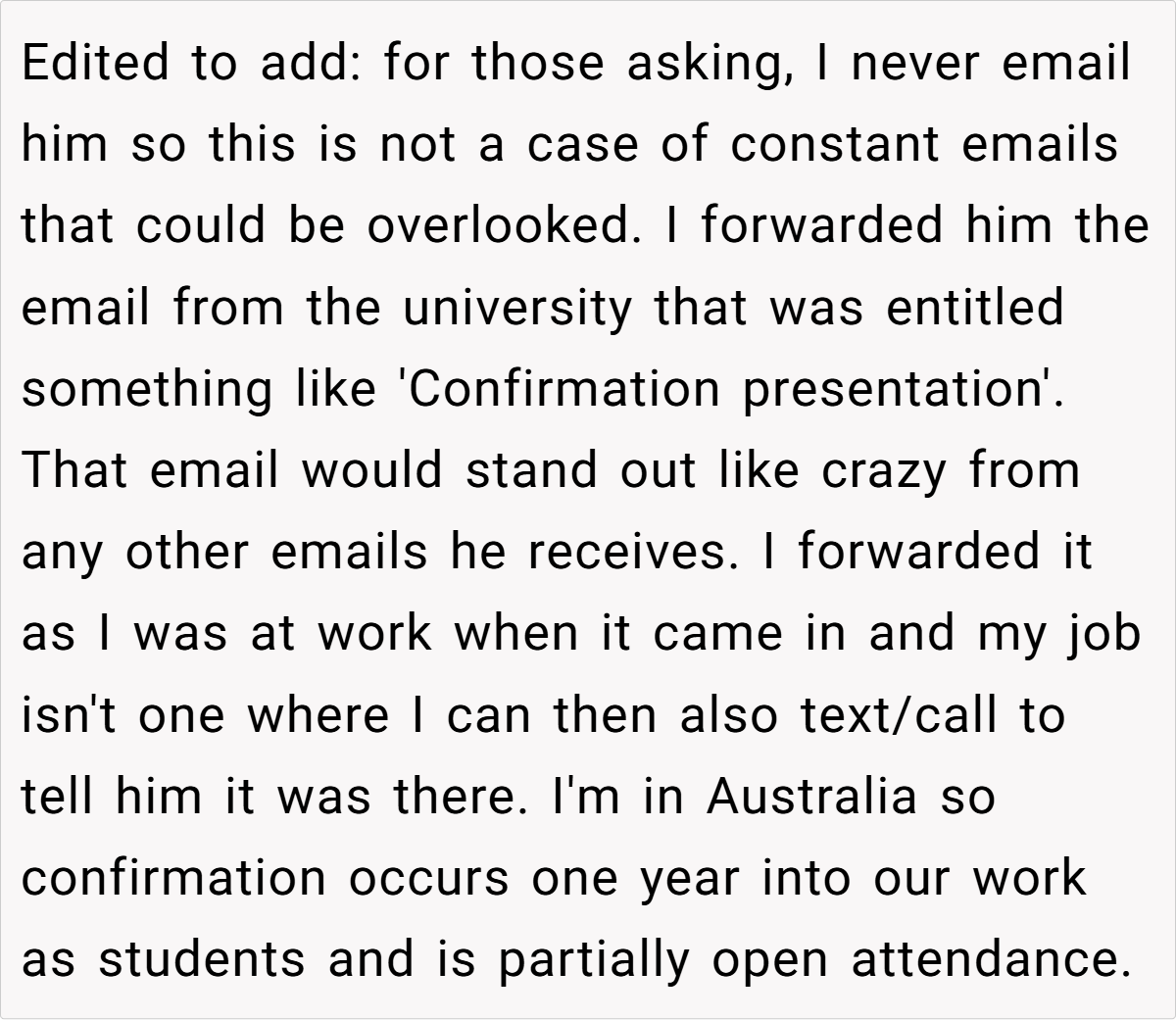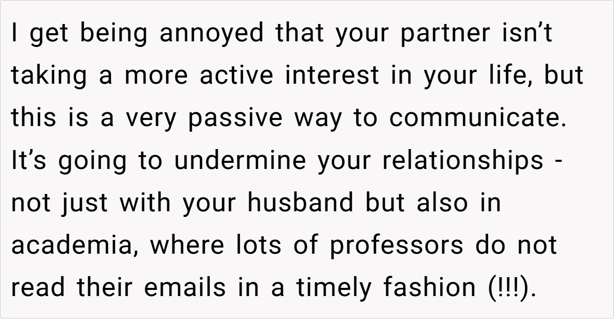 The situation here highlights a common communication gap. The redditor forwarded a crucial email and repeatedly asked her husband to read it, hoping he’d show genuine interest. Instead, his inaction underscored a pattern of neglect that goes beyond a single missed message. This disconnect not only amplifies the stress of academic responsibilities but also fuels feelings of isolation in a partnership that should ideally offer mutual support.