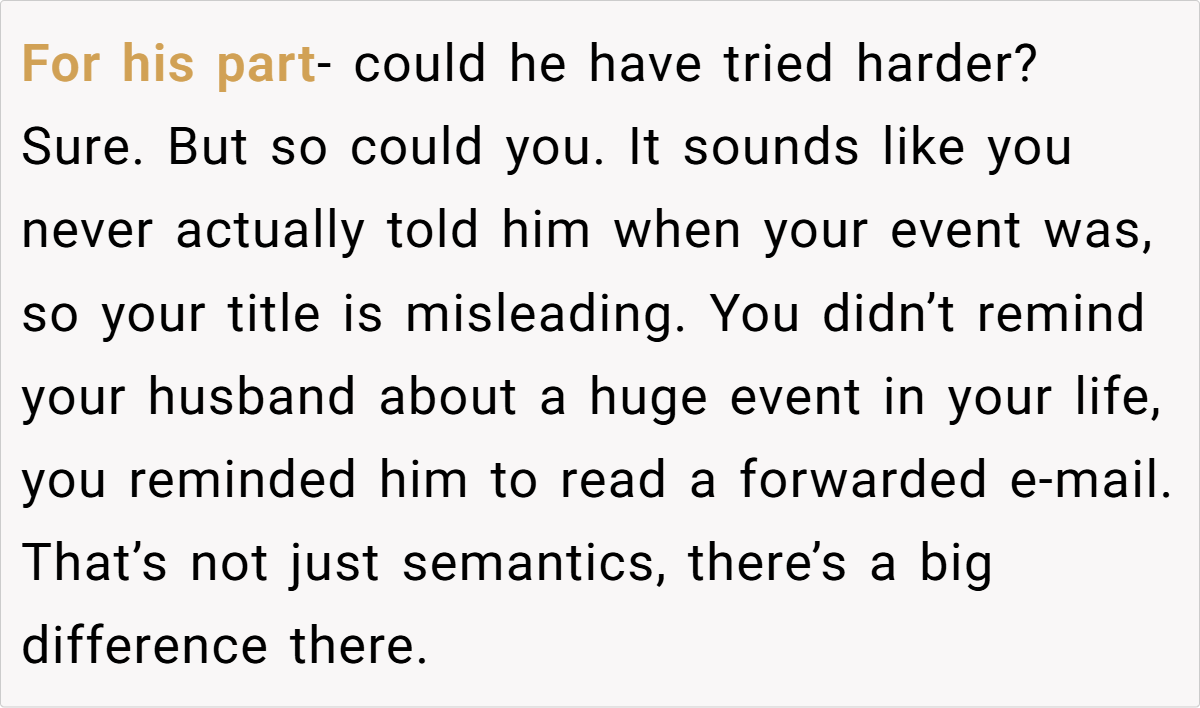Others suggested that clearer, more direct communication might have prevented the misunderstanding, noting that subtle hints often get lost amid busy schedules. Overall, while opinions varied, there was a general consensus that both partners should strive for open dialogue and mutual attentiveness, especially when it comes to celebrating life’s important milestones.