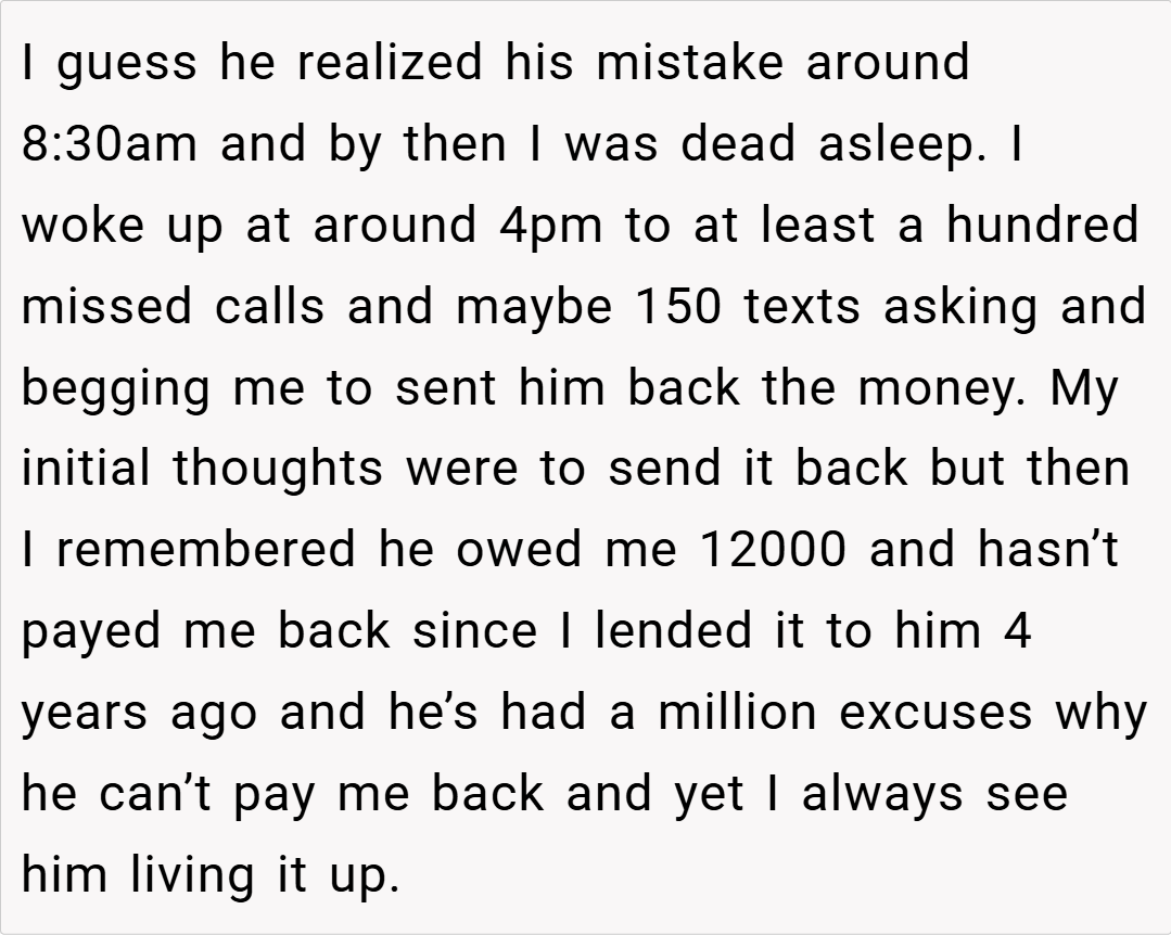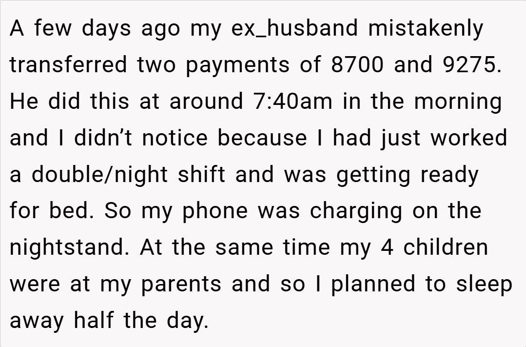 After her ex-husband mistakenly transferred two hefty payments into her account while she was sleeping off a double shift, she later remembered that he owed her a substantial sum from a loan given four years ago. Rather than returning the full amount, she decided to deduct his long-overdue debt before sending any money back.