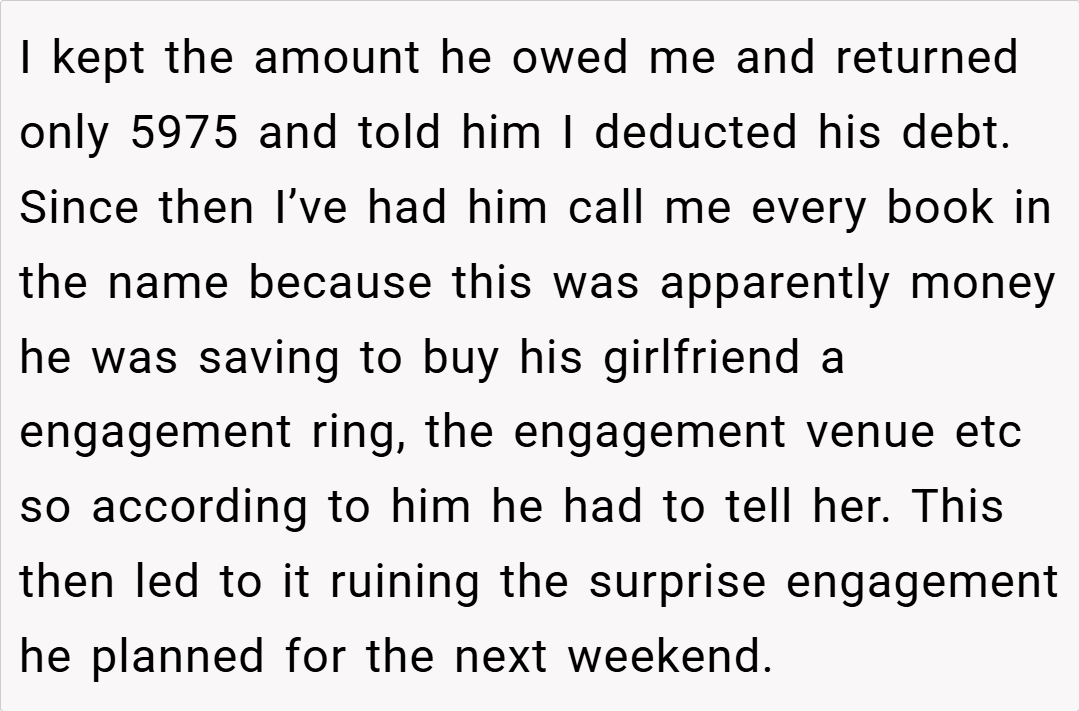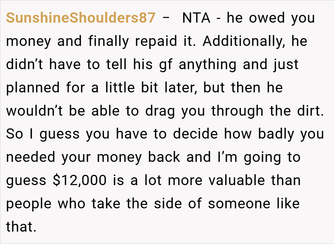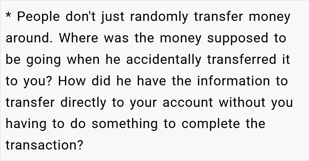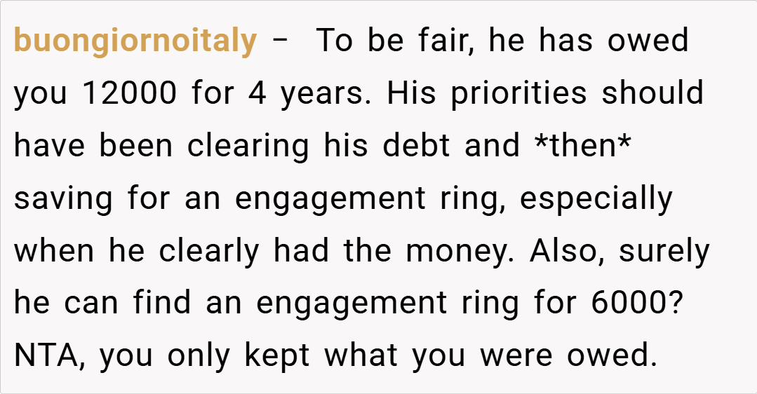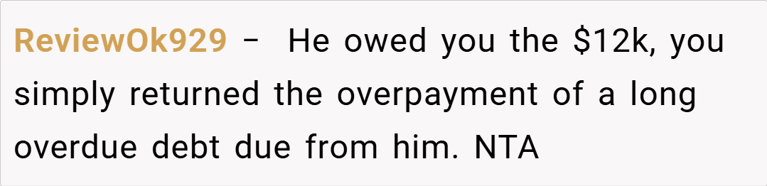Redditors largely rally behind her decision. Many emphasize that the debt had been pending for years and argue that deducting it from the mistakenly transferred amount is a fair move. Others point out the irony that he could afford to mistakenly transfer such large sums but somehow couldn’t pay back what he owed. The consensus seems to be that, while financial mistakes should be corrected, old debts shouldn’t be swept under the rug.