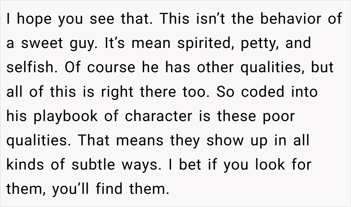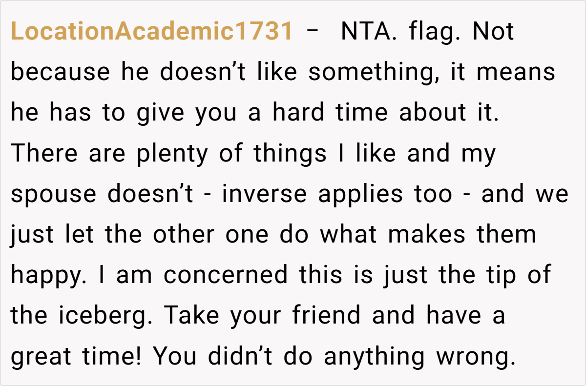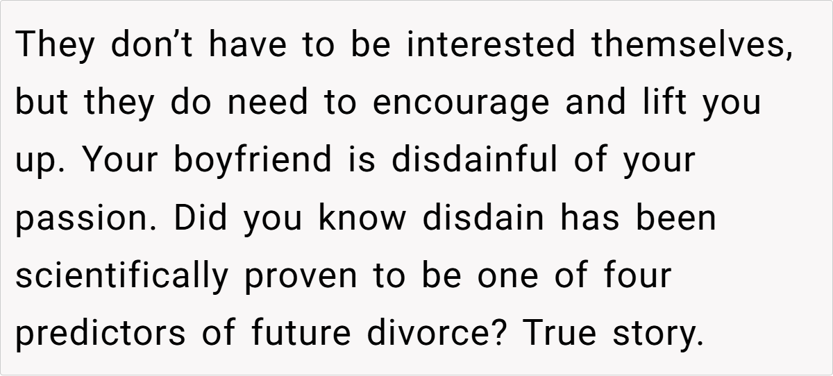 This insight is particularly resonant here. The OP’s boyfriend, by choosing to focus on negativity rather than celebrating shared moments, misses an opportunity to nurture the kind of friendship that forms the backbone of a resilient partnership. His behavior, juxtaposed with the OP’s genuine enthusiasm, highlights a stark imbalance—a reminder that mutual encouragement is key to conflict management and overall happiness.