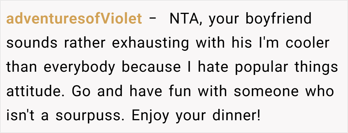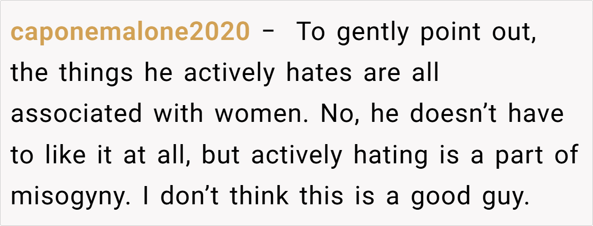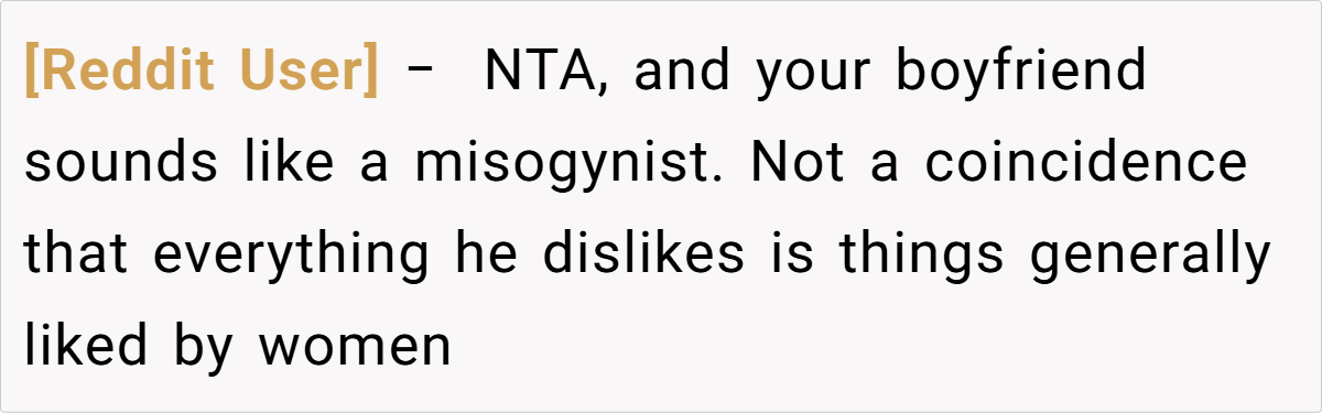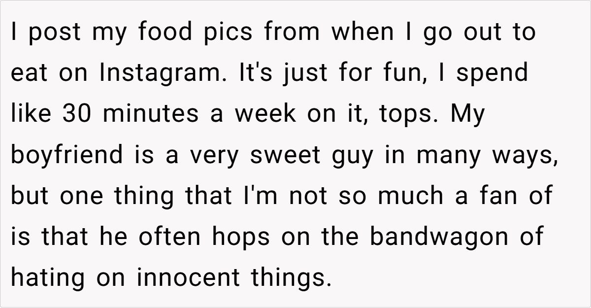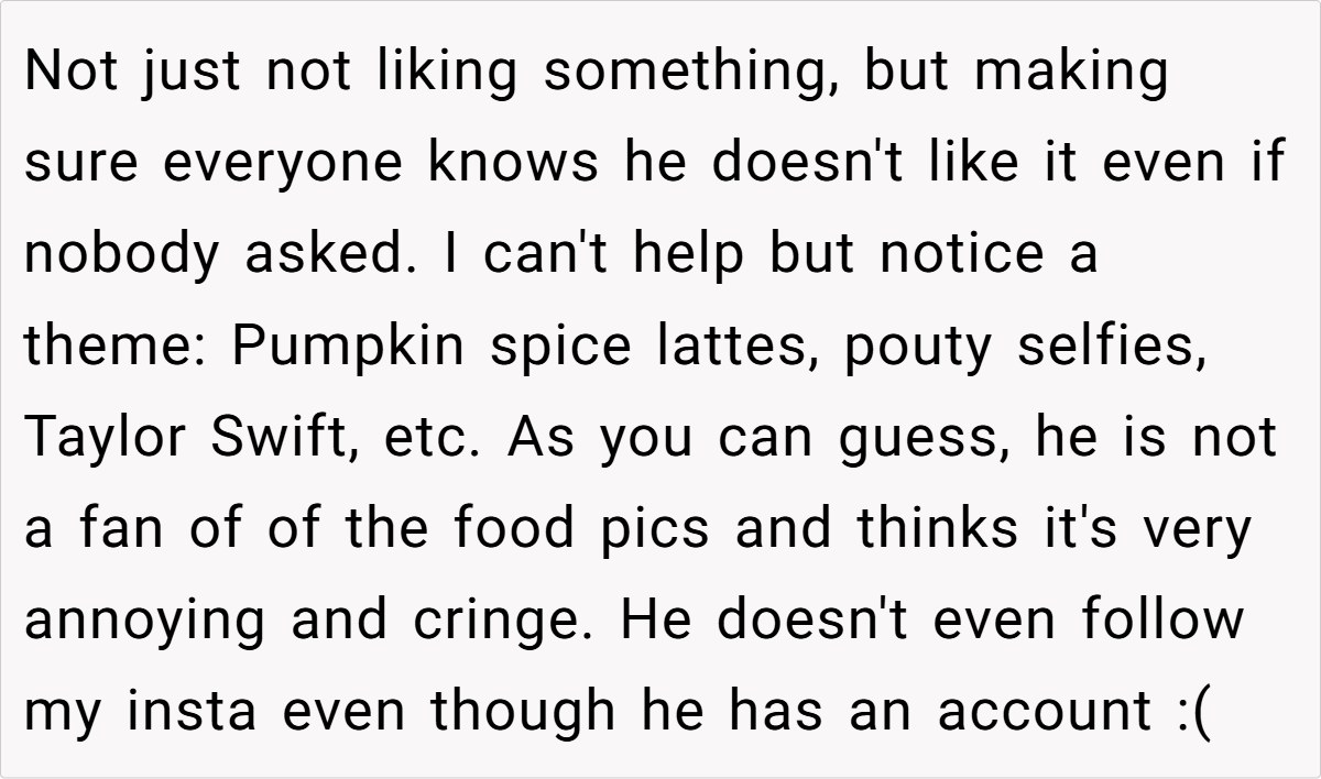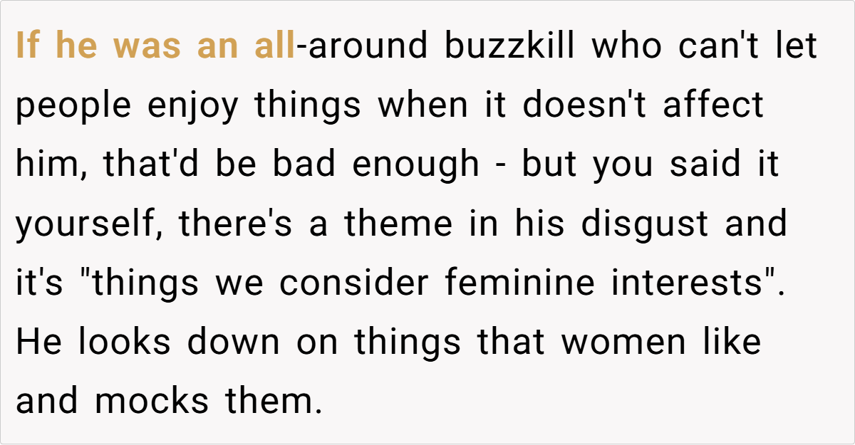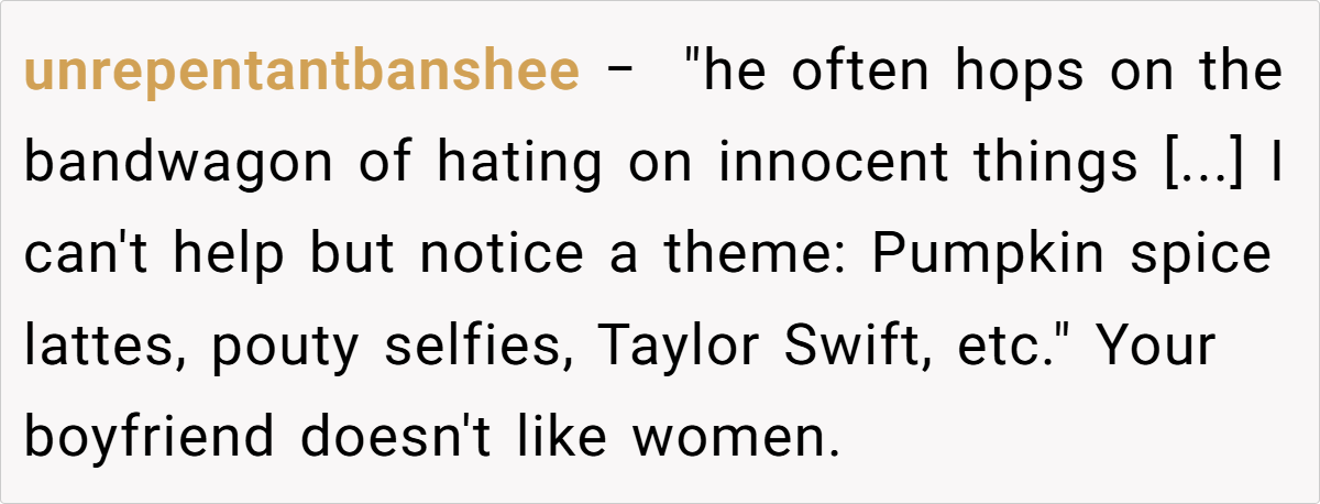 Analyzing the situation, the OP’s boyfriend appears to adopt a habitual stance of criticism, particularly targeting interests often associated with femininity. His repeated negative commentary, from dismissing food photos to deriding popular trends, signals more than just a difference of taste—it hints at deeper insecurities and, perhaps, an unspoken devaluation of his partner’s passions.