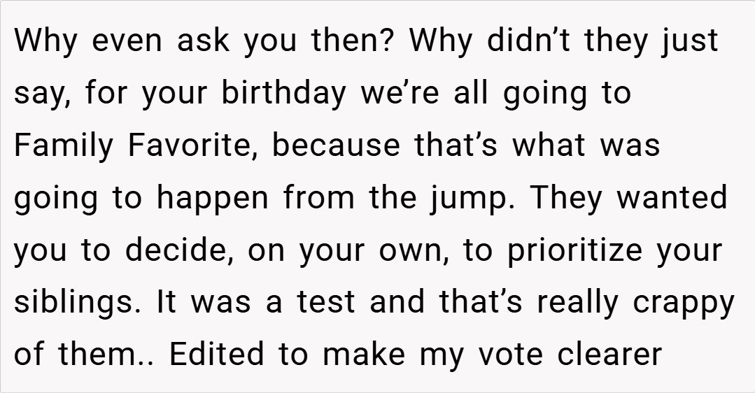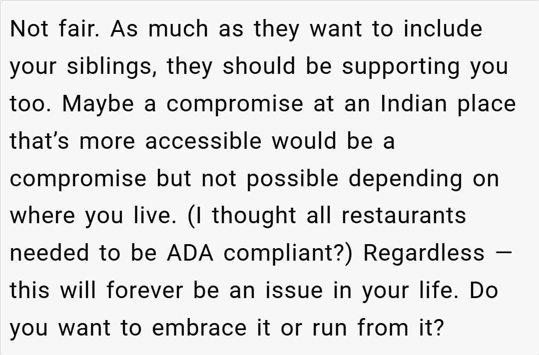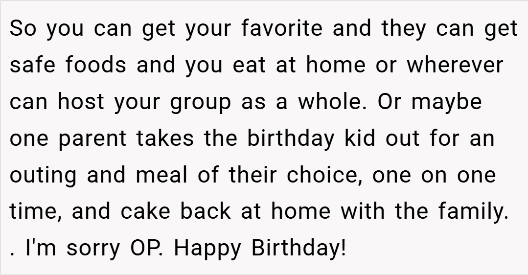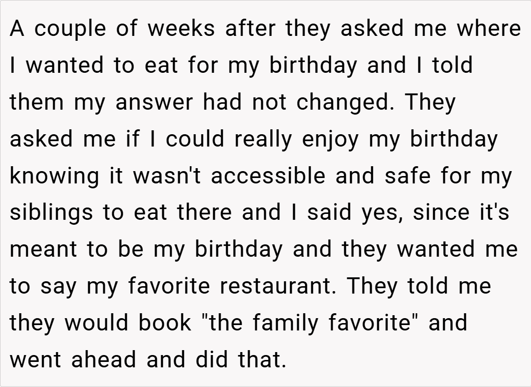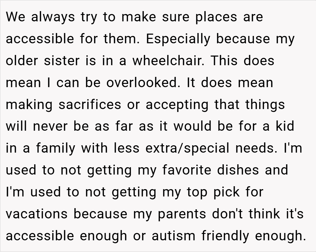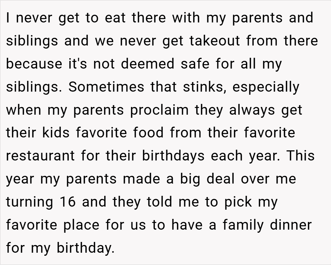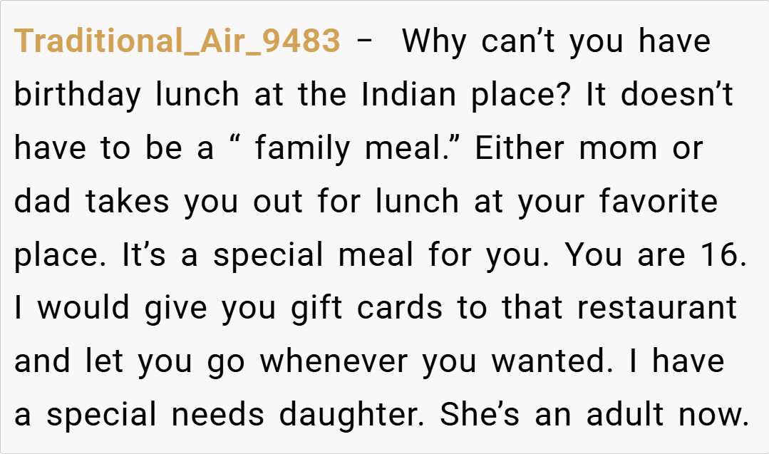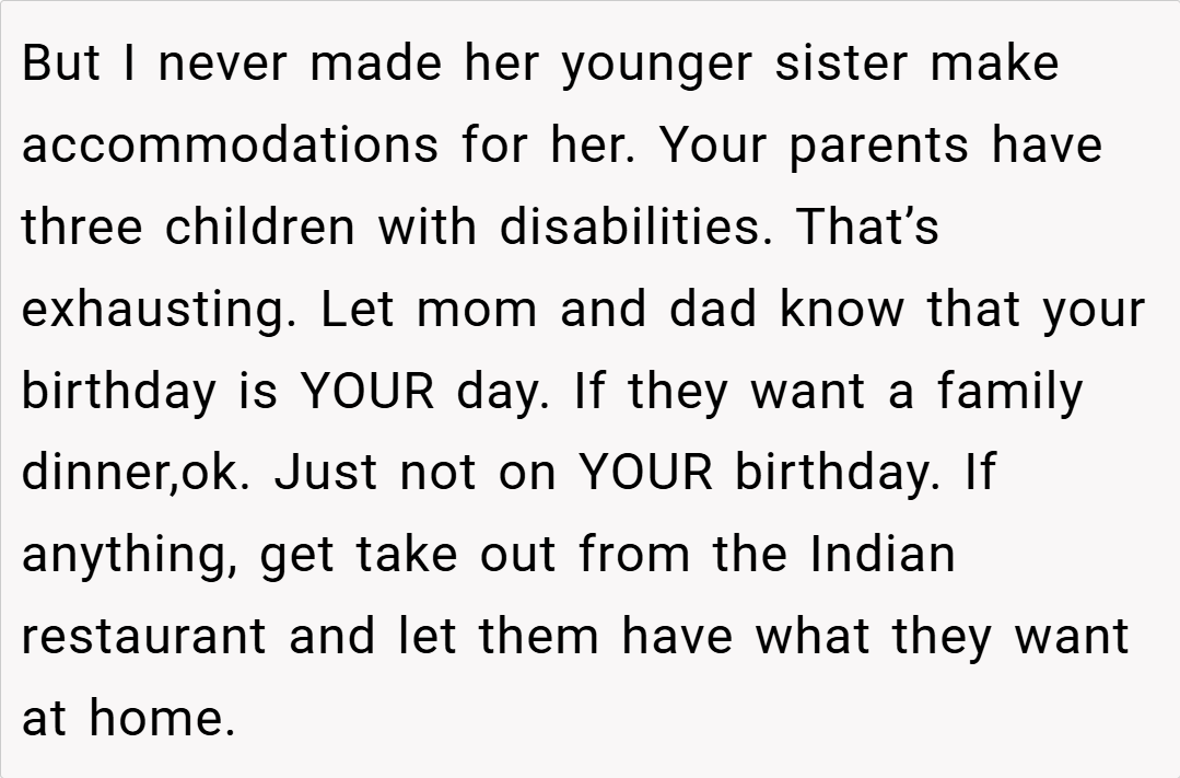 This story raises important questions about balance in families with special needs children. While accommodating medical and accessibility needs is crucial, finding ways to celebrate each child’s individuality matters too. What do you think about this situation? If you were this teen’s parent, how would you have handled the birthday dinner dilemma?