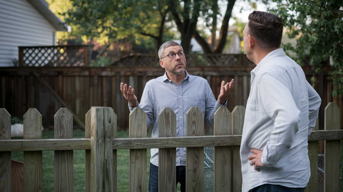 A backyard scene showing two neighbors near a shared wooden fence, one looking confused and the other assertive.