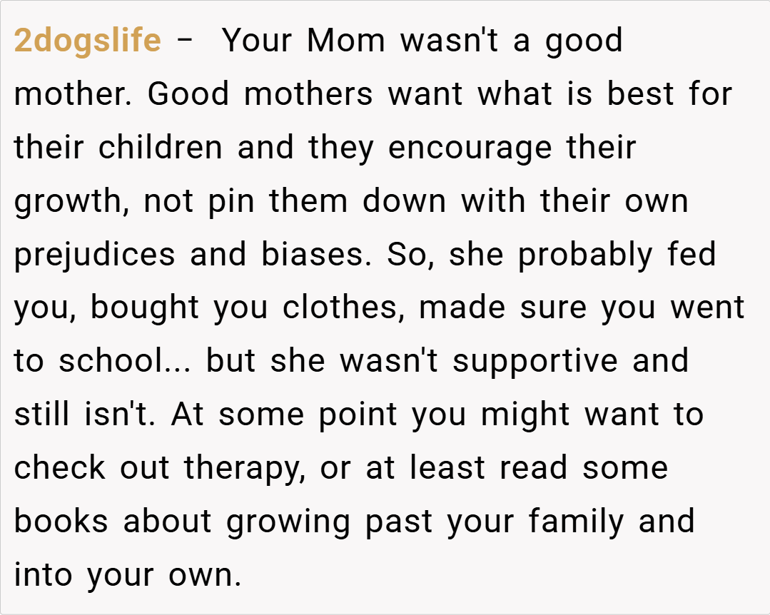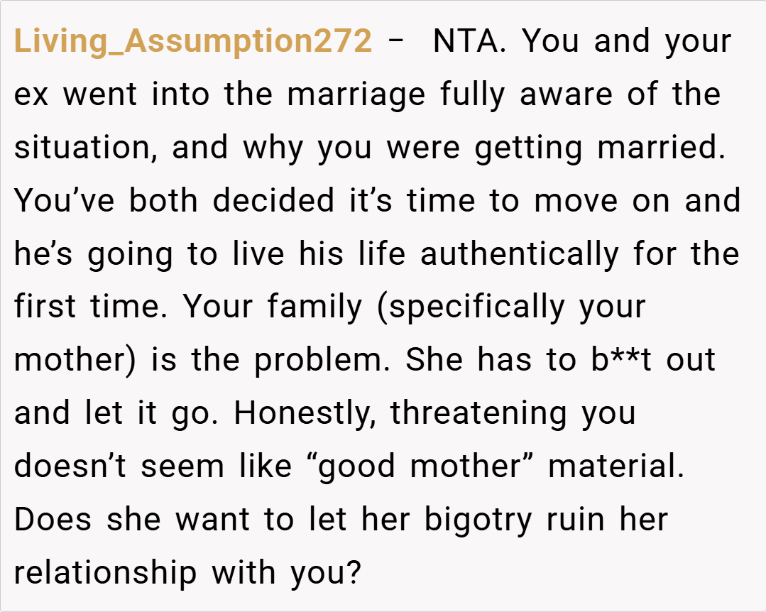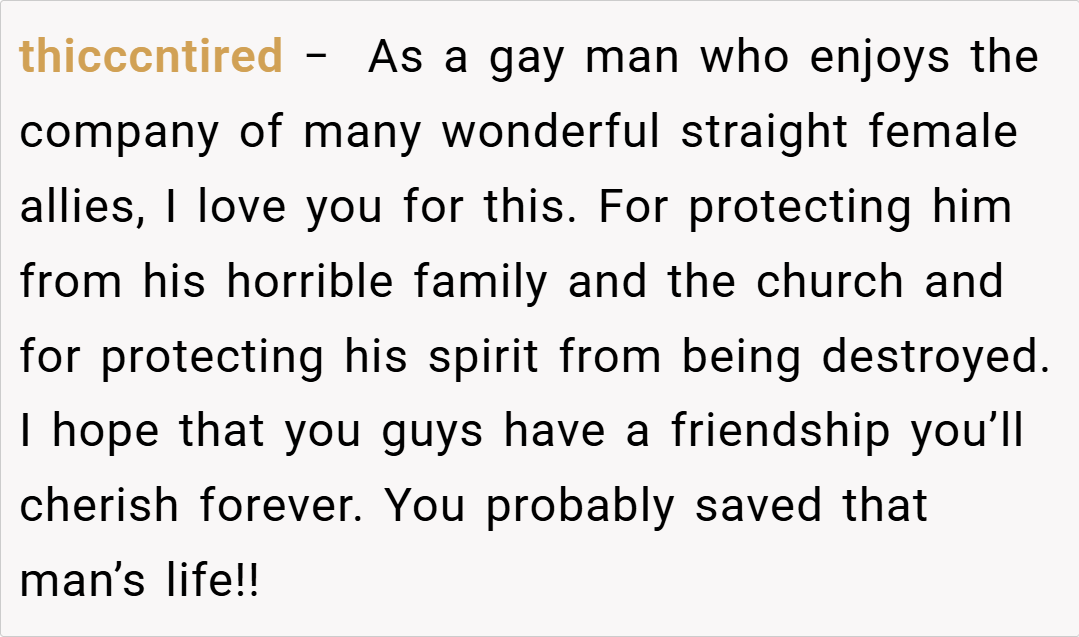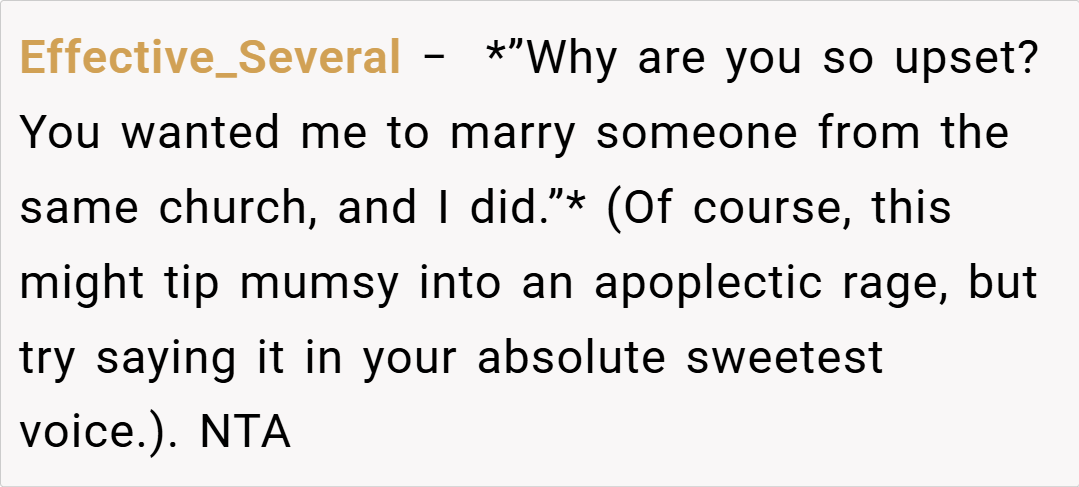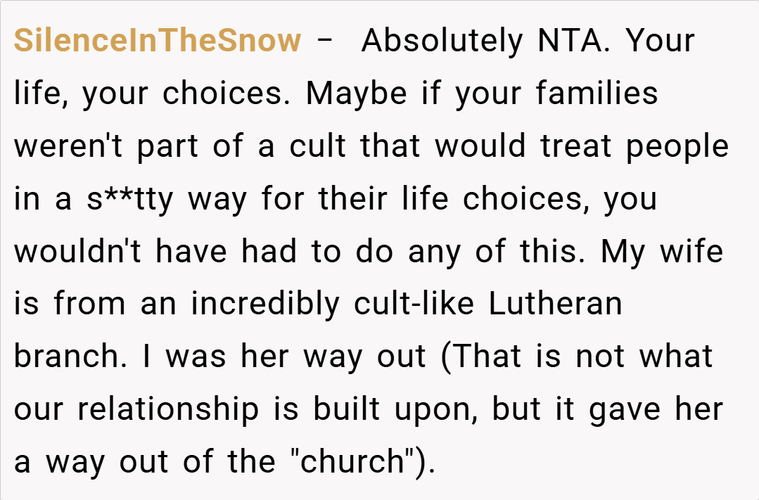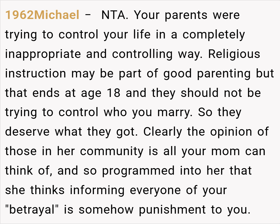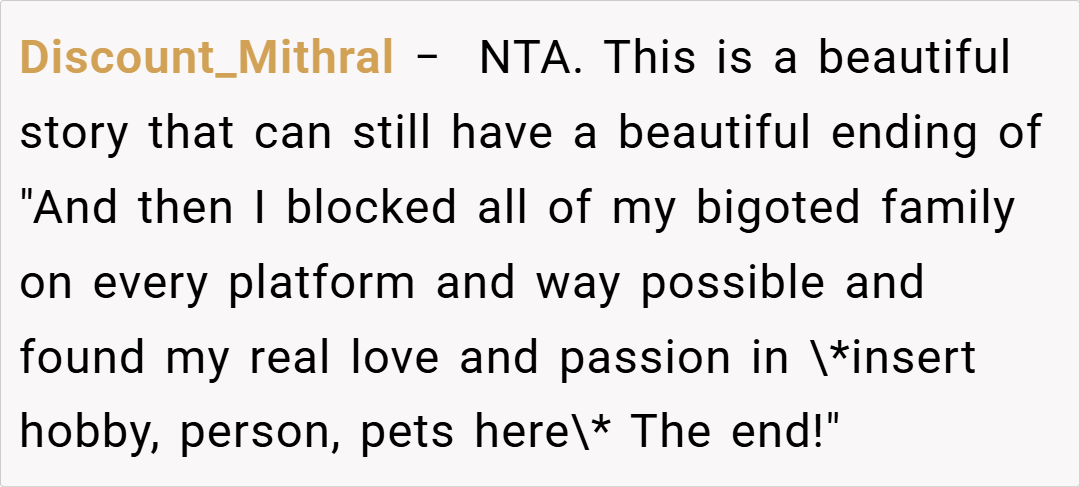 Here are some hot takes from the Reddit community – candid and humorous. The original comments provide a mix of sharp wit, unfiltered advice, and supportive insights. Many redditors applaud the clever escape from an oppressive situation while critiquing the theatrics with a touch of irony. They agree that the author’s boldness in challenging family expectations is both refreshing and necessary in today’s increasingly diverse society.