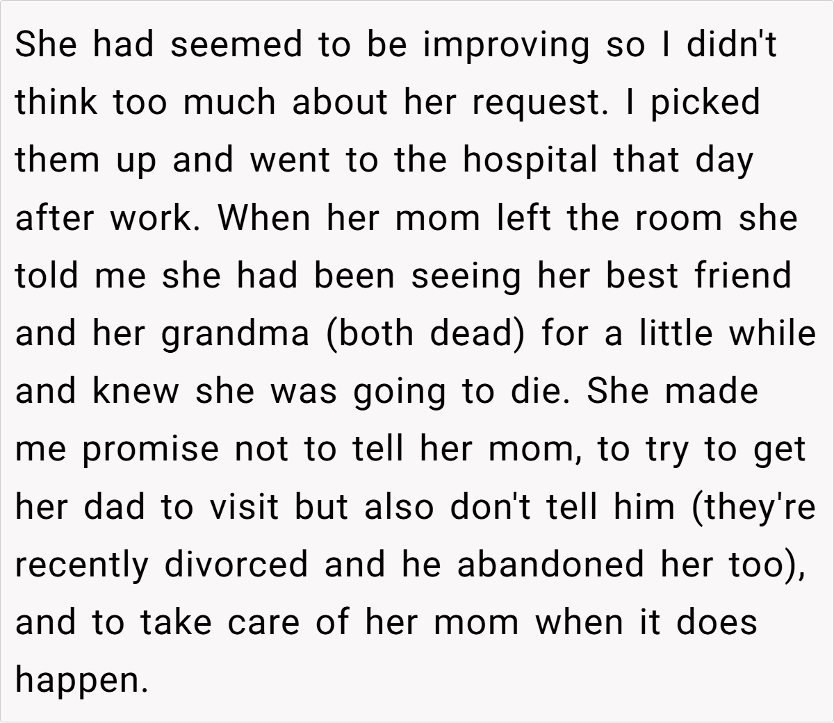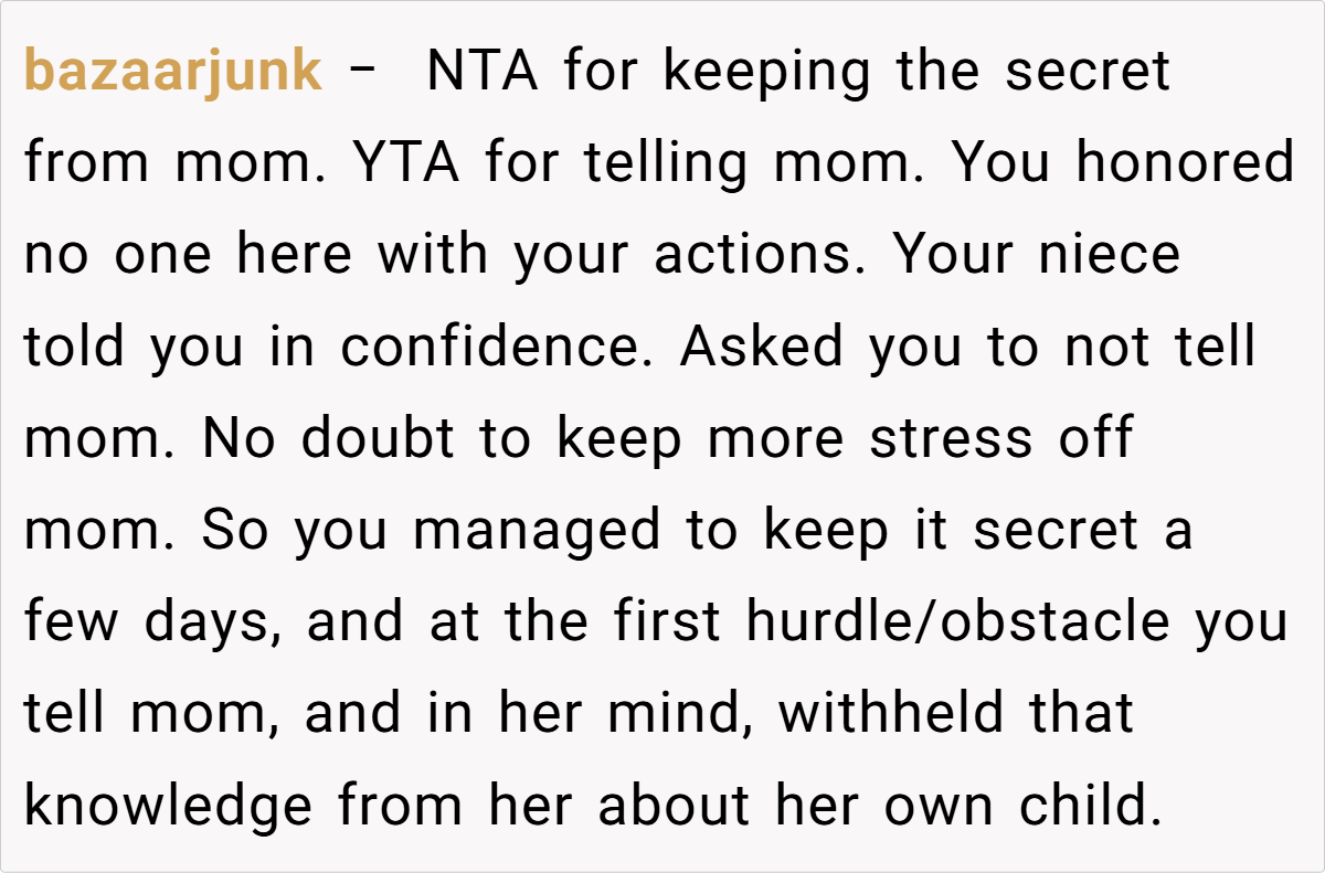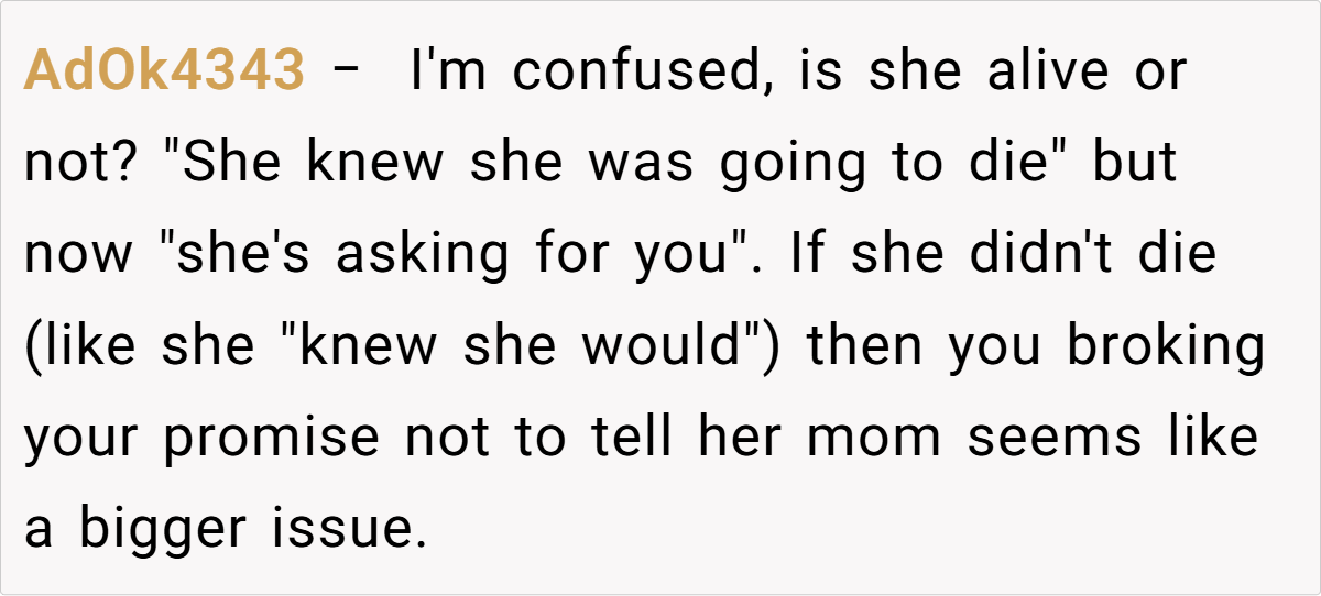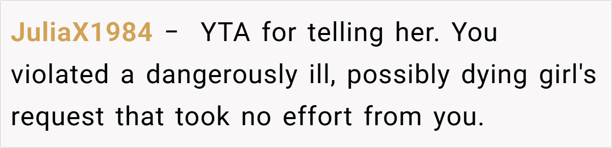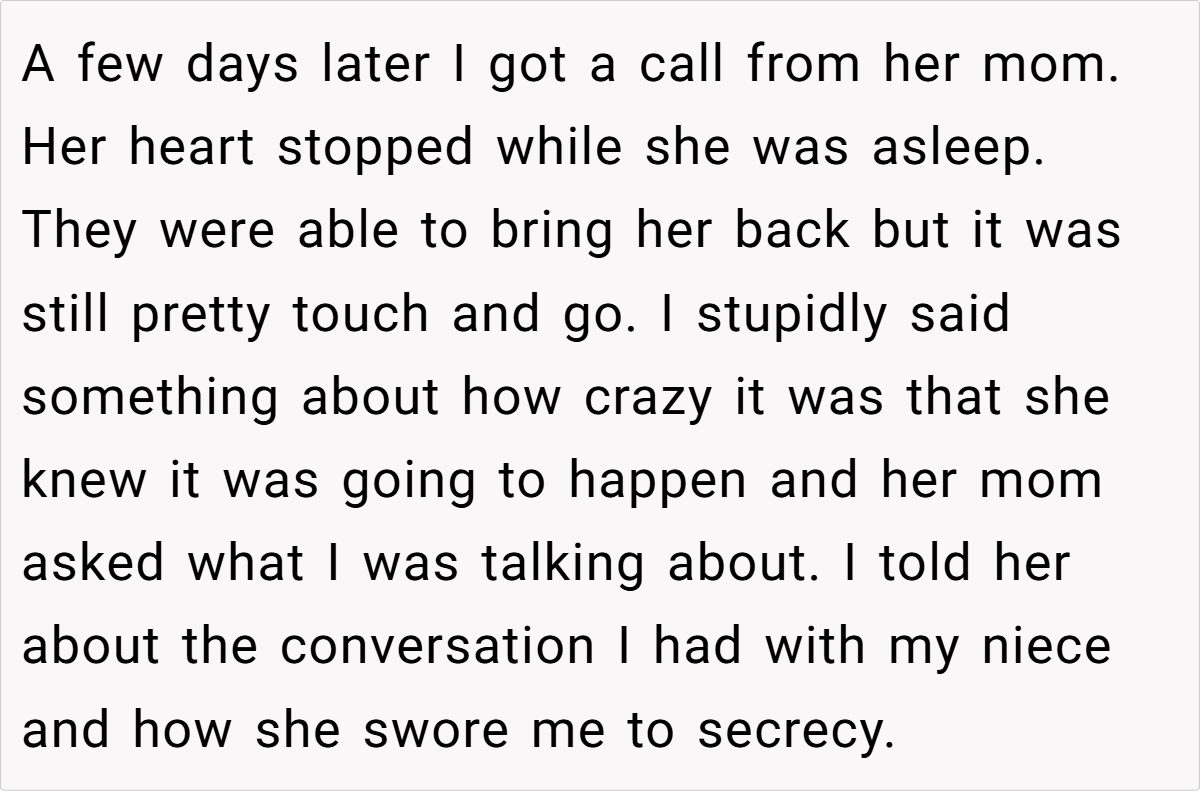 Letting a loved one share their deepest fears in confidence can feel like both a sacred trust and an unbearable burden. In this case, the 15‑year‑old niece confided her belief that she was nearing death, urging her relative to keep this secret from her mother. This delicate situation highlights the profound challenges of balancing respect for a minor’s autonomy with the duty to inform those directly affected by potential loss. When emotions run high in a hospital setting, every word and silence carries weight.