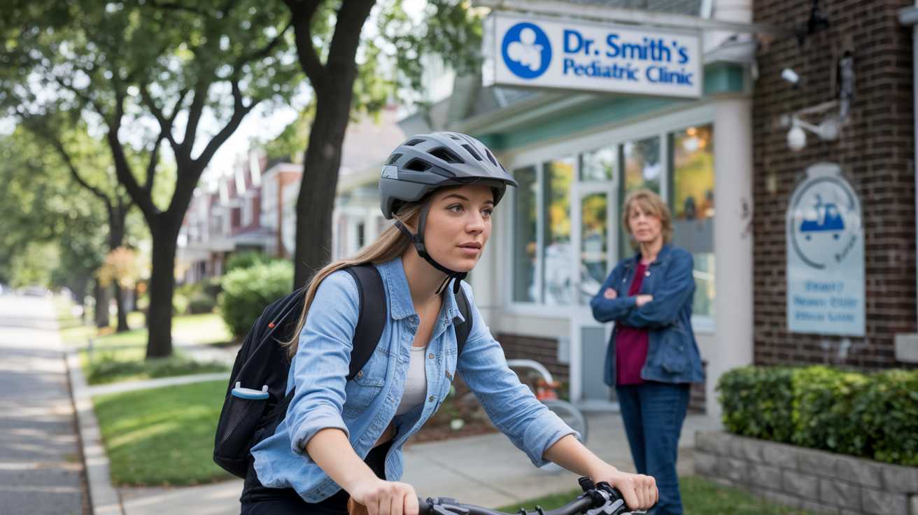 A 24-year-old woman who bikes to work at a pediatric psych clinic has been confronted by a client’s parent about not wearing a helmet, which the parent claims sets a bad example for the children.