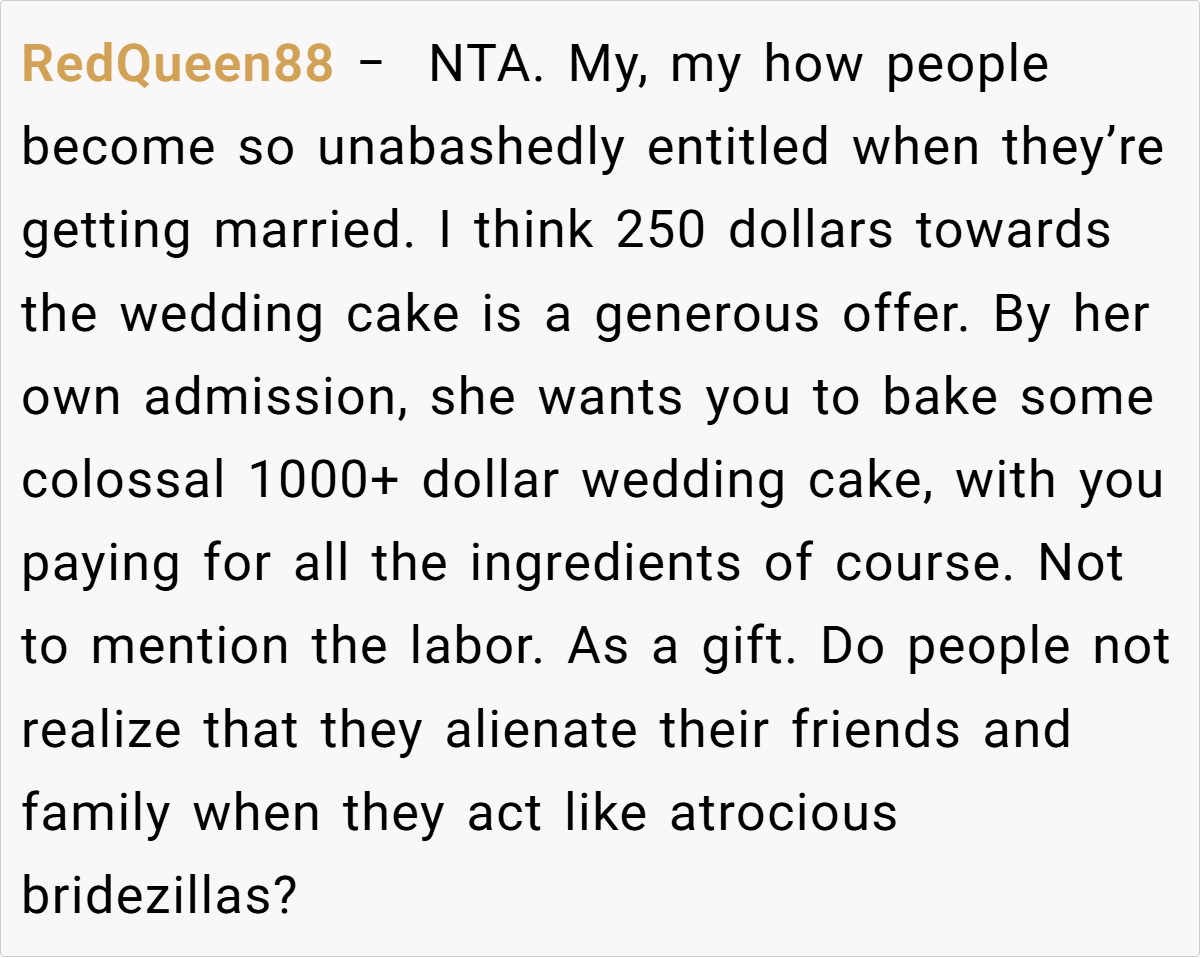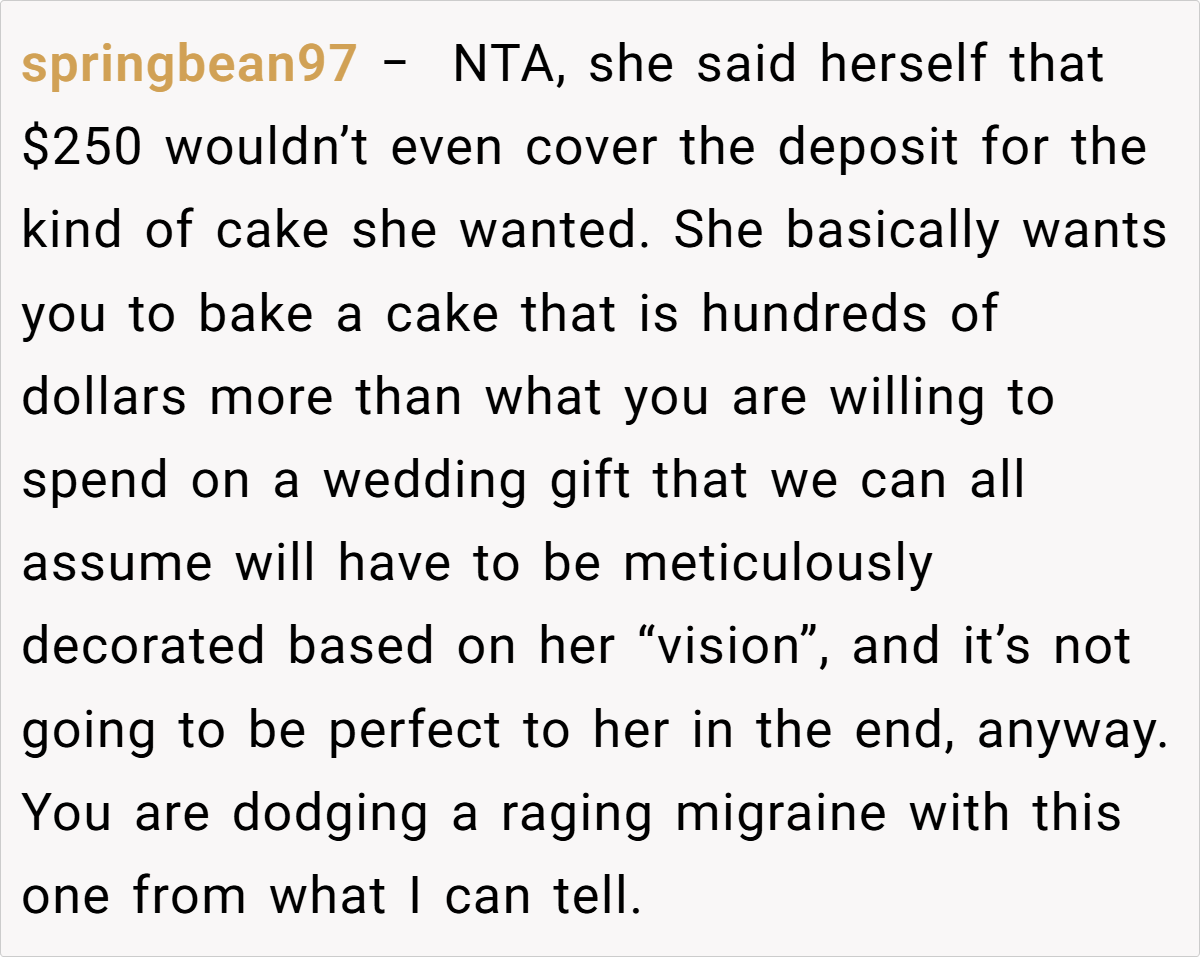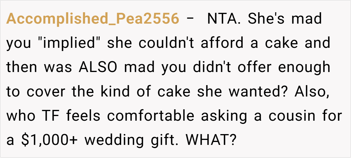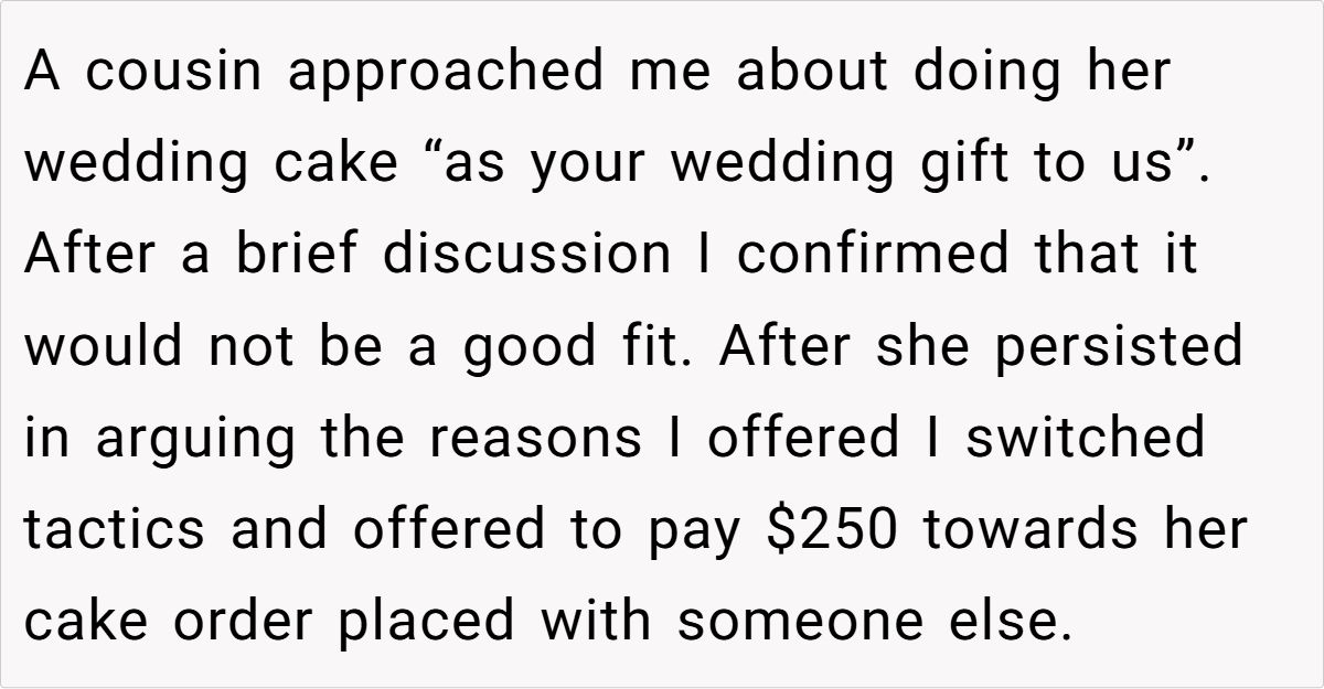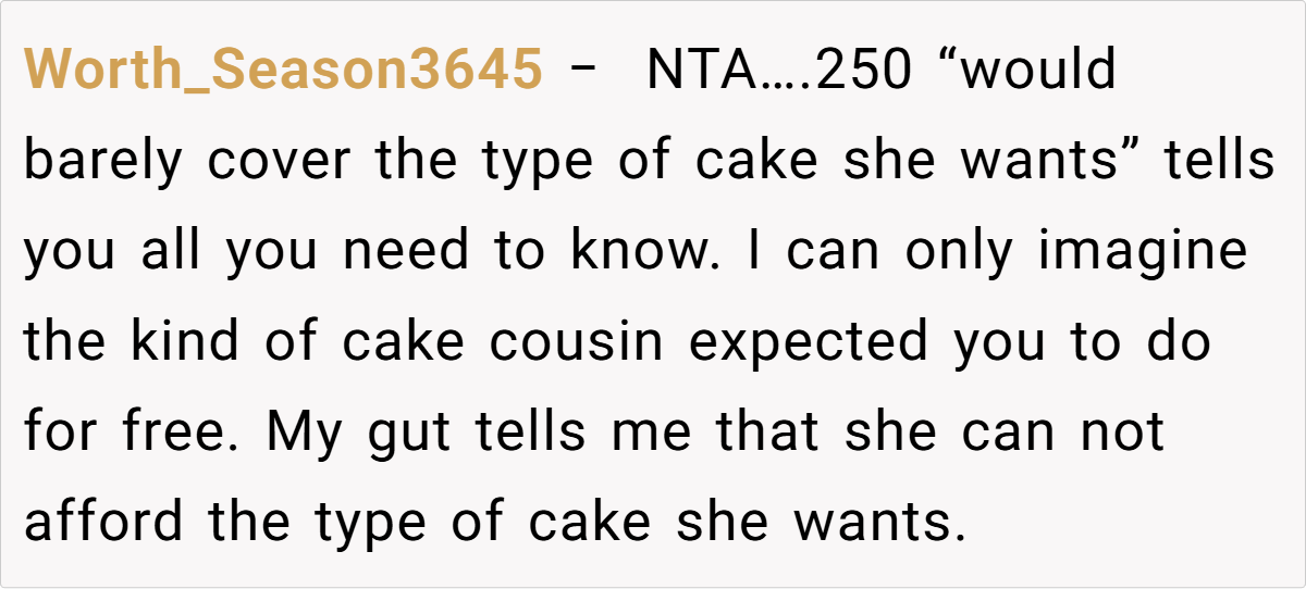 The Reddit community overwhelmingly supported the baker’s decision. Many commenters pointed out that her offer of $250 was not only reasonable but also a respectful way to honor her passion without compromising her enjoyment. They noted that expecting her to produce a wedding cake that far exceeds her budget and comfort zone was both impractical and unfair. The consensus? She’s NTA for setting and maintaining her boundaries, and her cousin’s reaction reveals an unbalanced sense of entitlement.